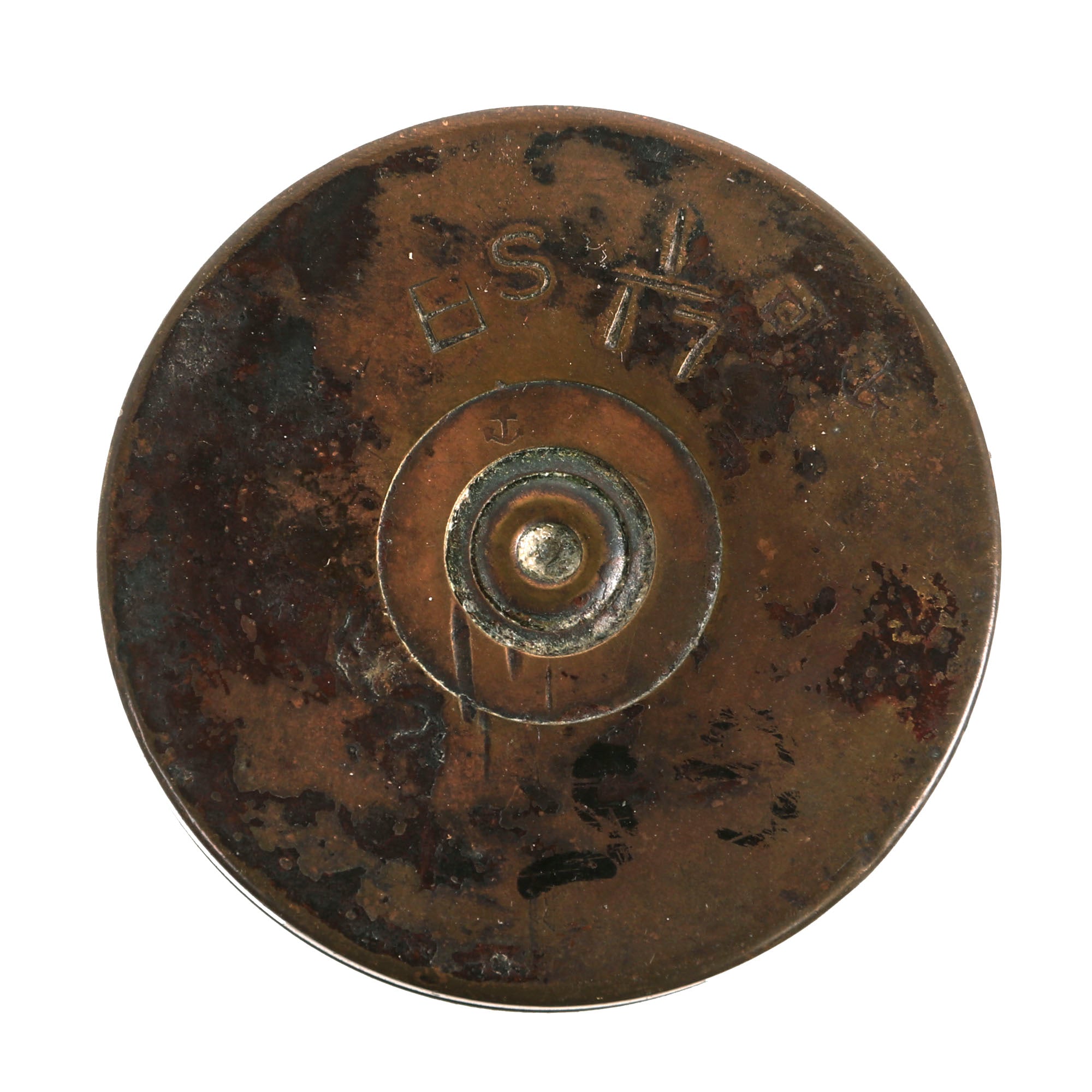 This example has a central explosives cavity and a fuse that still unscrews, identifying this as a High Explosive round. There is no cavity on the base of the round, so it is not a tracer round, however none of the original color remains on the body, so we cannot tell if it is high explosive, or high explosive incendiary. It measures approximately 9” in length with a 1 ⅝” base. The round is complete (minus explosive content) and comes with the original removable fuze on the end. There are Japanese markings on both the fuze and on the base of the casing.