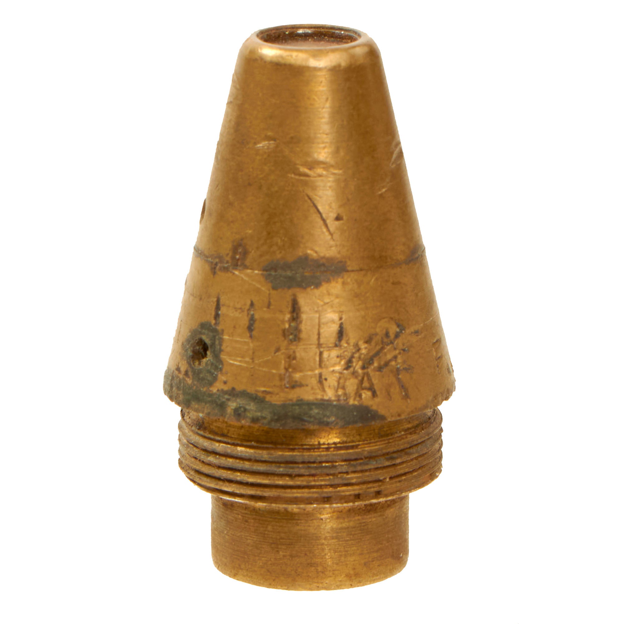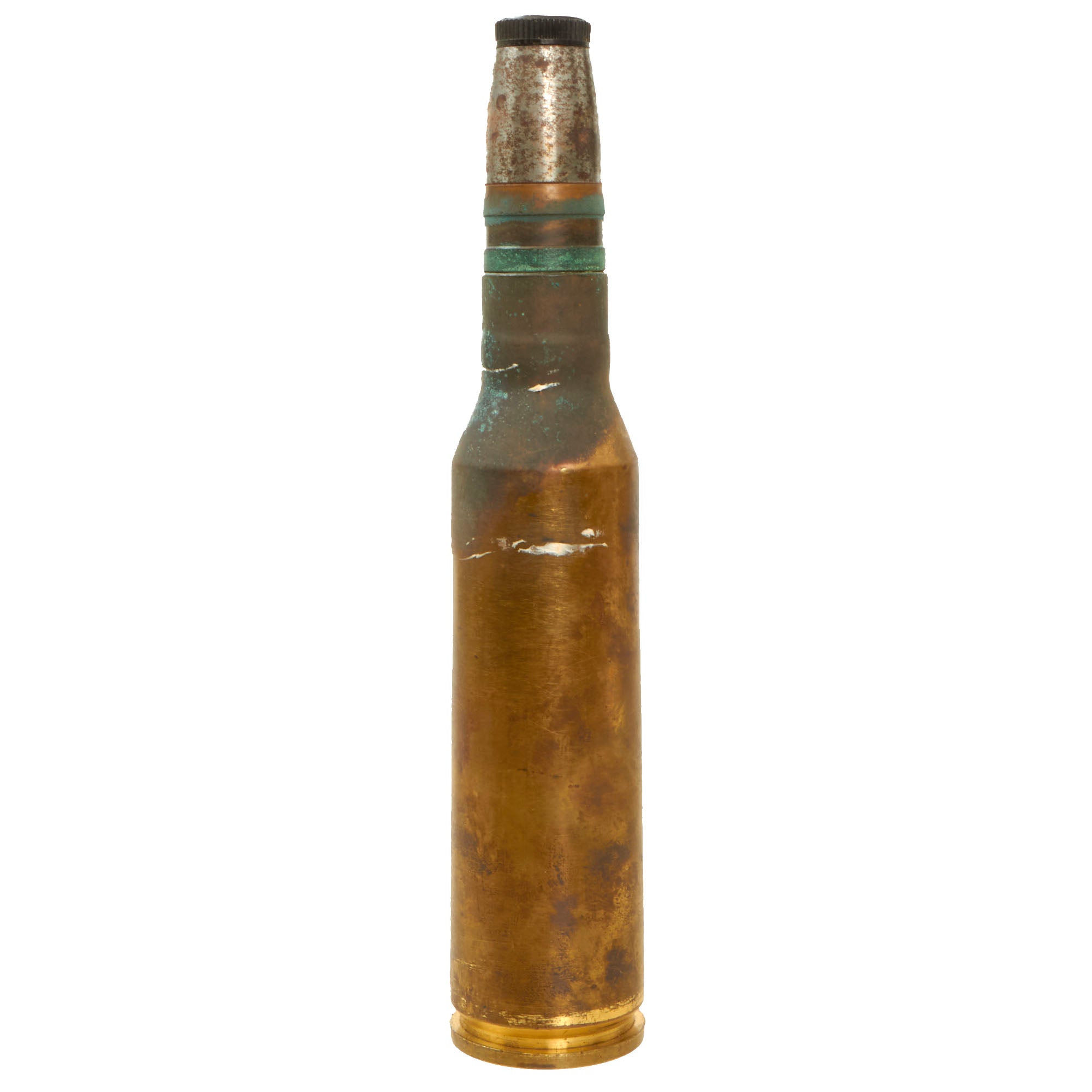 This example has both the original fuse and transit plug. It has a central explosives cavity and a fuse that still unscrews, identifying this as a High Explosive round. There is no cavity on the base of the round, so it is not a tracer round, however none of the original color remains on the body, so we cannot tell if it is high explosive, or high explosive incendiary. It measures approximately 9” in length with a 1 ⅝” base. The round is complete (minus explosive content) and comes with the original removable fuze on the end and transit fuse. There are no markings anywhere on the round besides on the top of the transit plug and on the base.