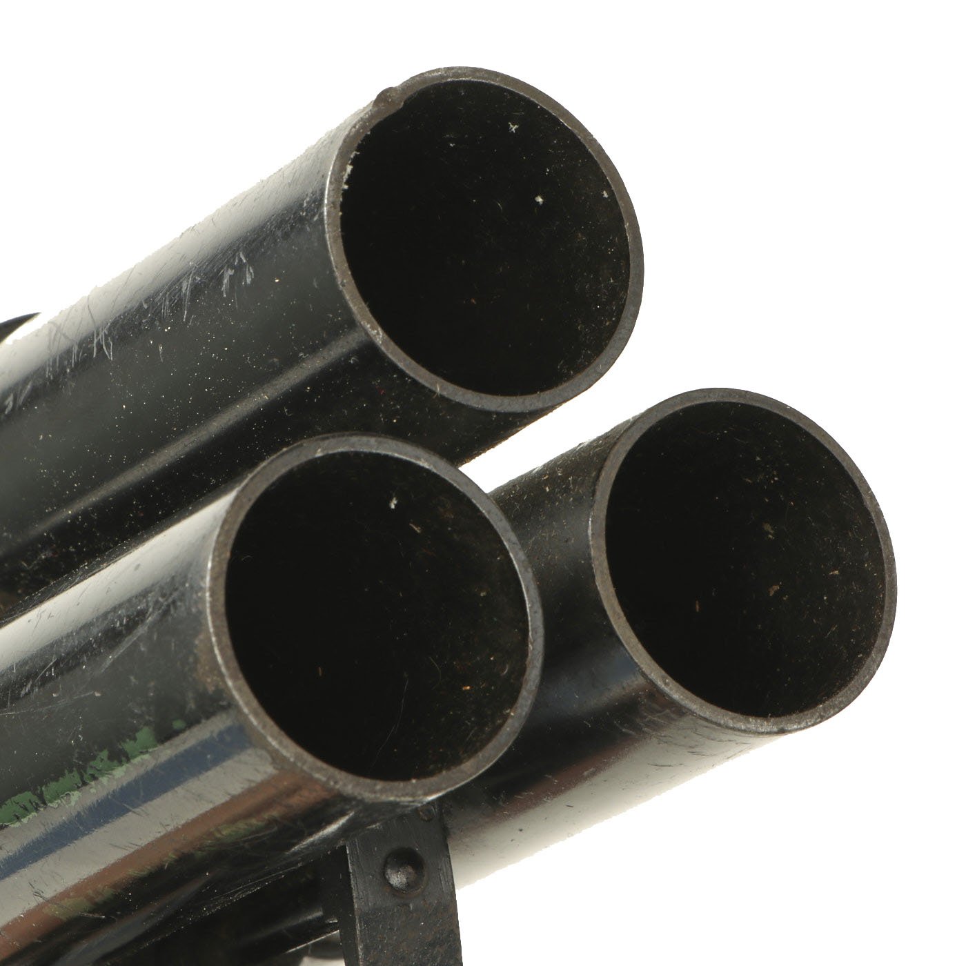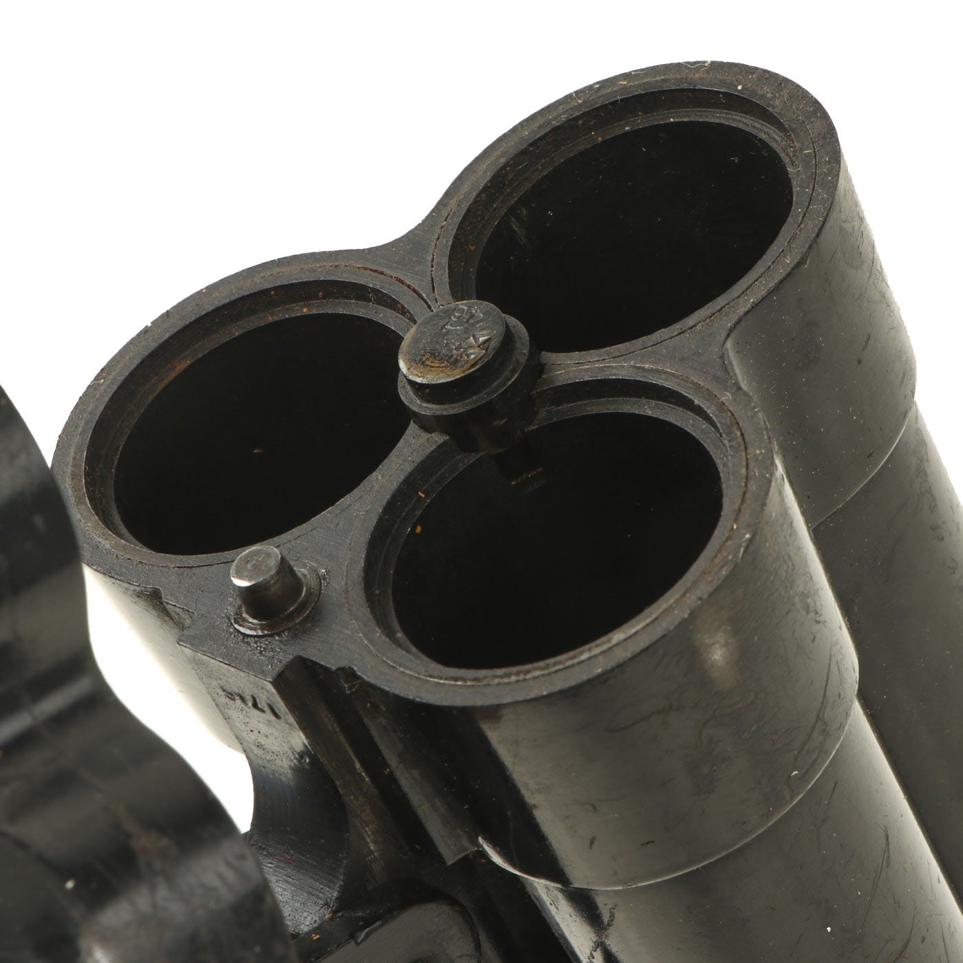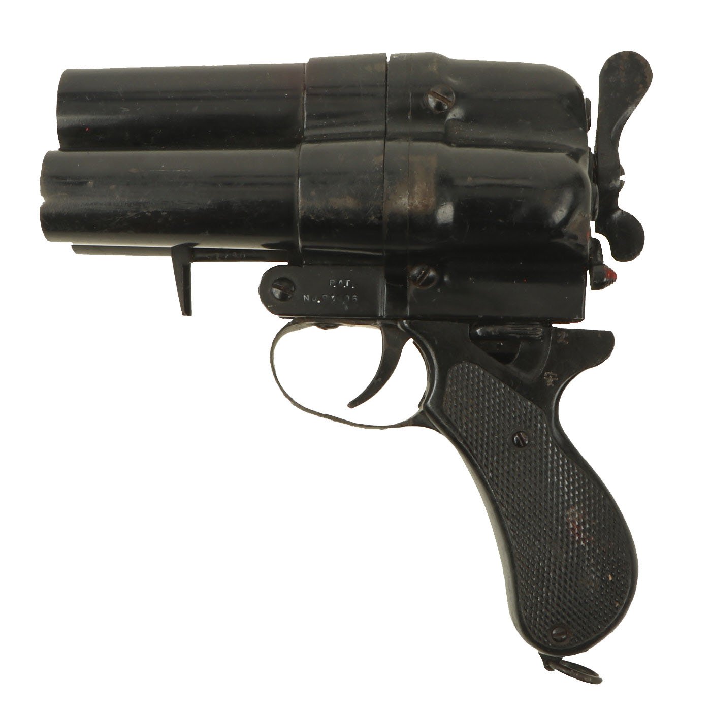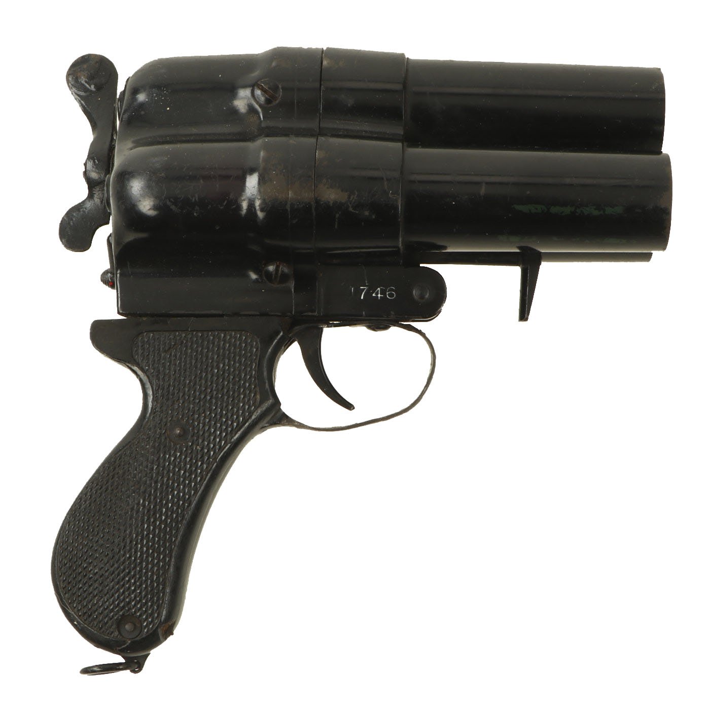 The 26.5mm barrels are each 3" in length, the pistol 7" in overall length and because of its large grip 8" tall. The pistol is really in good shape, and may have been arsenal re-finished during the war. There is a bit of green paint on one barrel, which looks to be the remnants of the color marking for that barrels. These pistols were usually loaded with several different types of flares, so that the appropriate color would always be at the ready.