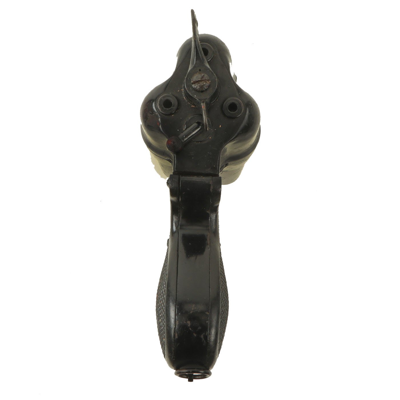The bakelite grip panels are in very good condition, with some small cracks and cihps in places. The pistol breaks open, cocks, and dry fires correctly, with all three barrels able to hold cock and dry fire based on where the selector is set. There is a just a bit of wobble in the grip, due to a lose securing bolt under the grip scales.