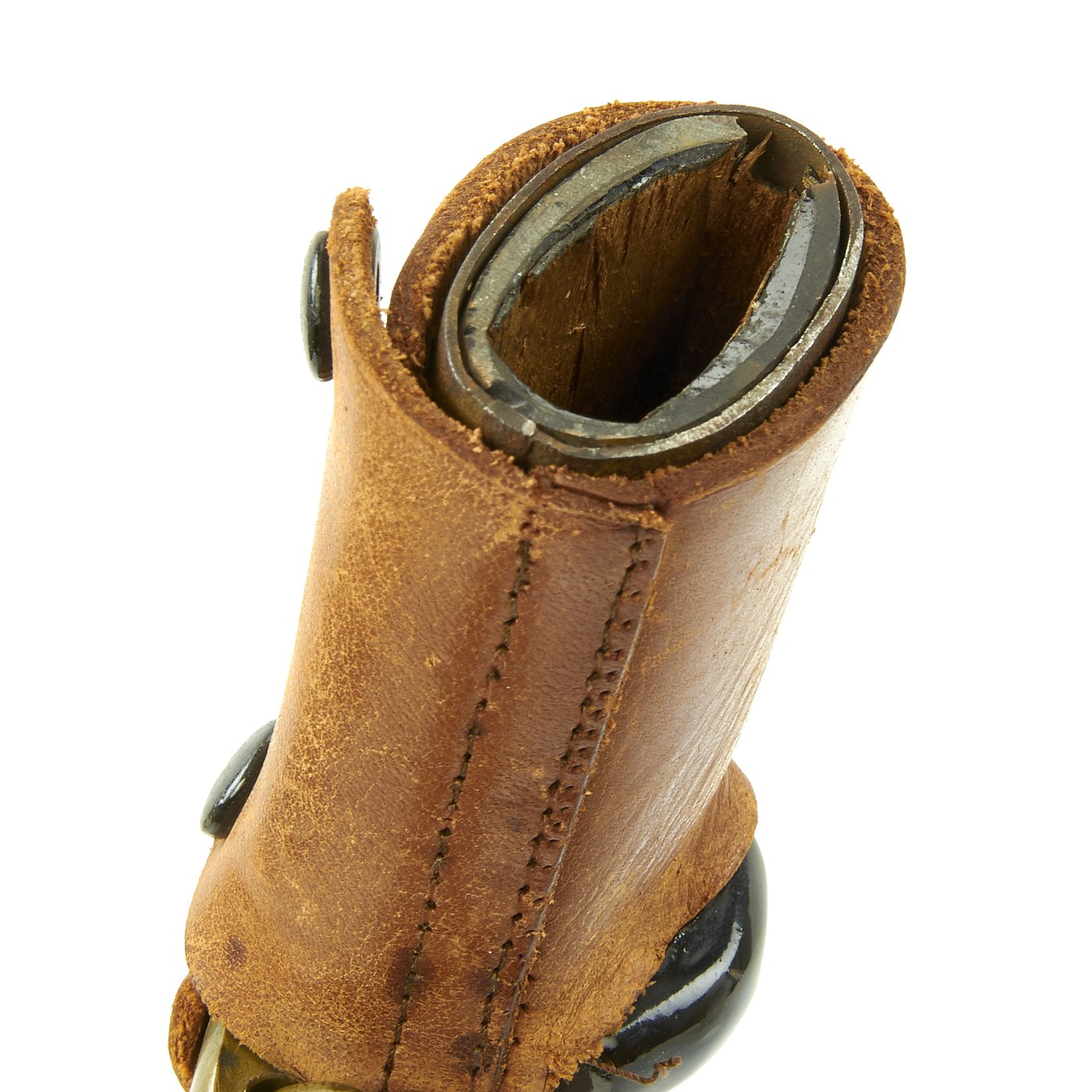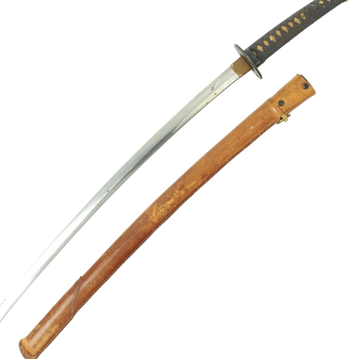 The Scabbard (saya) is wood, but it has a steel end fitting in the 20th century military style. The scabbard is covered in the standard leather field cover used during WWII, but is black lacquer underneath, a relatively common type of finish for scabbards of the period. It had a brass hanger added below the Kurikata where a sageo would be attached. The scabbard cover is a nice tan leather color, with some wear, and one of the snaps is broken.