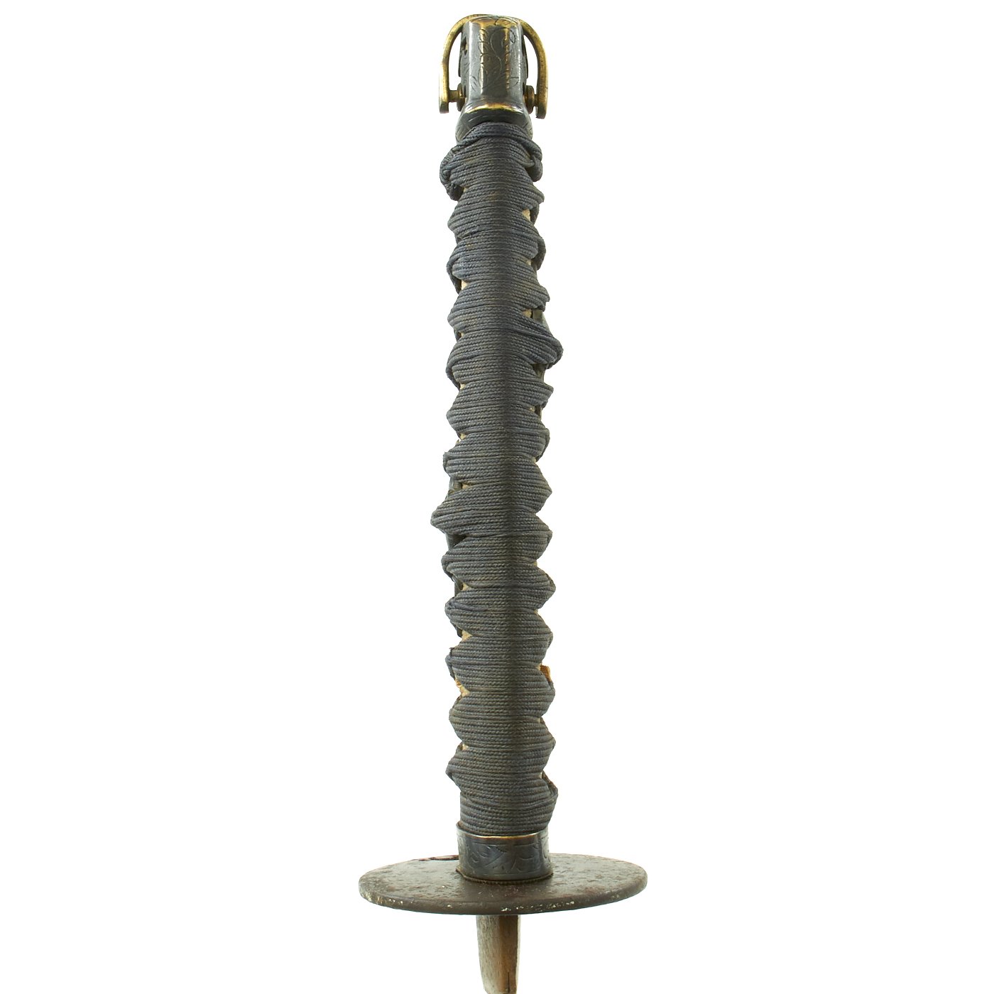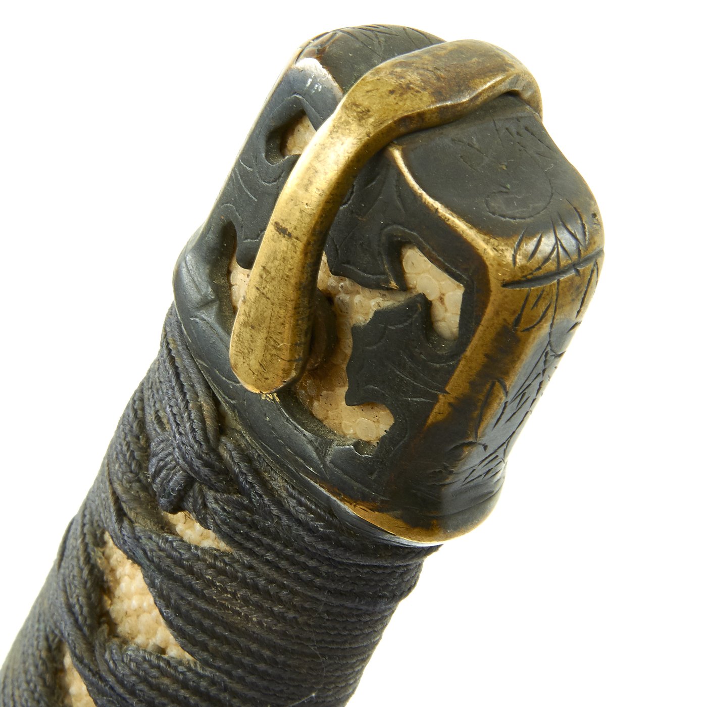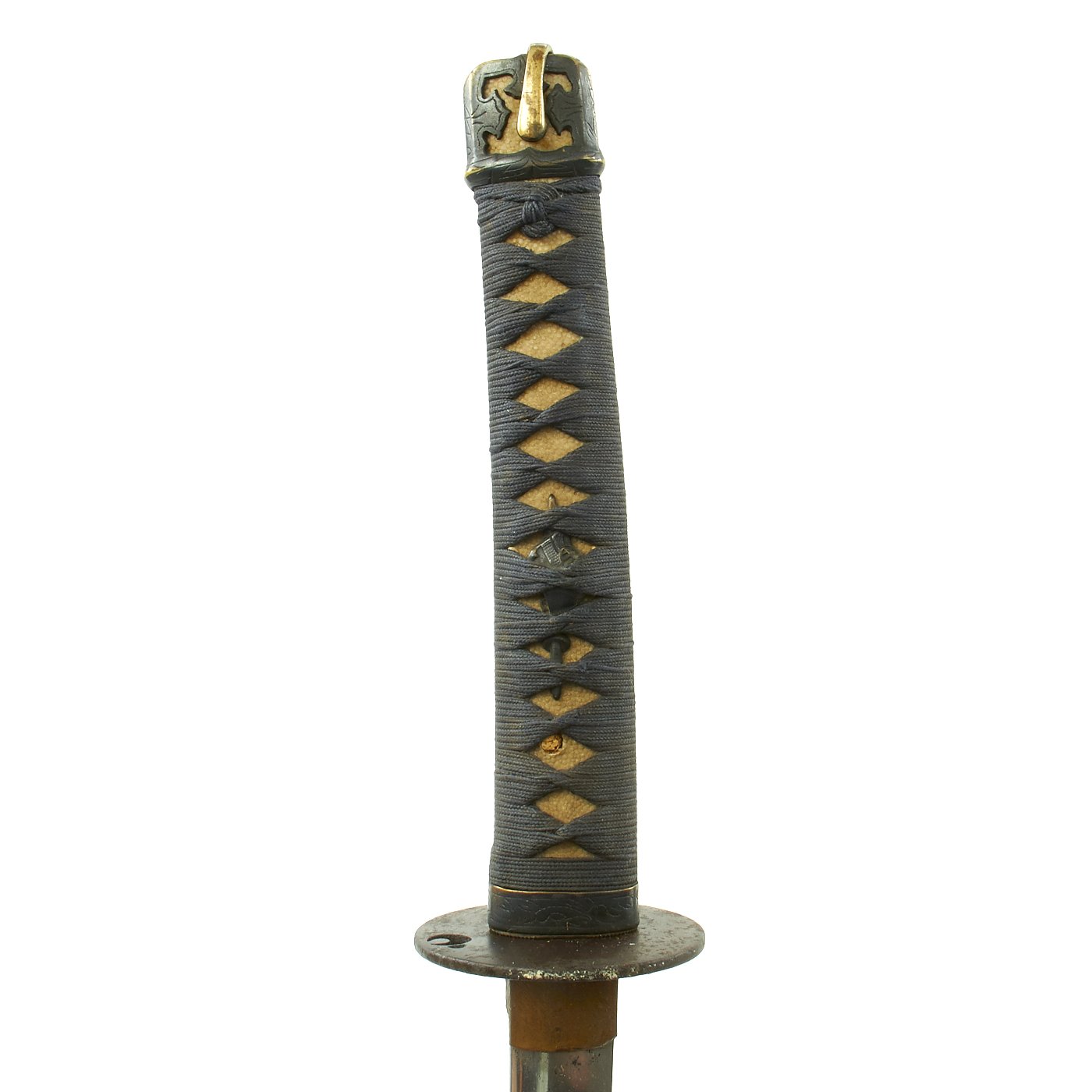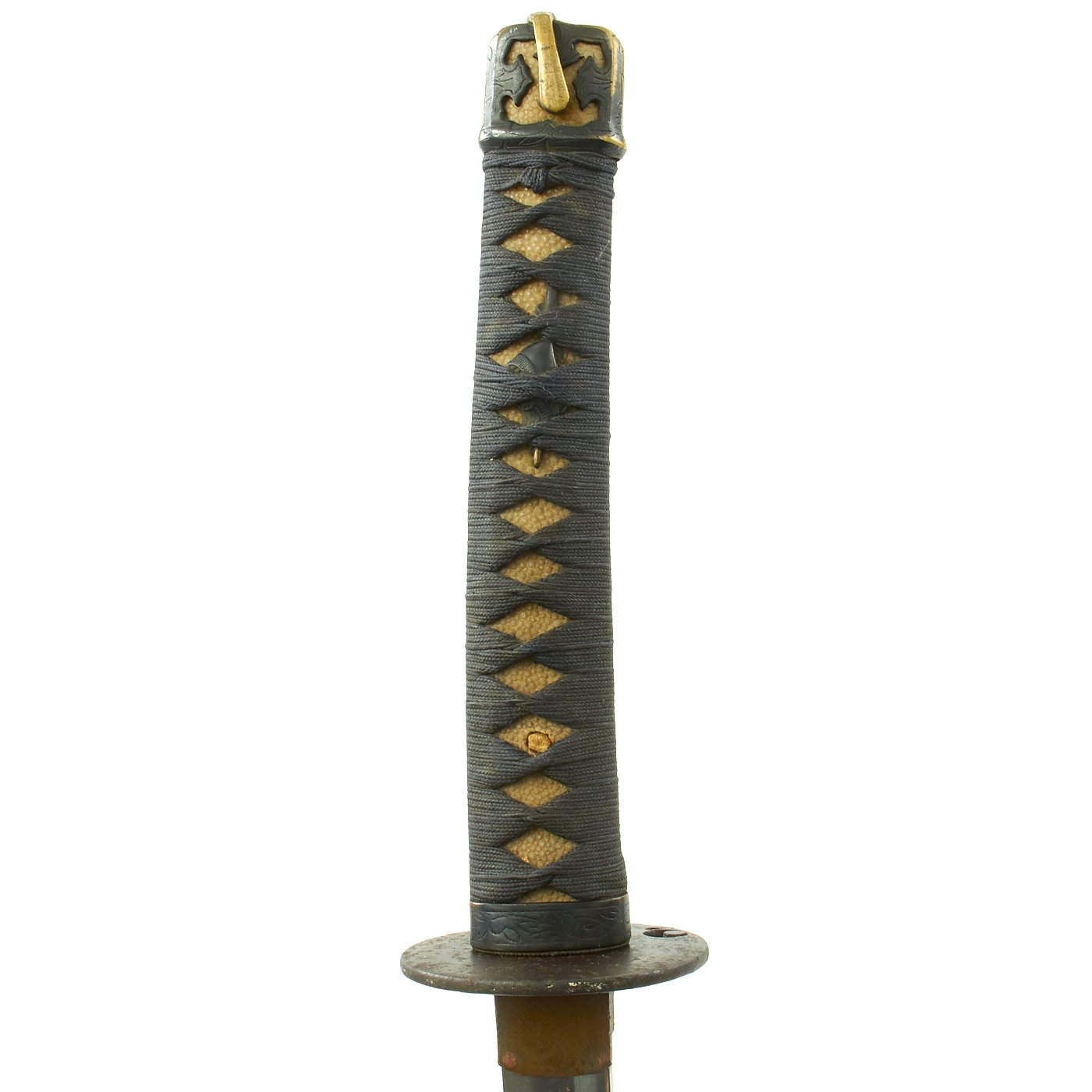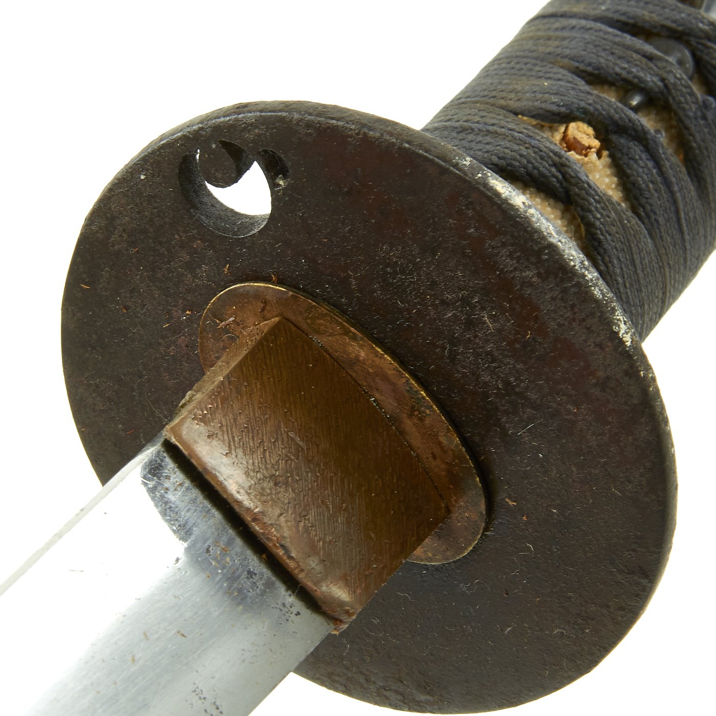 It also has an excellent stingray Sa-Me (grip) with complete Ito (cloth binding), which shows slight wear and discoloration from use. The fittings on this katana are all brass except for the iron Tsuba, typical of the Pre-WWII Period. The Tsuba (cross guard) on this blade is round, with minimal ornamentation. There are two seppa (spacers) surrounding the cross guard, which is secure. Most likely this was a civilian blade, pressed into service at the last need during the war. There were programs where families with no sons or swords that they didn't need could donate them to the war effort.