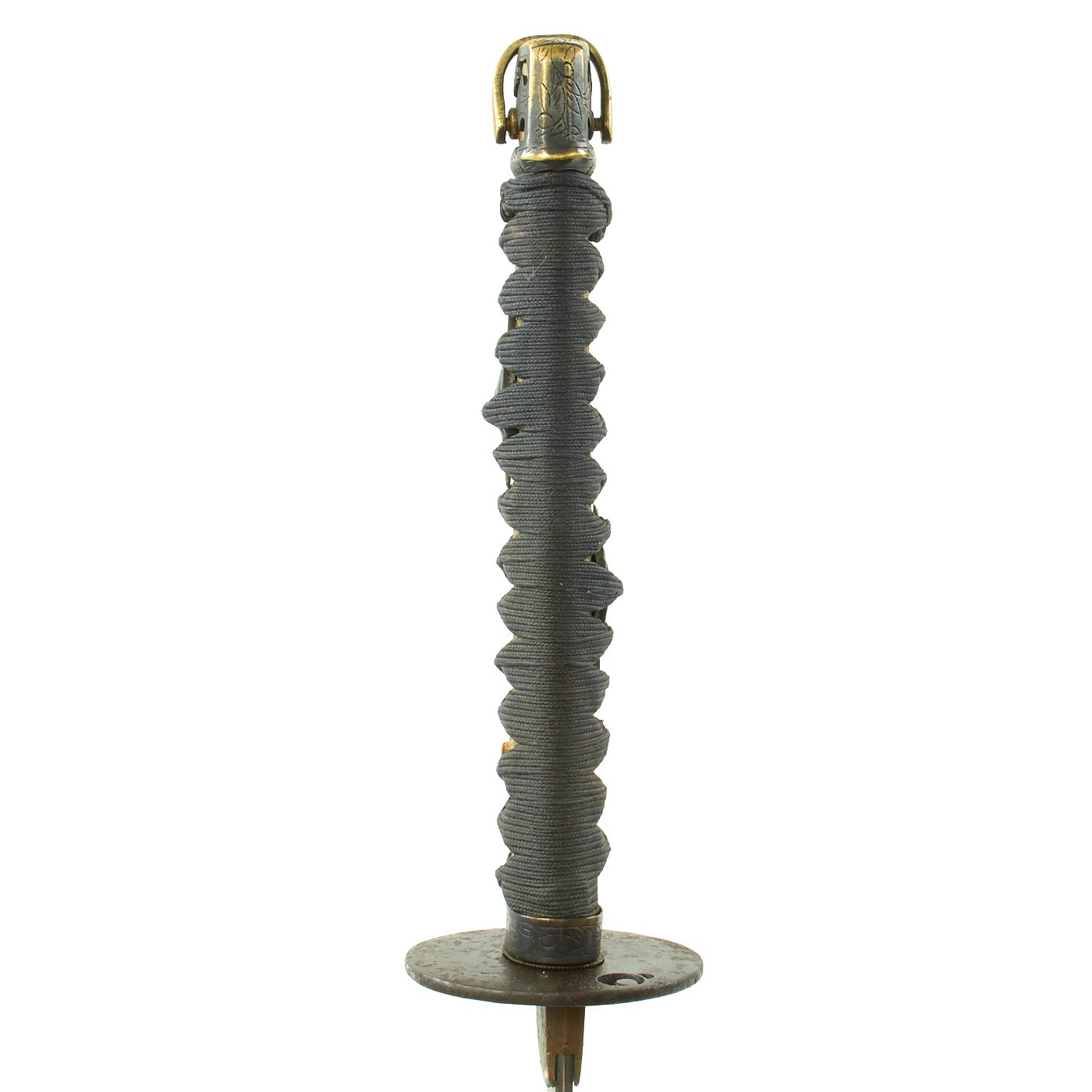 The handle (tsuka) is well-fitting, with only a little bit of play, and has ornate brass menuki (grip decorations), which are actually men (面): combined face mask and shoulder protectors for Kendo. These are overlayed on Shinai (竹刀), the Kendo practice swords. The end of the grip has a nice Kabuto-Gane (end cap) with a brass tassel loop, with the wooden securing peg still present.