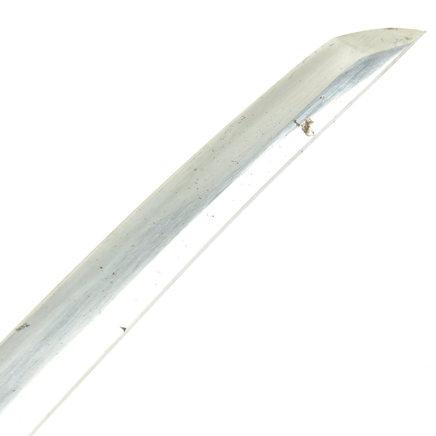 Offered in very good condition with some small areas of surface oxidation, the blade is still sharp and only has a few tiny nicks on the edge. Blade length is approximately 25" and overall length 34 3/4". The blade is hand made, with fold lines and inclusions visible, and a clear "wave" (hamon) temper line. It is of the SUGU (straight) type, and runs all the way to the tip, as it should. The Yokote, the line indicating where the tempered tip (boshi) starts, is visible, but somewhat worn. Overall polish is good, making this a very attractive blade. The tang, unlike almost all of the Japanese swords we see, is not the normal "futsu" shape. This tang looks to be Funagata or possibly even Tanago, with the end cut off as part of suriage, the shortening of the blade. There are not many smiths that used these different tang designs, and it definitely further indicates the great age of this blade.