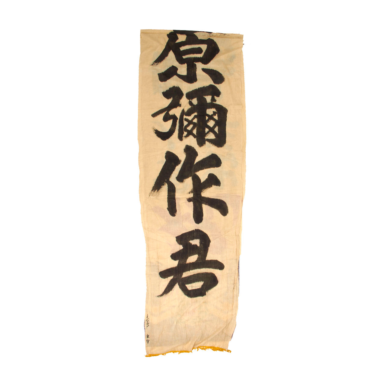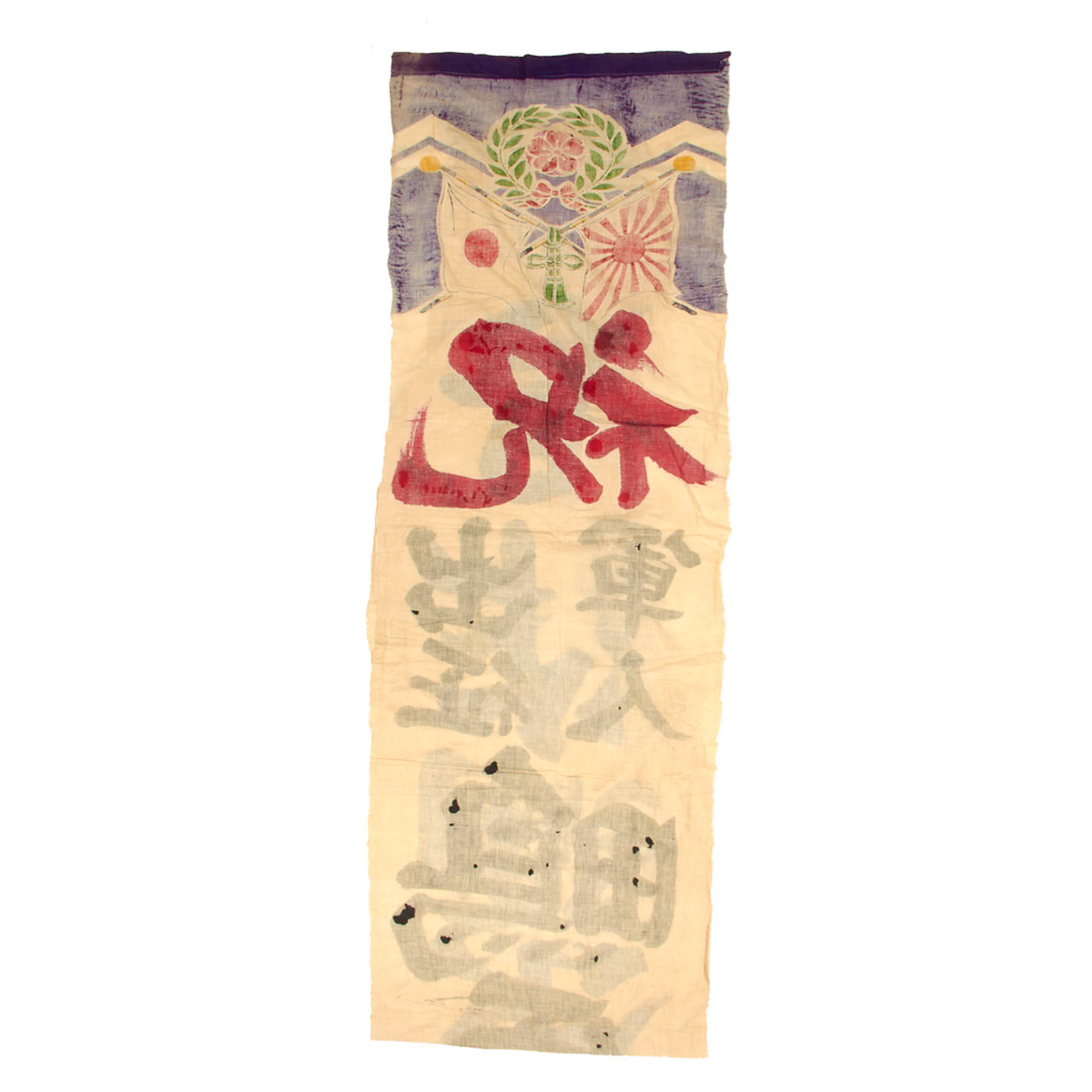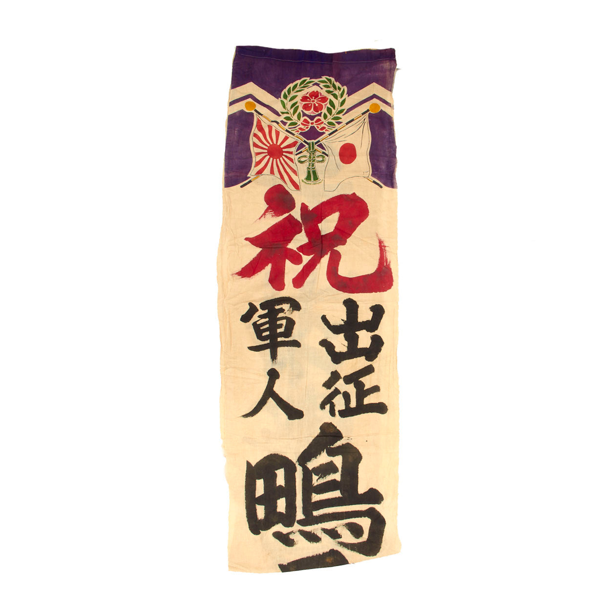 Original Item: One-Of-A-Kind. When Japanese men left for their military service, community organizations such as the local branch of the Imperial Reservists Association (teikoku zaigo gunjinkai) and the Greater Japan National Defense Women’s Association (dai nippon kokubo fujinkai) organized various celebrations, culminating in send-off parades to wish the troops well as they marched off to the local railway stations or ports. These send-off ceremonies were called sokokai and the participants in parades carried banners with the names of the recruits on them. The Japanese term for banner is nobori, and the exact Japanese name for them depends on the slogan. Here we refer to them as a “shussei nobori” or “Off To War Banners”.
