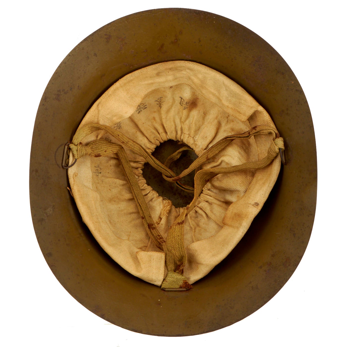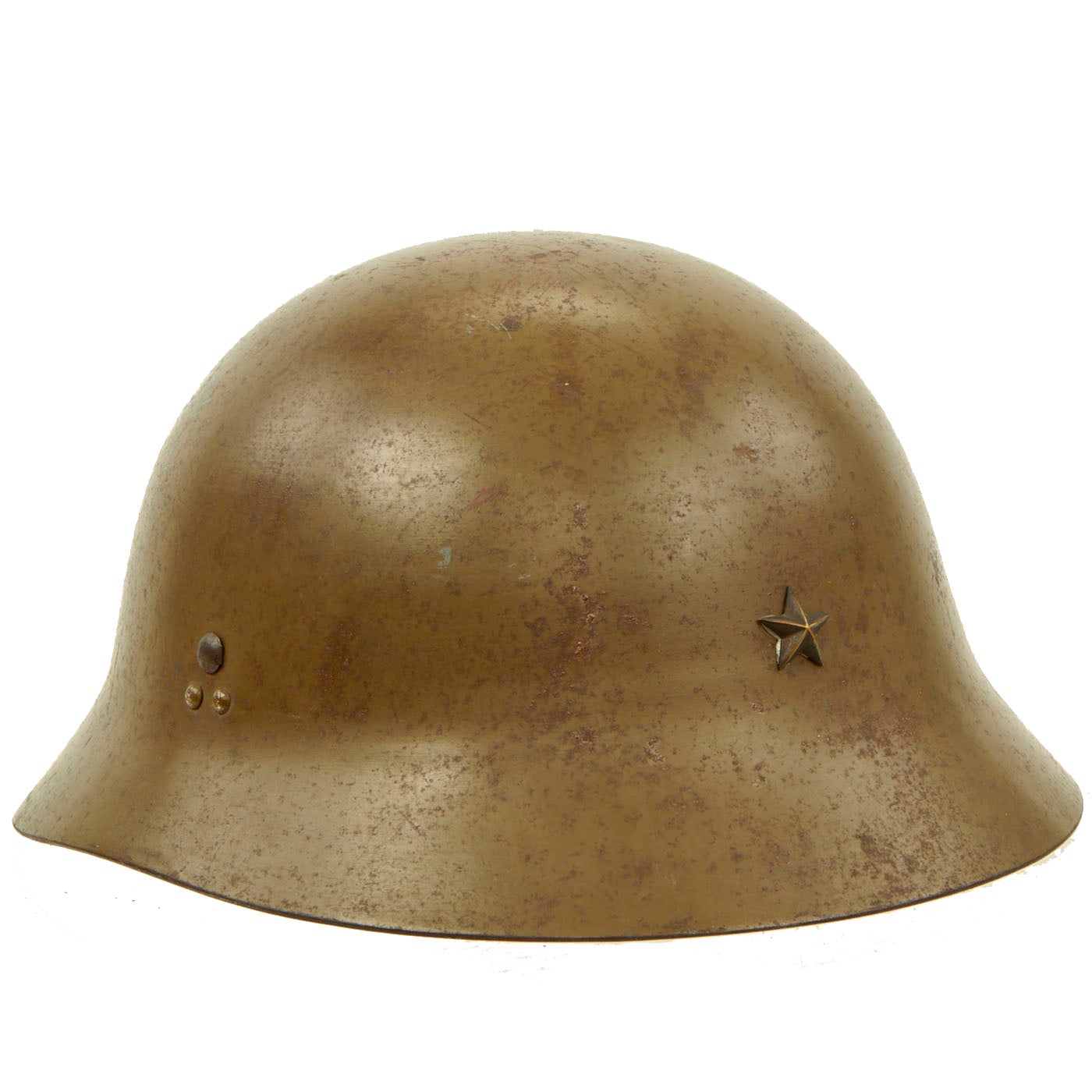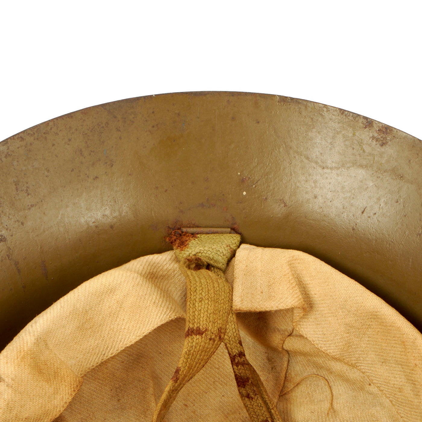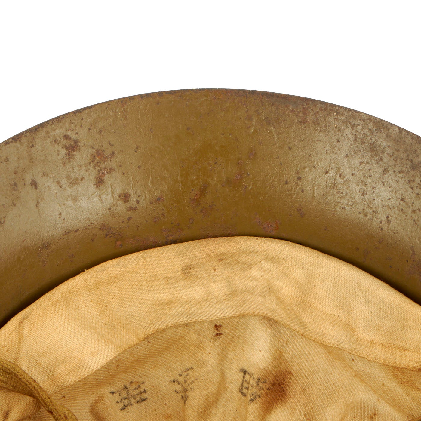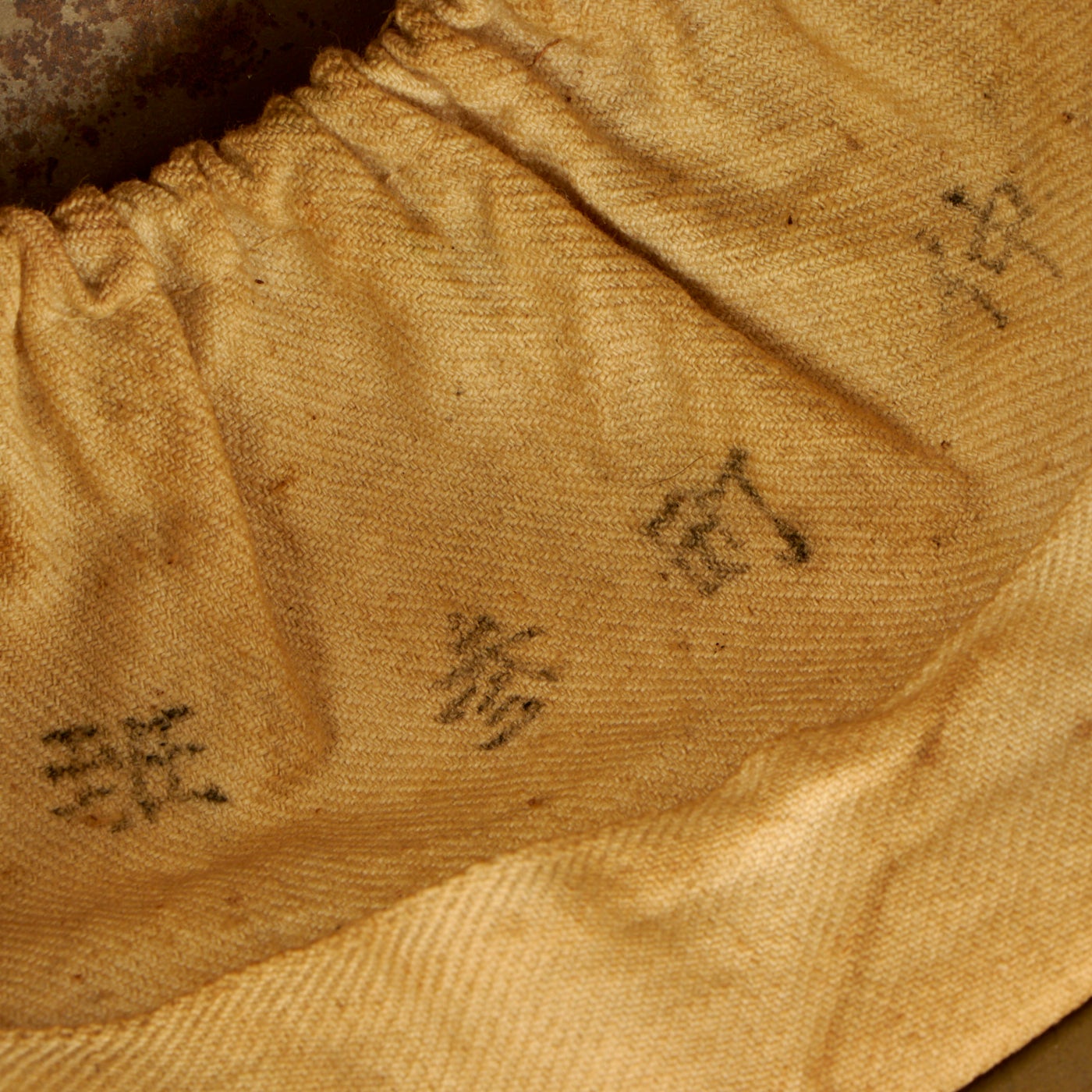 Original Item: Only One Available. This is an very nice late war "last ditch" issue example of the classic Type 92 Tetsubo (鉄帽 - "steel cap"), also colloquially called the tetsukabuto ( 鉄 冑 "steel helmet") by troops. Towards the very end of the war, thinner steel was used, as well as simplified liners and chin straps. The vent holes were also omitted to save production time, and simple split pins were used to attach the liner, instead of the riveted on rings.