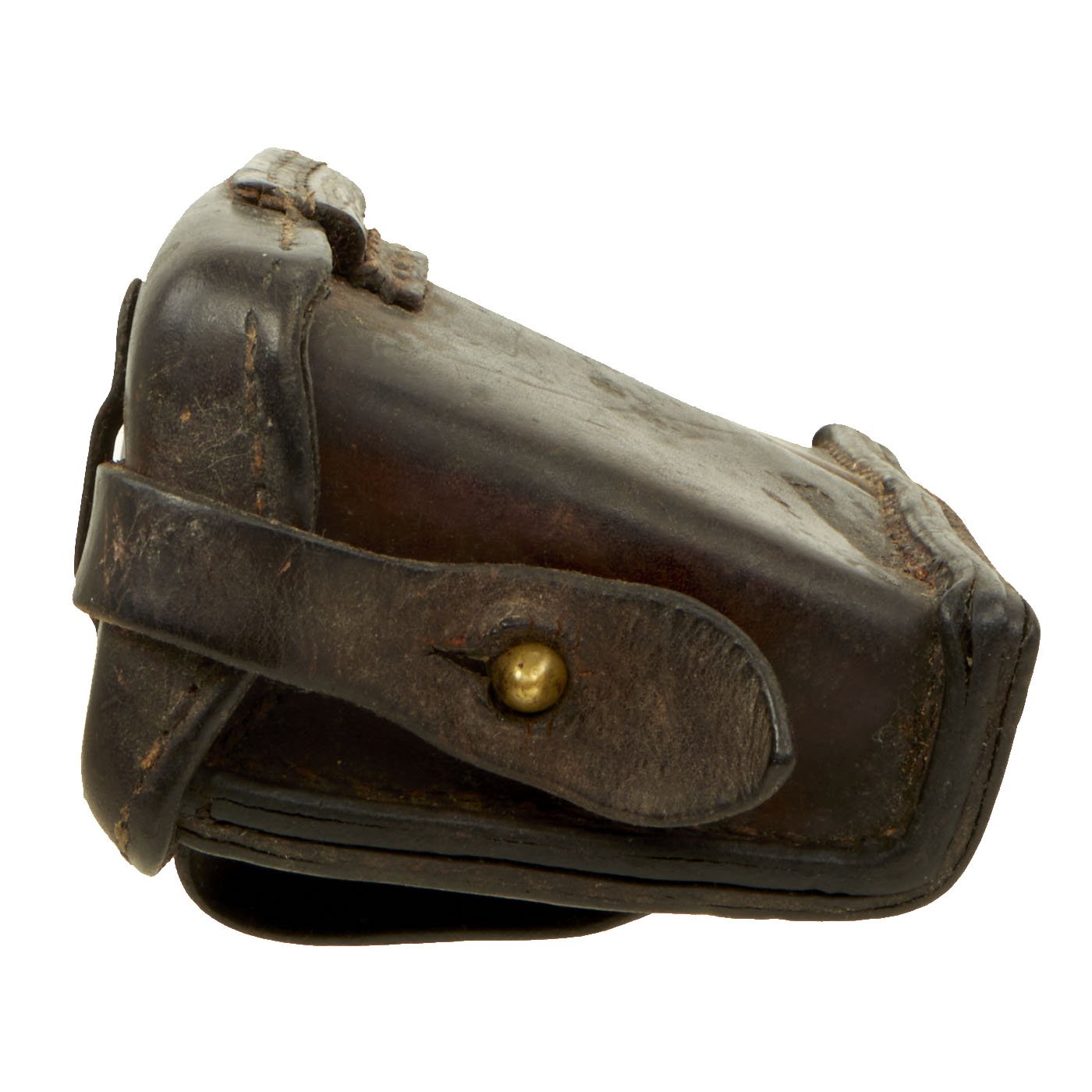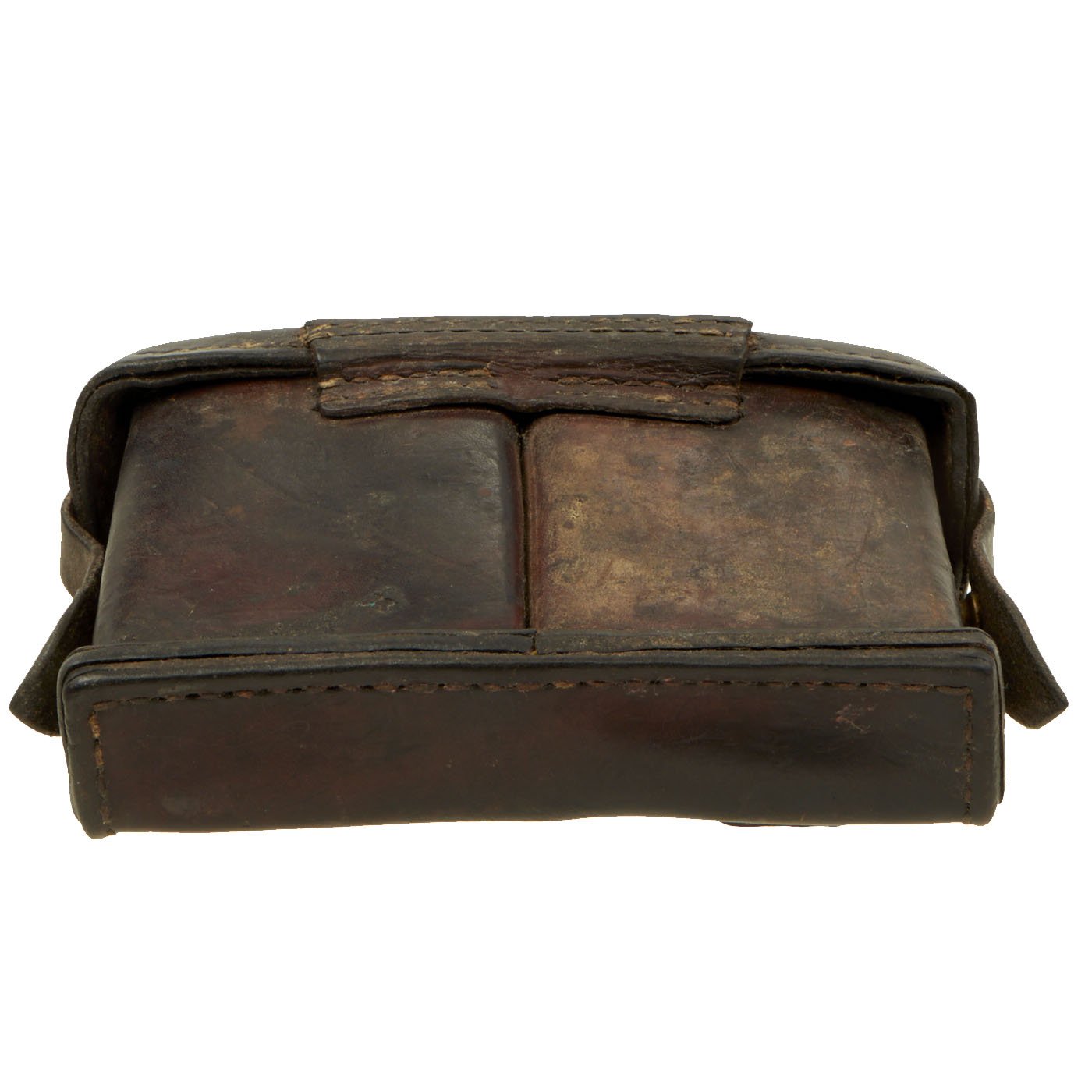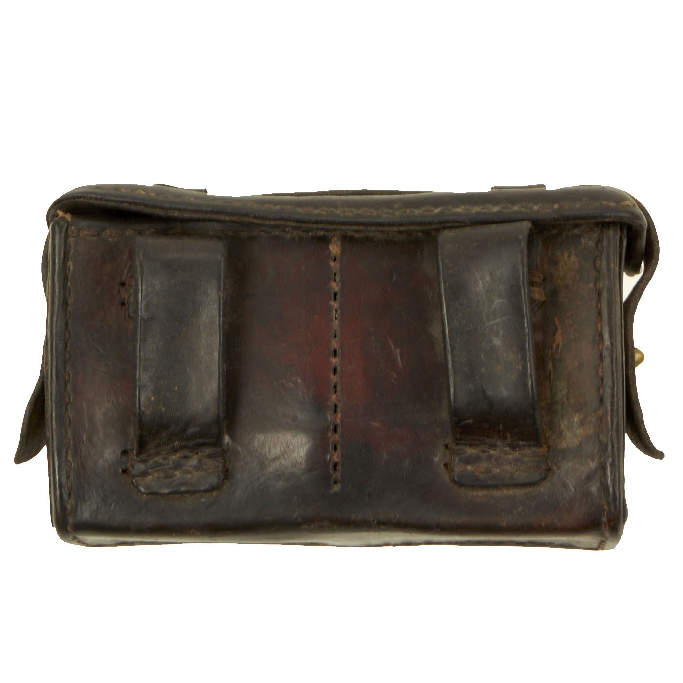 Original Item: Only One Available. This is a very nice example of a hard to find Japanese WWII Leather Ammo pouch for Arisaka Rifles. This is the second pattern, with a second securing loop over the closure strap, which made it much more stable. These were usually worn 2-3 on a belt, and are very hard to find, even as just a single pouch. The inside of the lid on this example is marked, bearing date 昭 十 四, read SHOWA (current reigning emperor) Juu-Yon Nen (14th year of reign - 1939). It is very rare to see markings still intact on these!