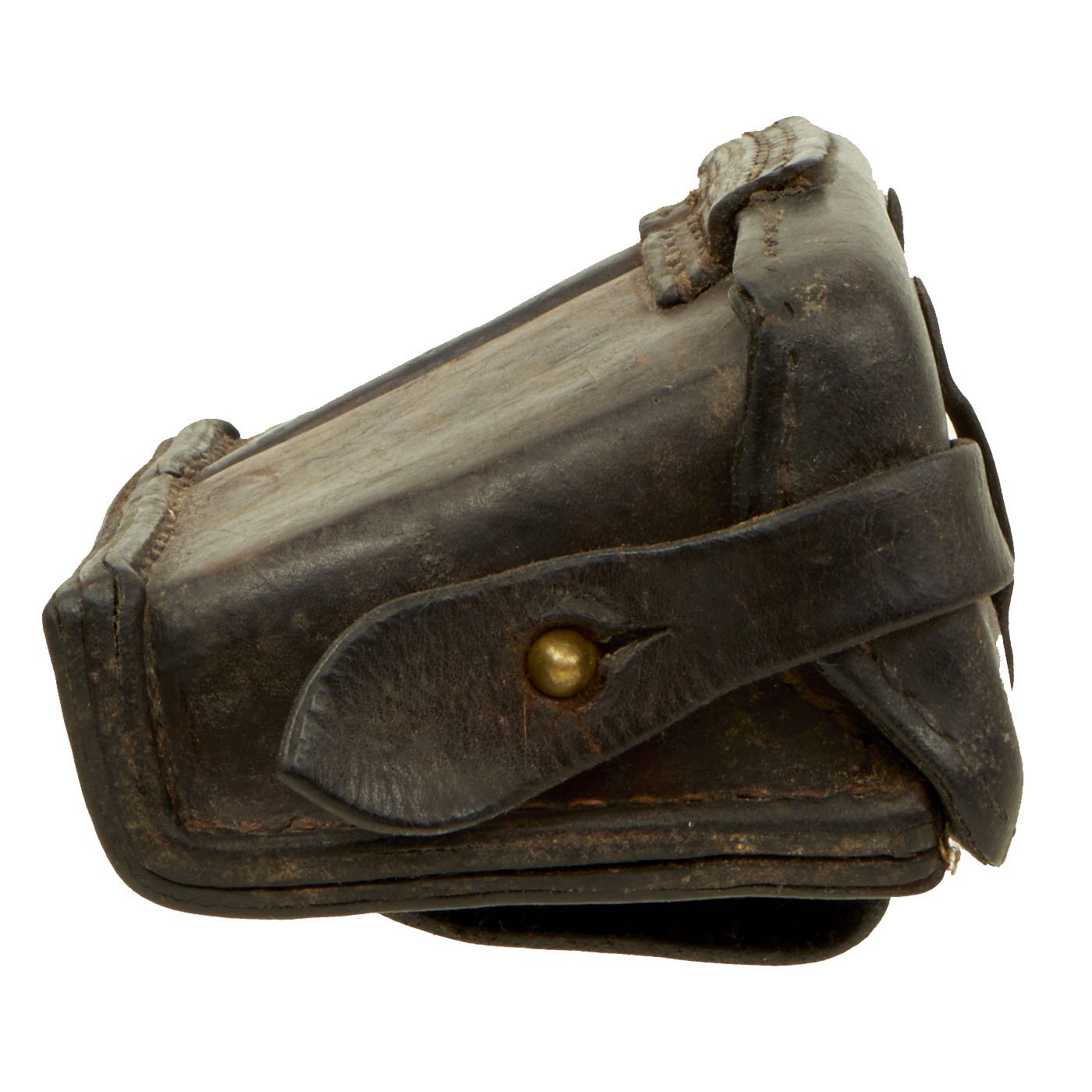 This example is in very good condition, with a lovely worn look. The leather is a bit stiff, but all of the stitching looks intact, and the closure strap works correctly. Even better, there are some lovely souvenirs inside the pouches, in the form of pieces of fabric.