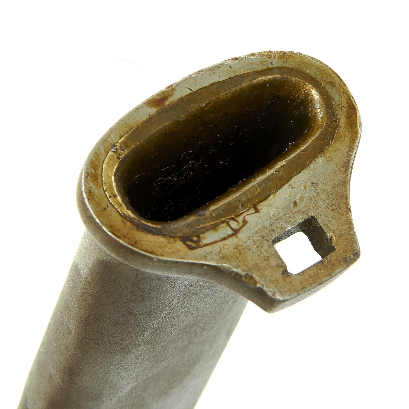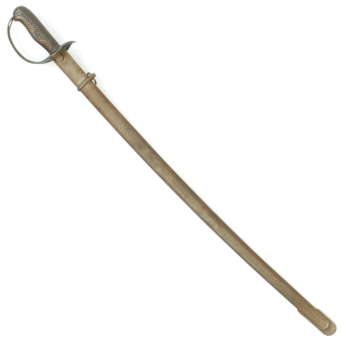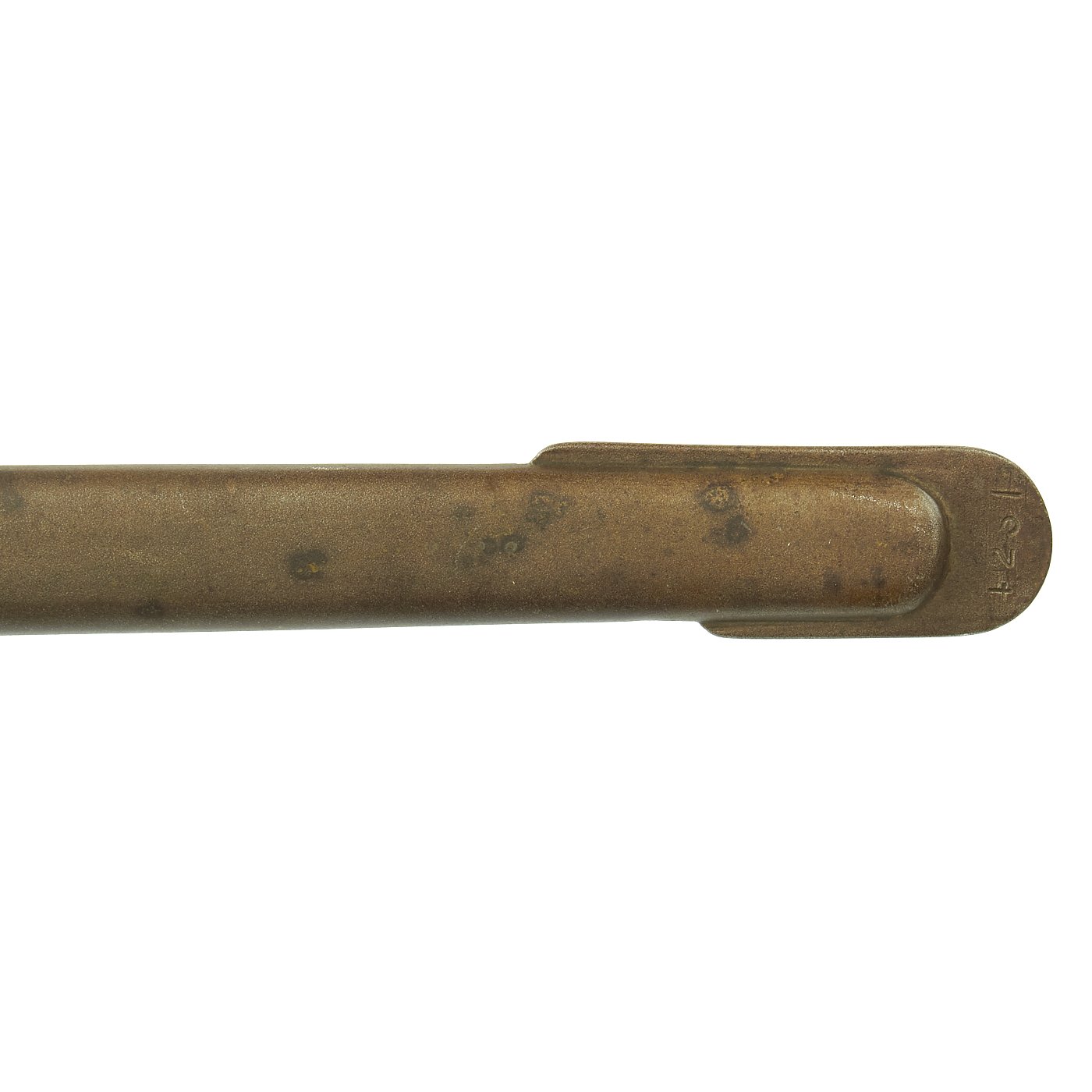 The sword is complete with its steel scabbard, with a single hanger-ring, and functional locking catch. The drag of the scabbard bears non-matching serial number 4231, which is typical. When sent to the regimental armorer for sharpening, swords were often returned without their original scabbard and an active and regularly sharpened sword could go through a number of scabbard swaps during its service life. The scabbard is in very good condition, with a nice finish, and the previously mentioned personalization.