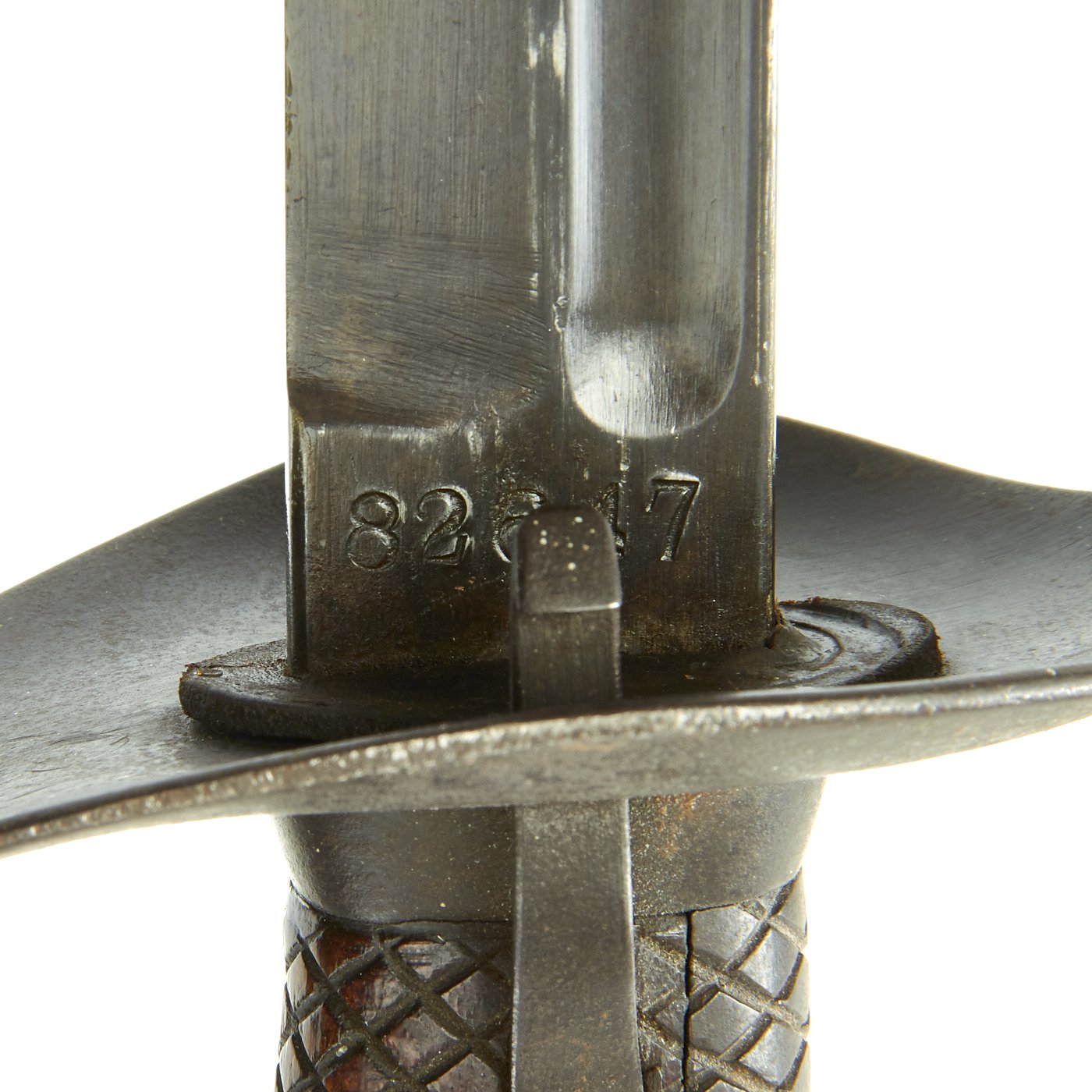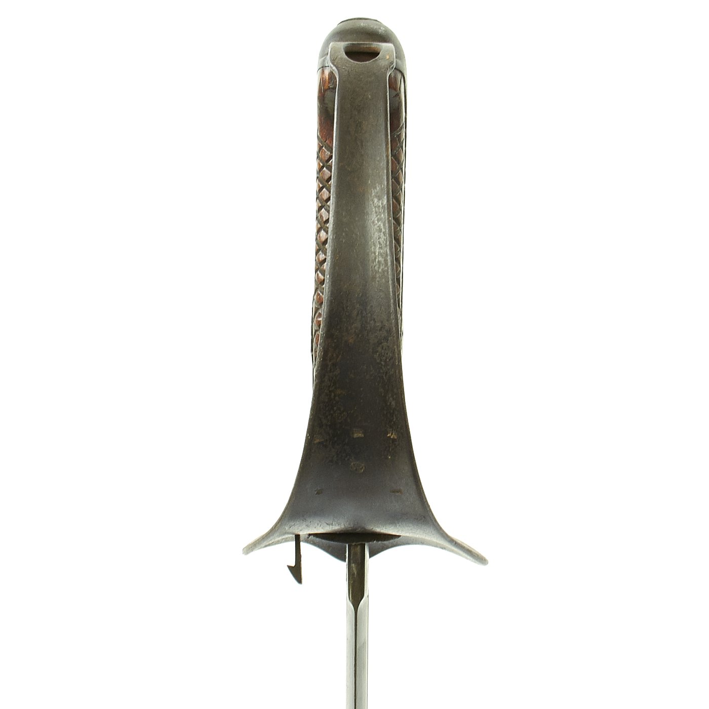 The blade is in very good condition and retains its fighting edge. The ricasso is stamped with serial number 82647. The blade was designed for cutting and thrusting and was superbly good at both. There are no nicks or major damage to the blade,just some areas of finish wear and light pitting.