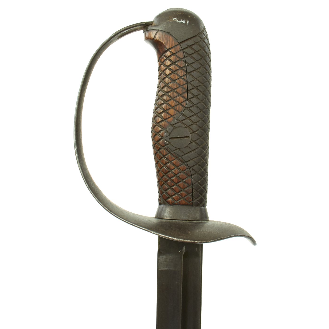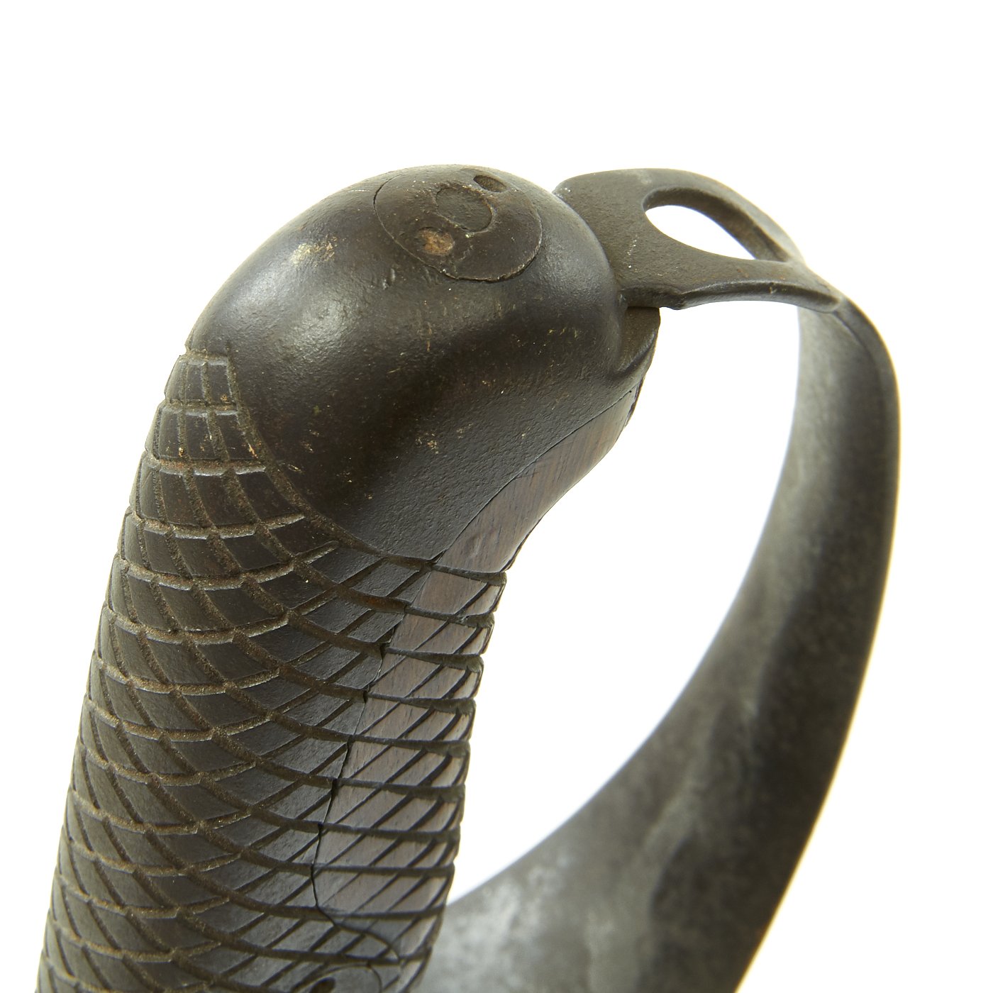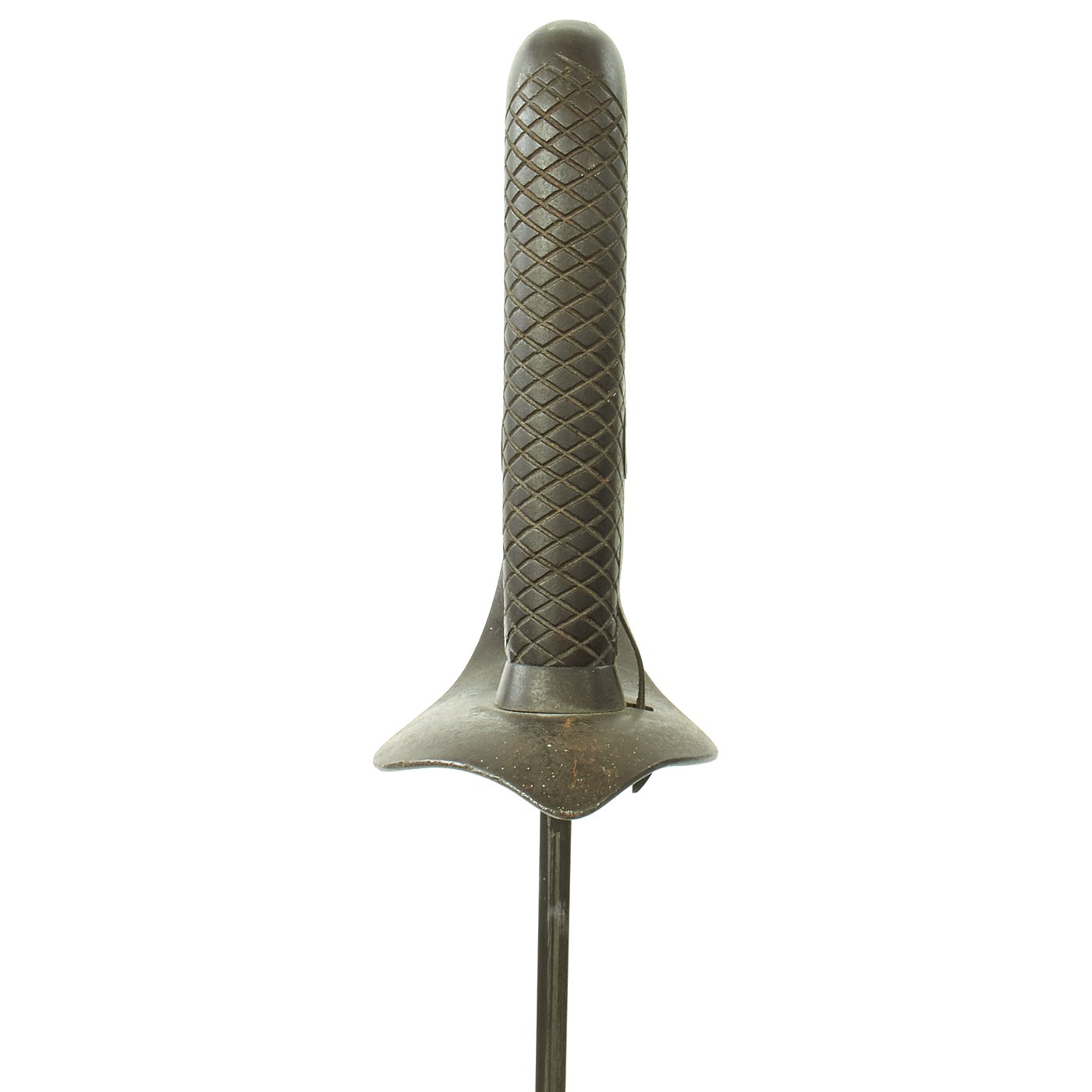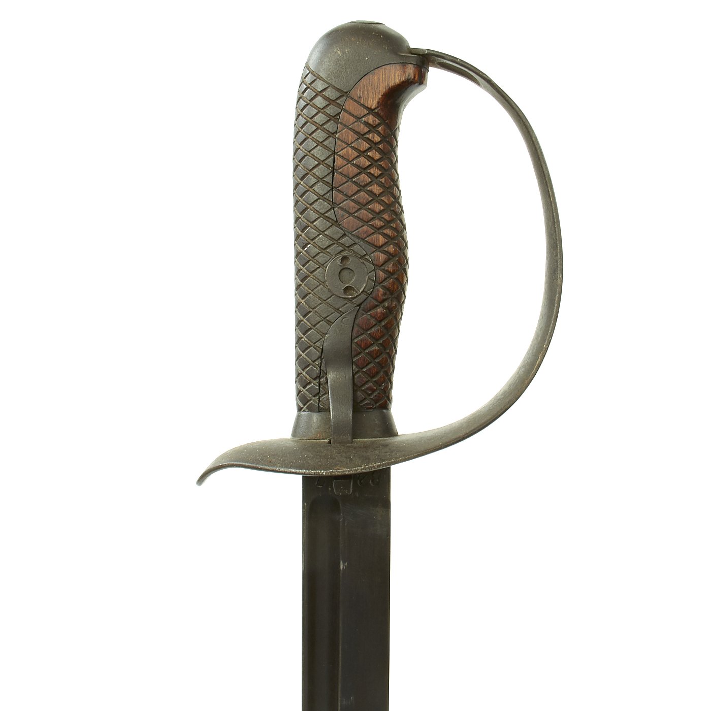 Two patterns of the Type 32 were produced. The first pattern, known as ‘Ko,’ was issued to cavalry NCOs and had a blade length of around 32 1/2 inches. The second pattern, known as ‘Otsu,’ was issued to army NCOs and was shorter, with a blade length of around 30 inches. This example is a ‘Otsu’ pattern Type 32 cavalry sabre, and is later production, as it does not have any mounting hole for the finger loop, so it never had one.
