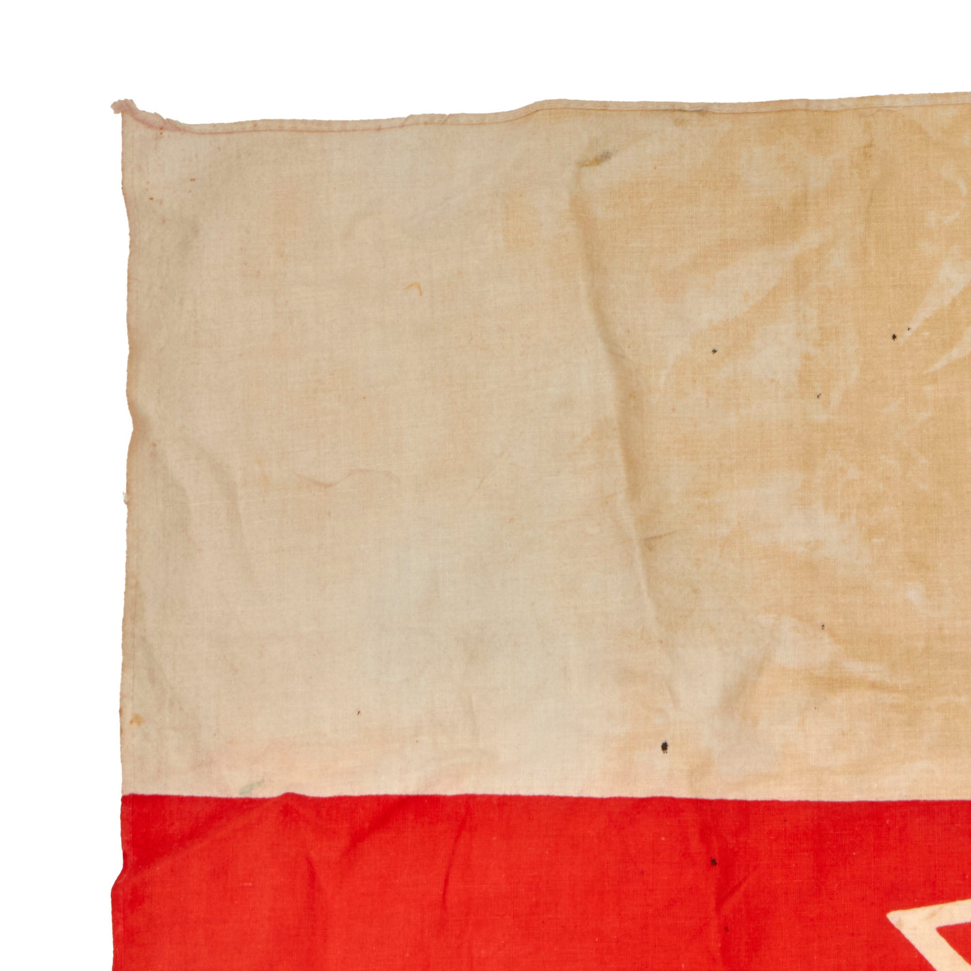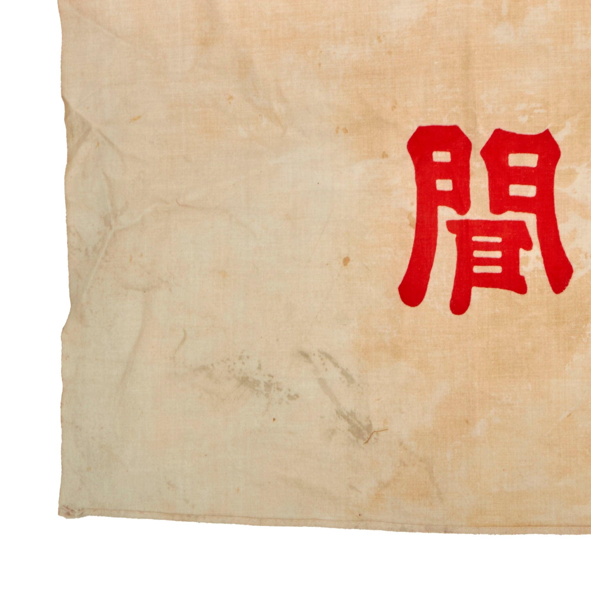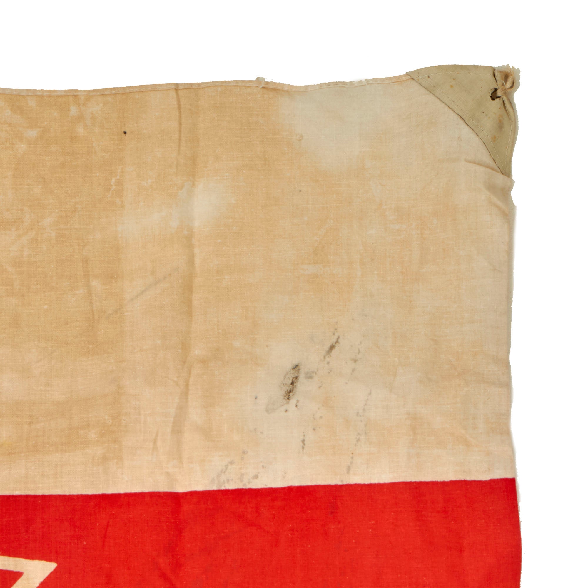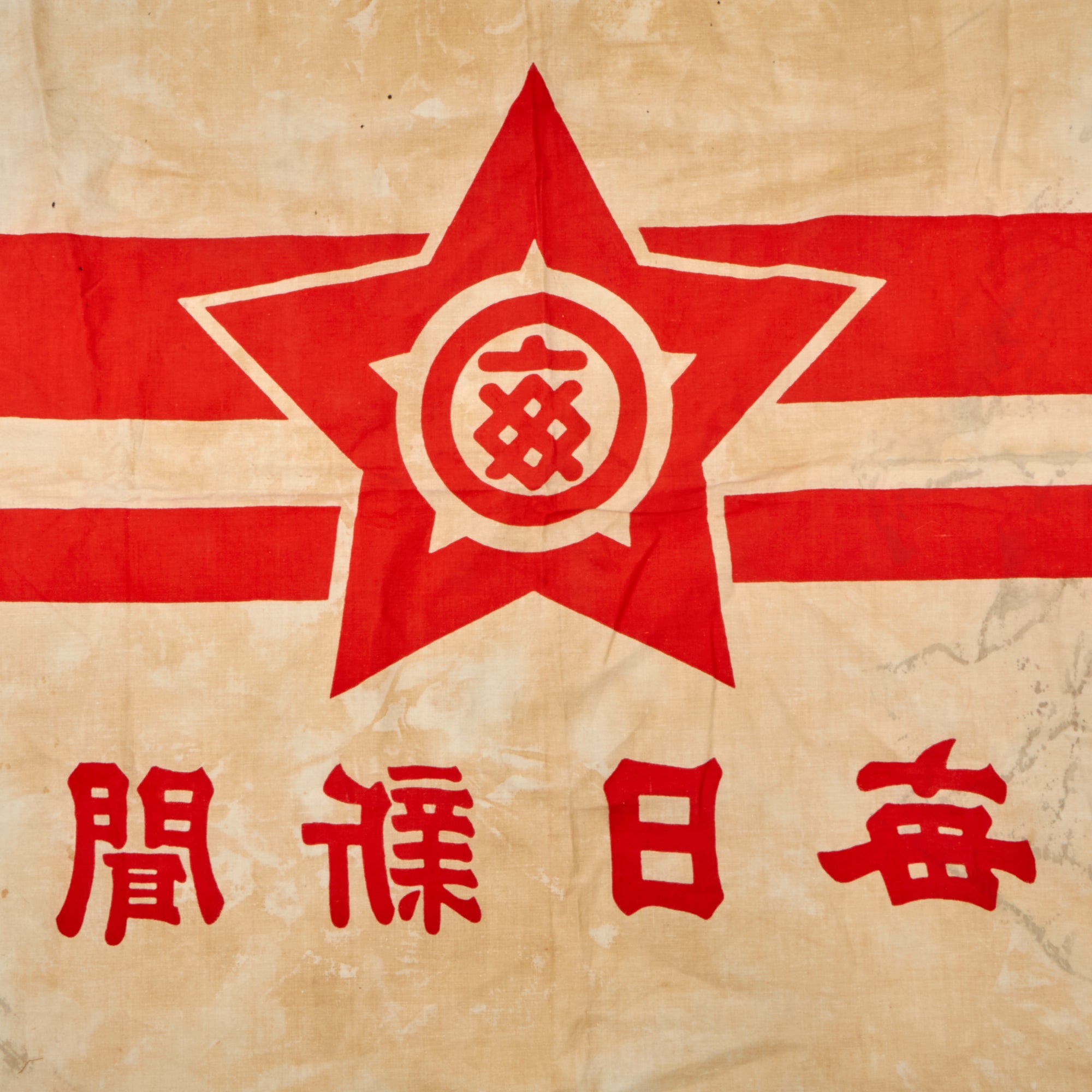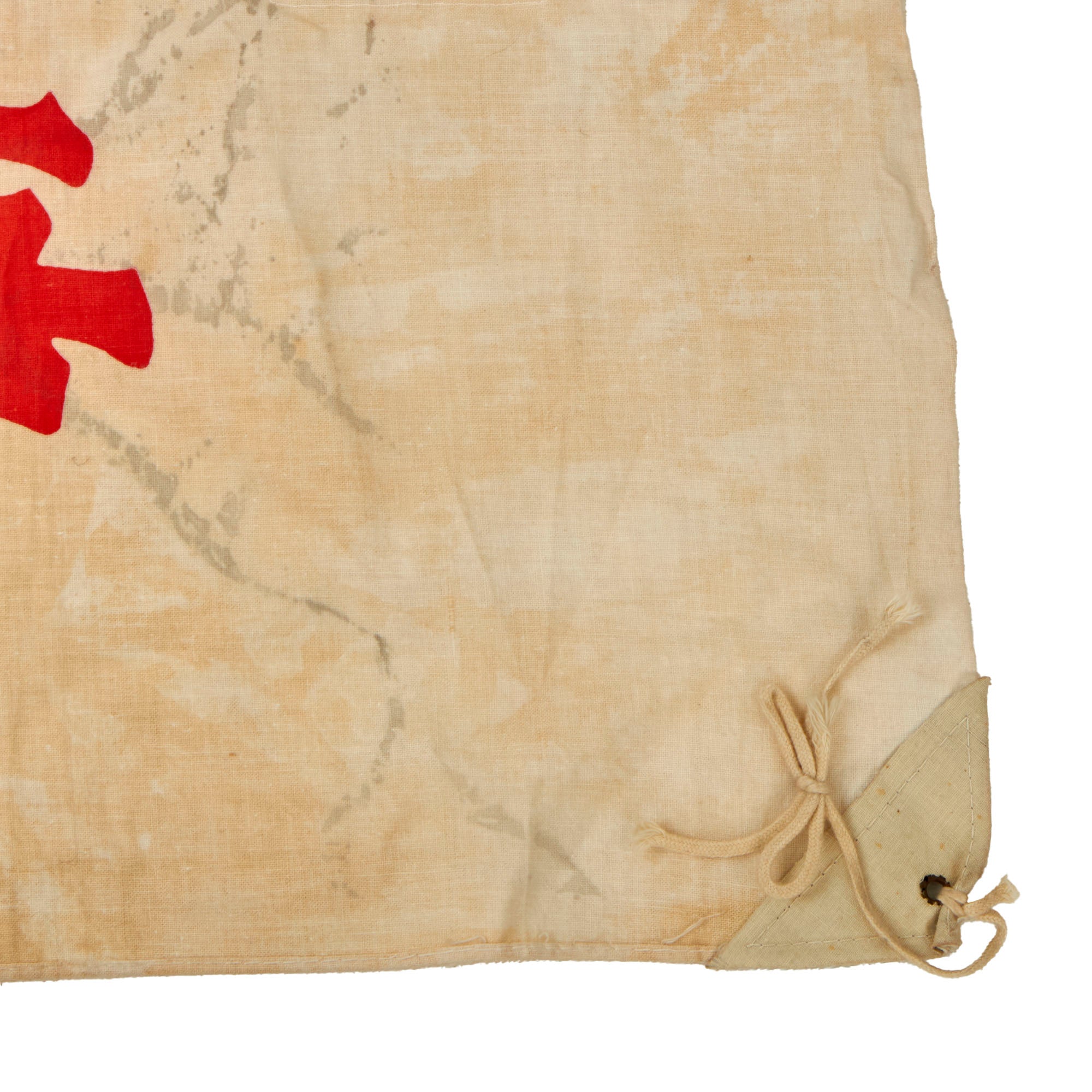 This 27 x 34” flag is a WWII-era company flag for the Mainichi Shimbun newspaper company. The flag retains both corner reinforcements which have grommets and ropes for tying. Both sides show the company logo and title in Kanji.