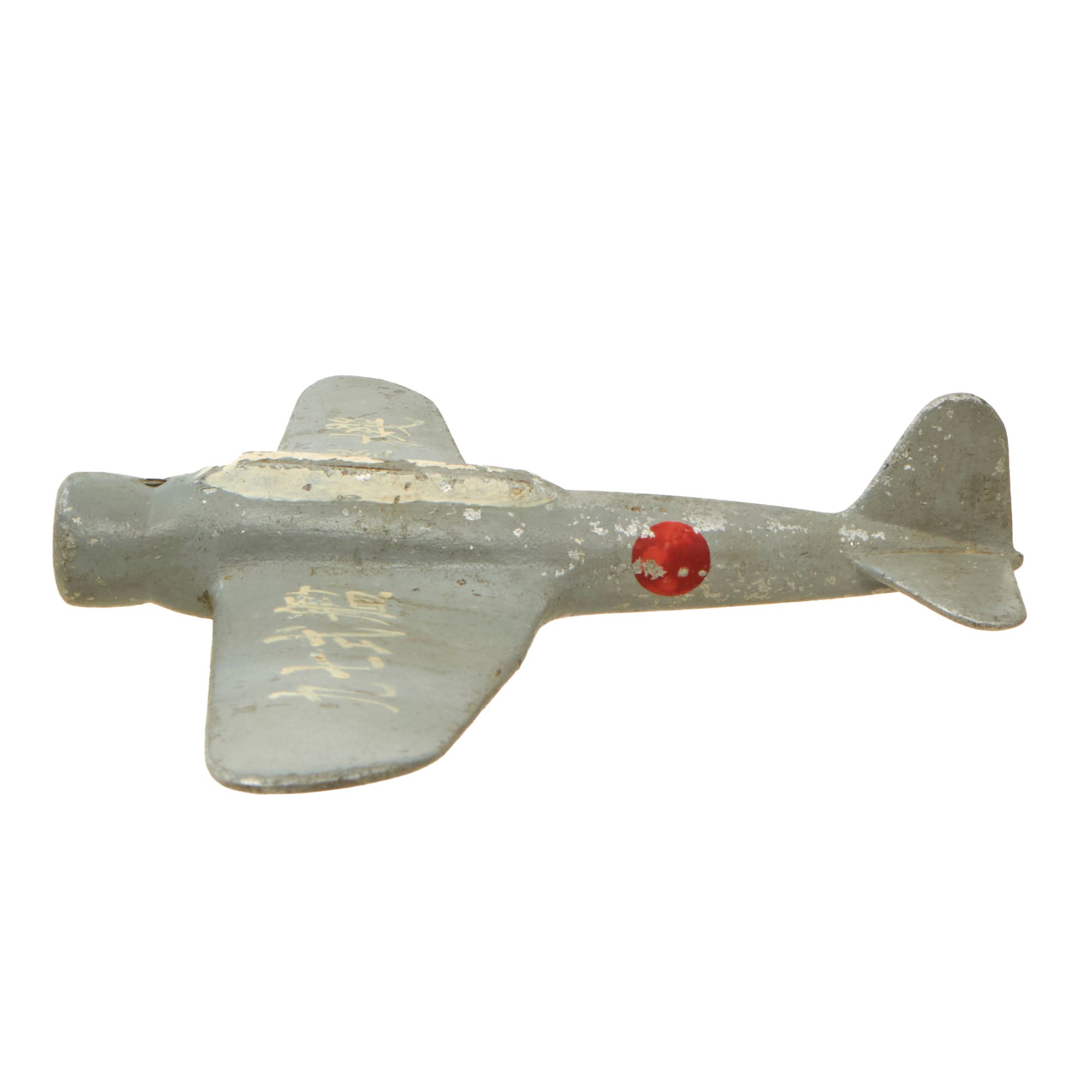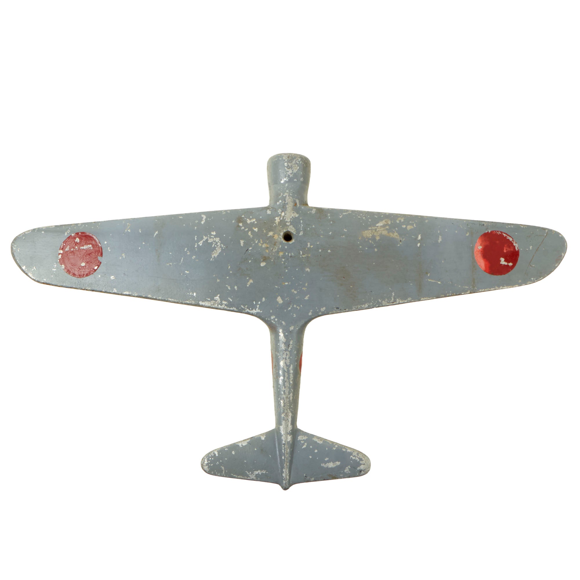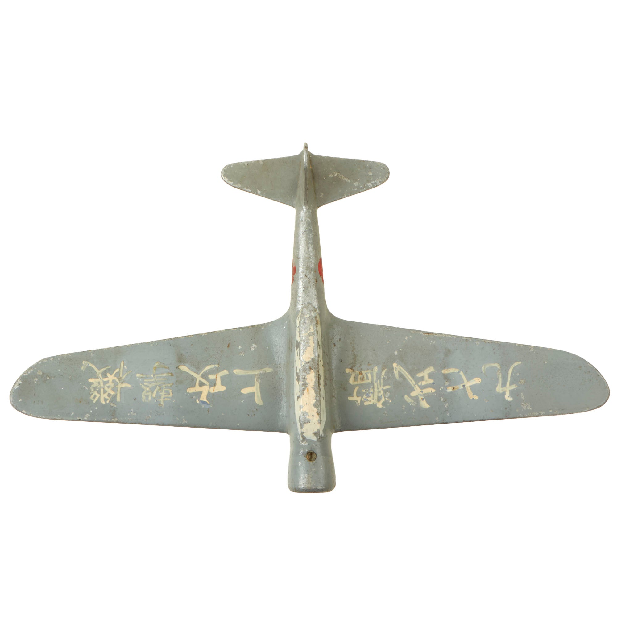 This is an interesting WWII steel model aircraft used for recognition purposes for Japanese soldiers. The plane is inscribed across the wings with Kanji characters translating to Type 97 Carrier Attack Aircraft, designating it as the Nakajima B5N torpedo bomber. It is also marked with the red sun of the Japanese empire on both sides and on the bottom of the wings, with the number 93 stamped into the plane on the bottom side of the front.