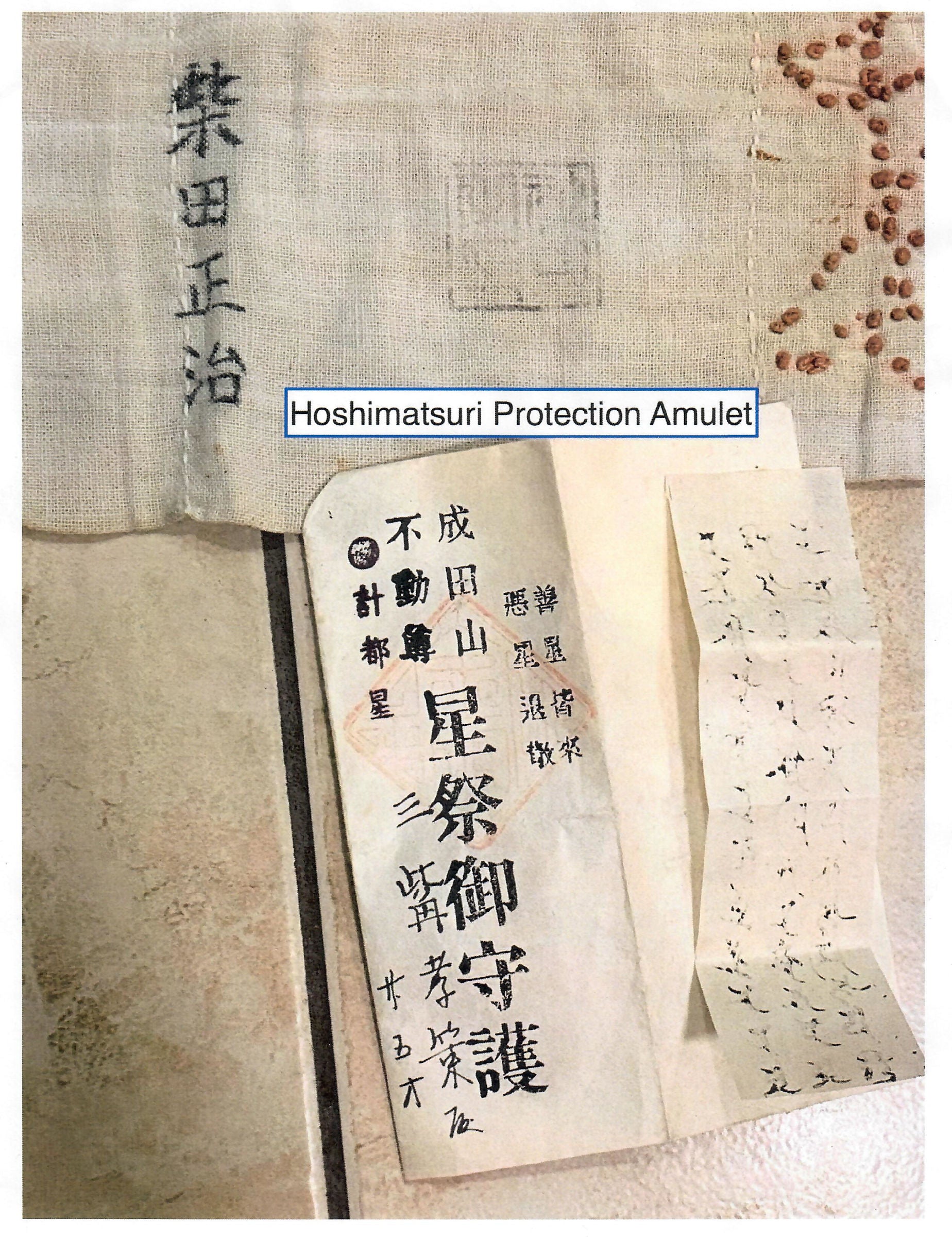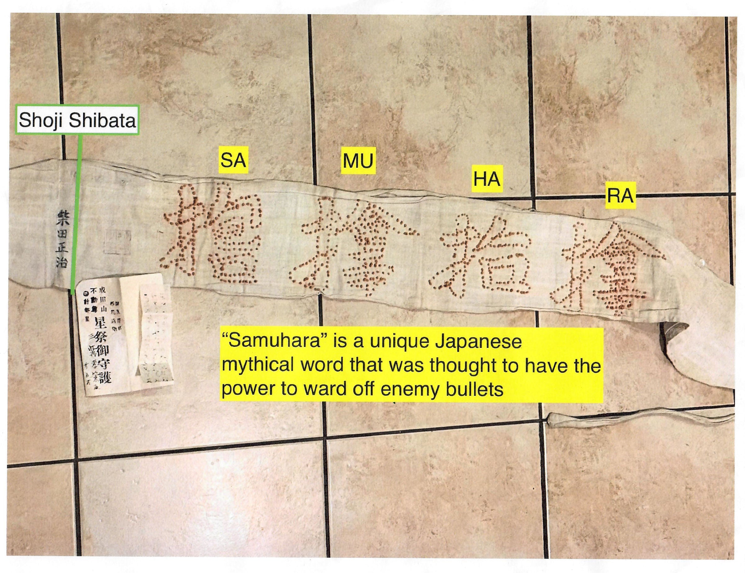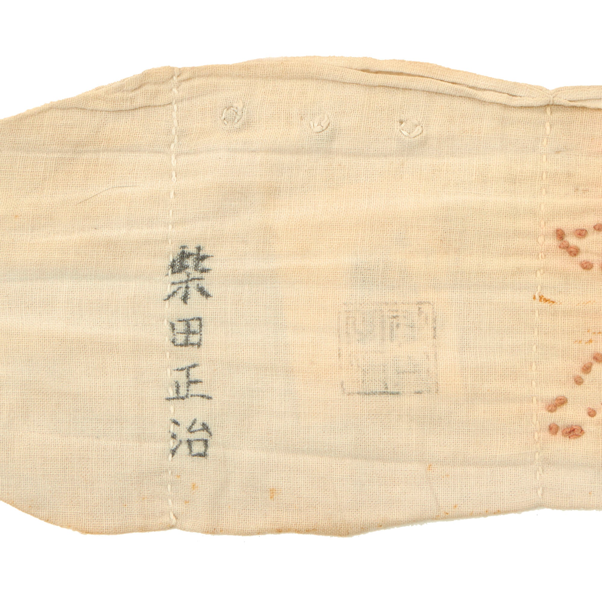 “SAMUHARA” is also the name of the shrine deifying the three gods, and was considered as an amulet or ward for protection against bullets and injury. By stitching this to the belt, the soldier was believe to be protected from harm during the war. To the left of this is a square temple stamp, which we have not been able to identify, and further left is the name 柴田 正治 written from the top down. This is written in the standard Japanese form with the surname first, read as "Shibata", and the given name second, which could be read as "Shōji", "Masaji", or "Masaharu" depending on the type of reading used.