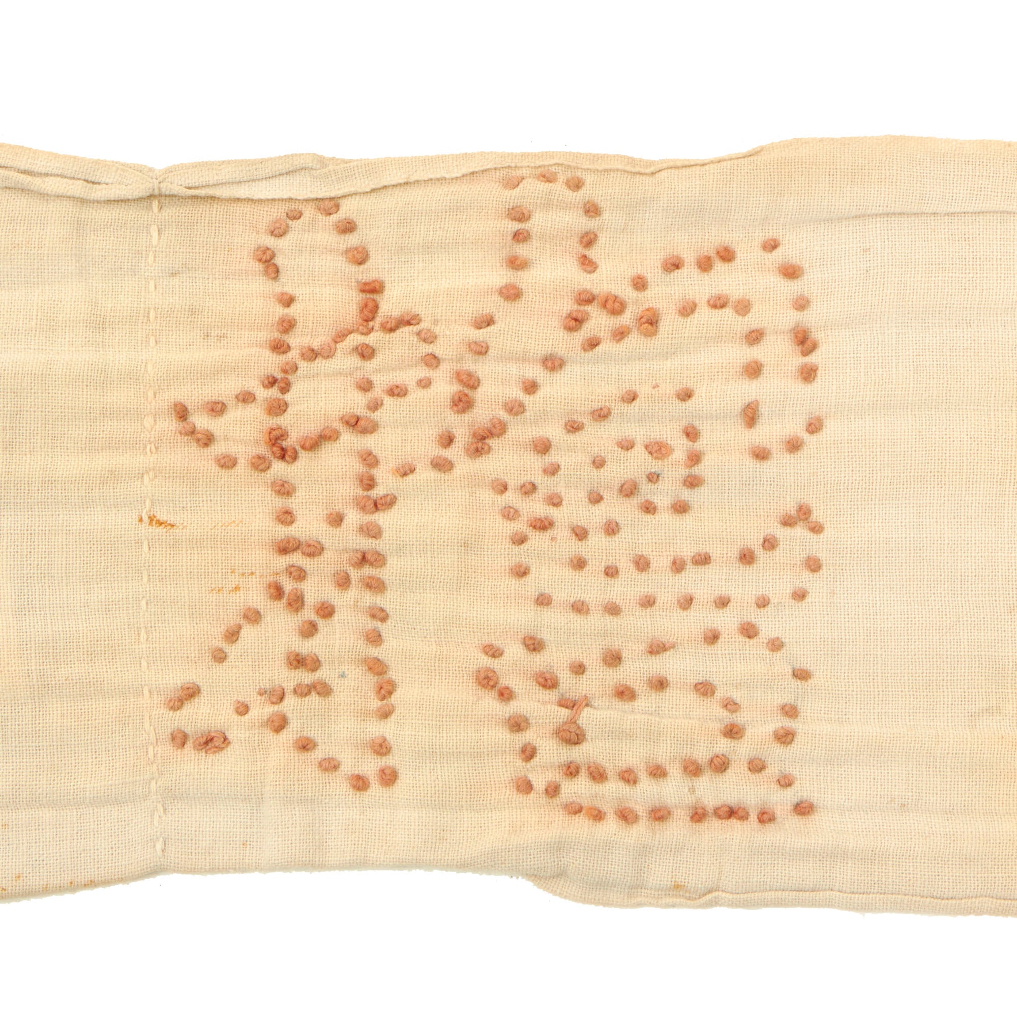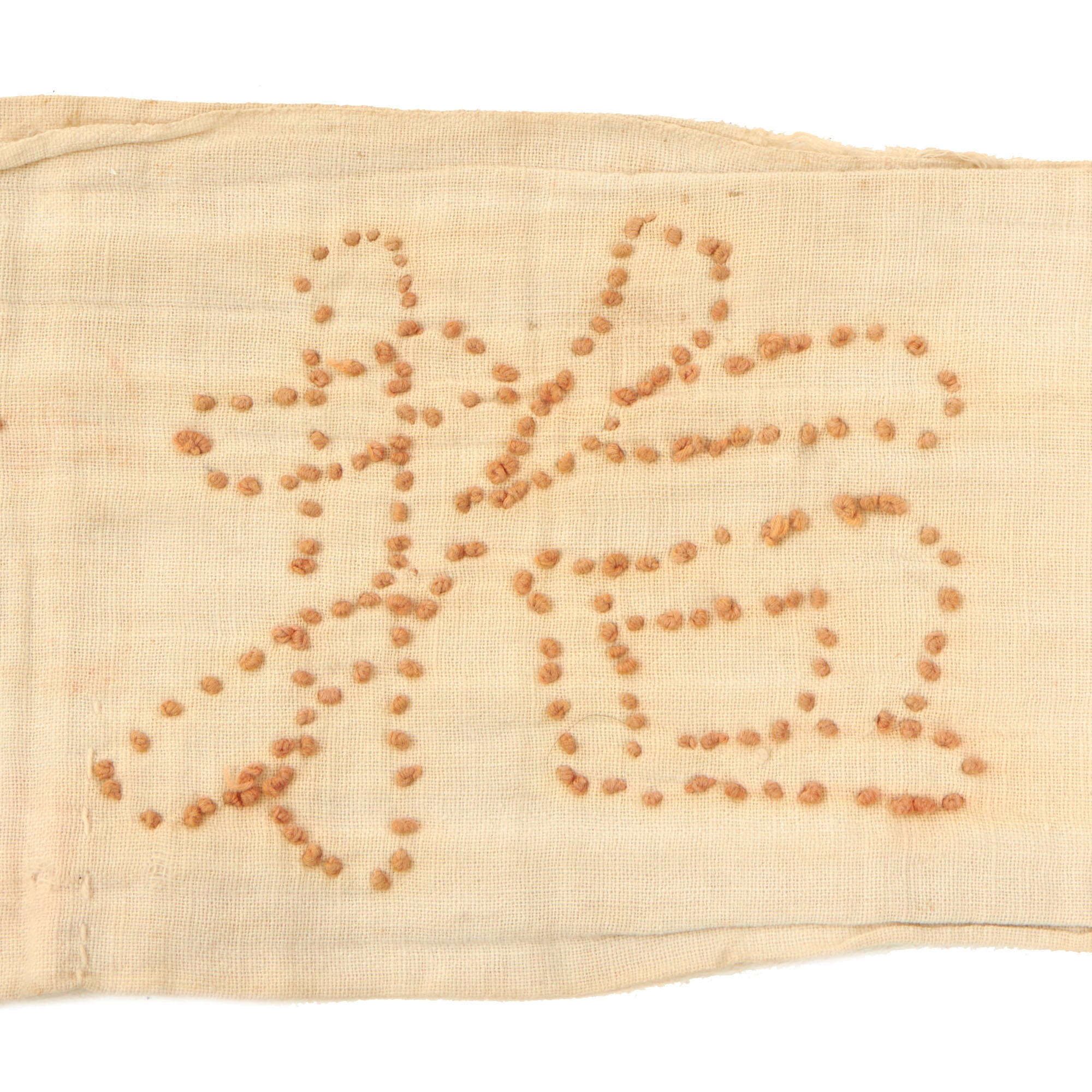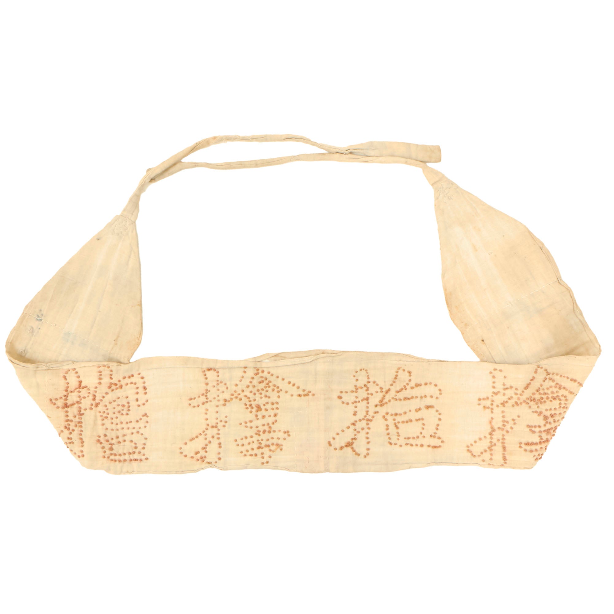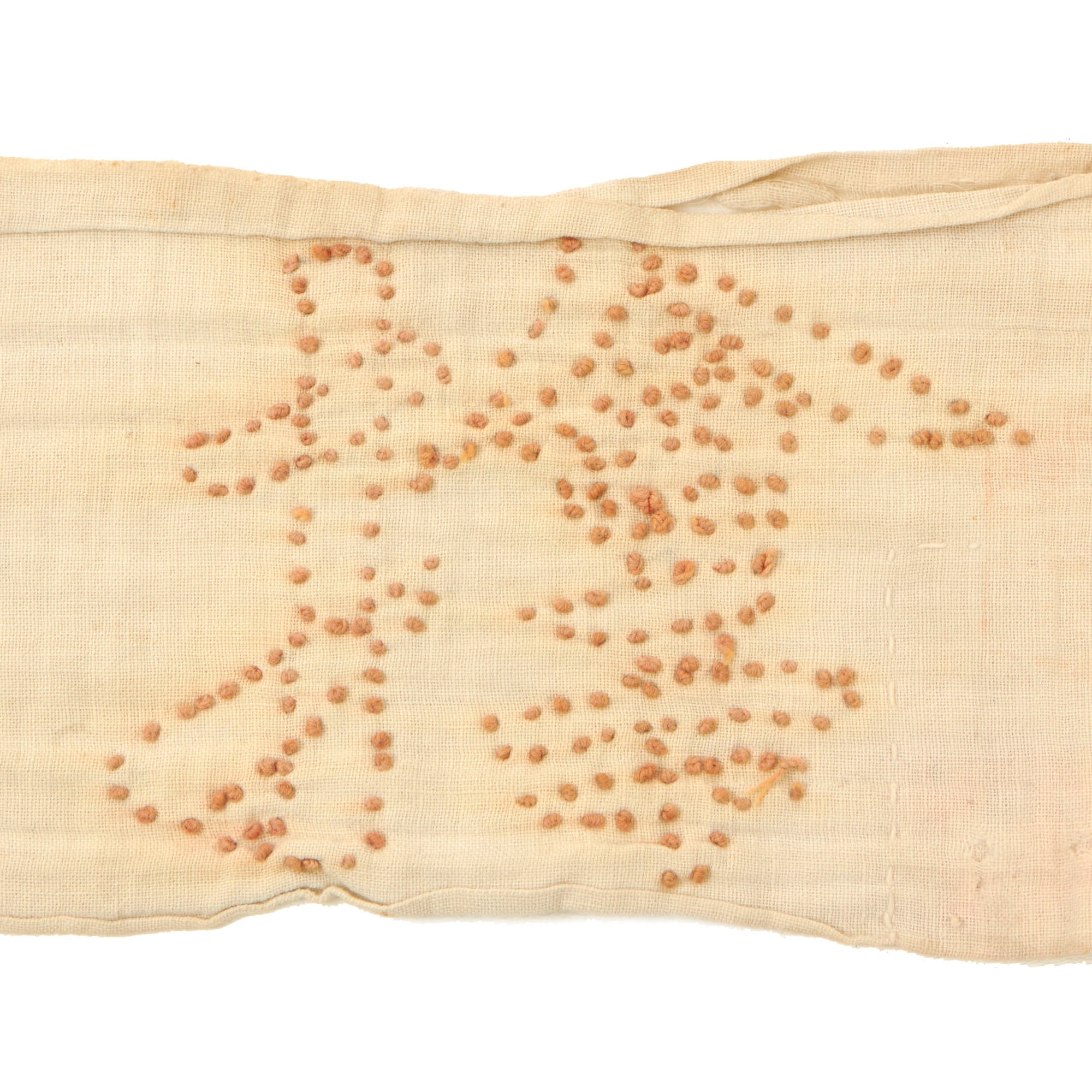 Original Item: One-of-a-kind. A Senninbari (千人針 thousand-person-stitches) or One-thousand stitch is a strip of cloth that measures approximately 15 cm (6 in) high and up to 90–120 cm (3–4 ft) or more in length. Each end of the belt (sash) may or may not have strings, snaps or buttons that allow it to be fastened about the waist. Examples that lack these were often tucked into the waist. Other variations were never worn but may have been folded and placed inside helmet liners, pockets or packs. Senninbari were decorated with 1000 knots or stitches, and each stitch was normally made by a different woman. Senninbari were given as an amulet by women to soldiers on their way to war as a part of the Shinto culture of Imperial Japan.
