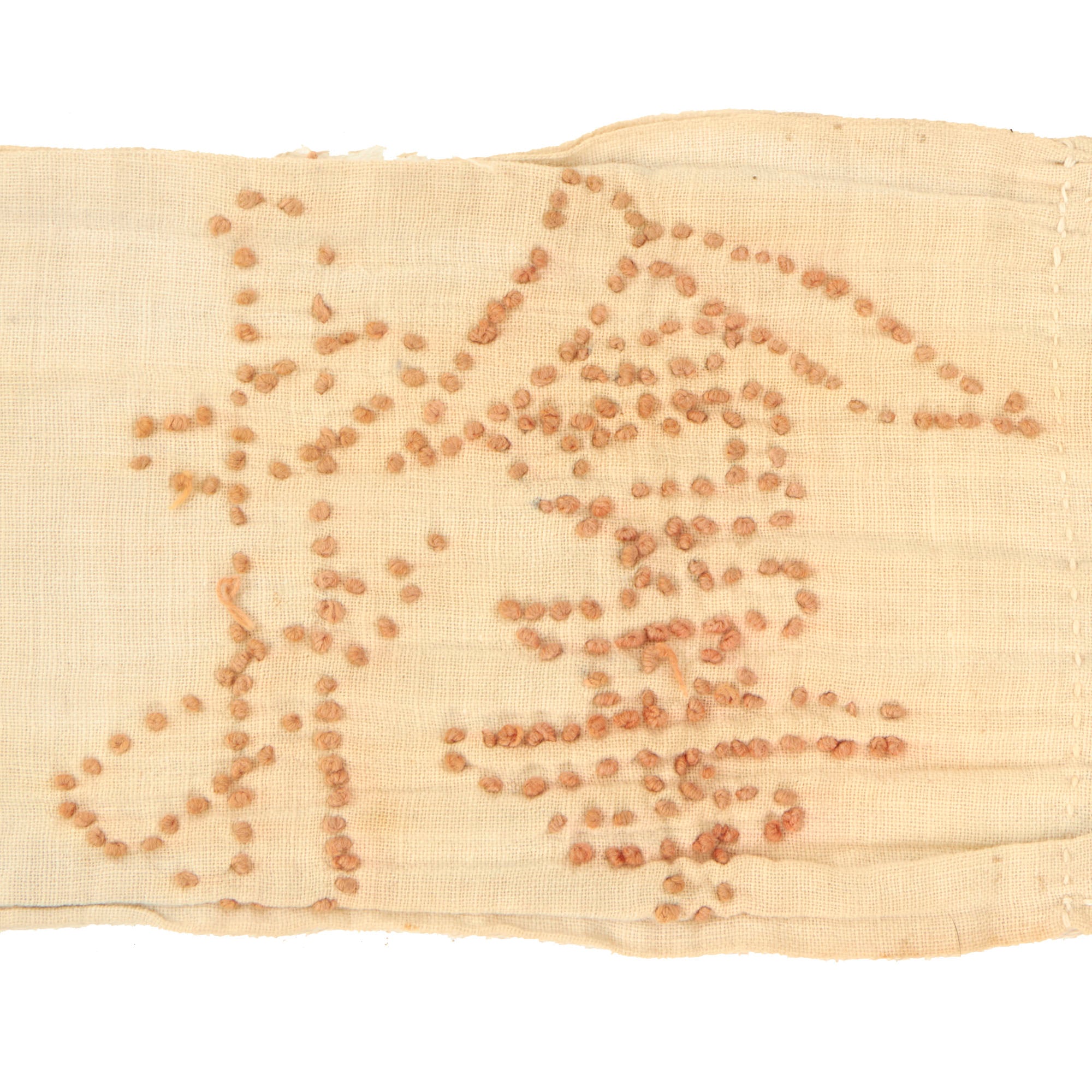 The most noticeable feature on this senninbari is that the stitches are arranged in four large kanji, which read are (right to left) 𪮷 抬 𪮷 𪮇, which is read as SA MU HA RA. These are VERY old Kanji, not used by the general population, only usually by Shrines, and the term the “generic” name referring to the three major creator gods in Japanese mythology: