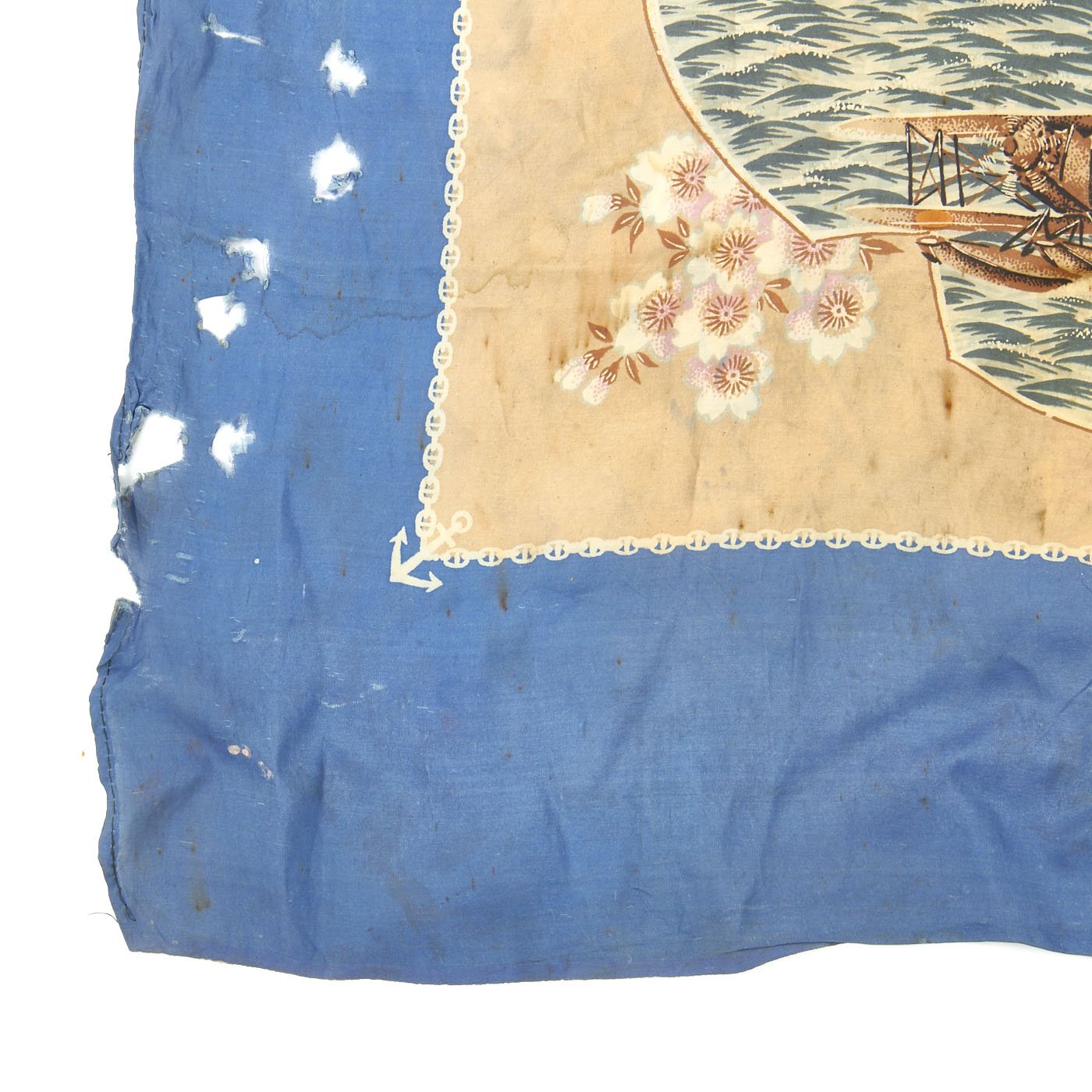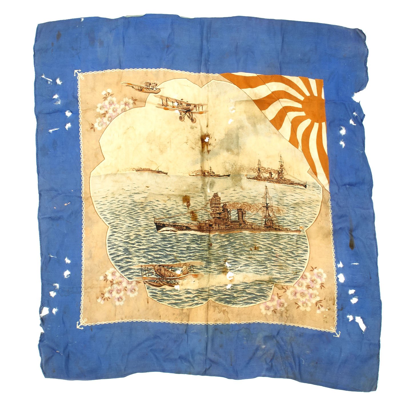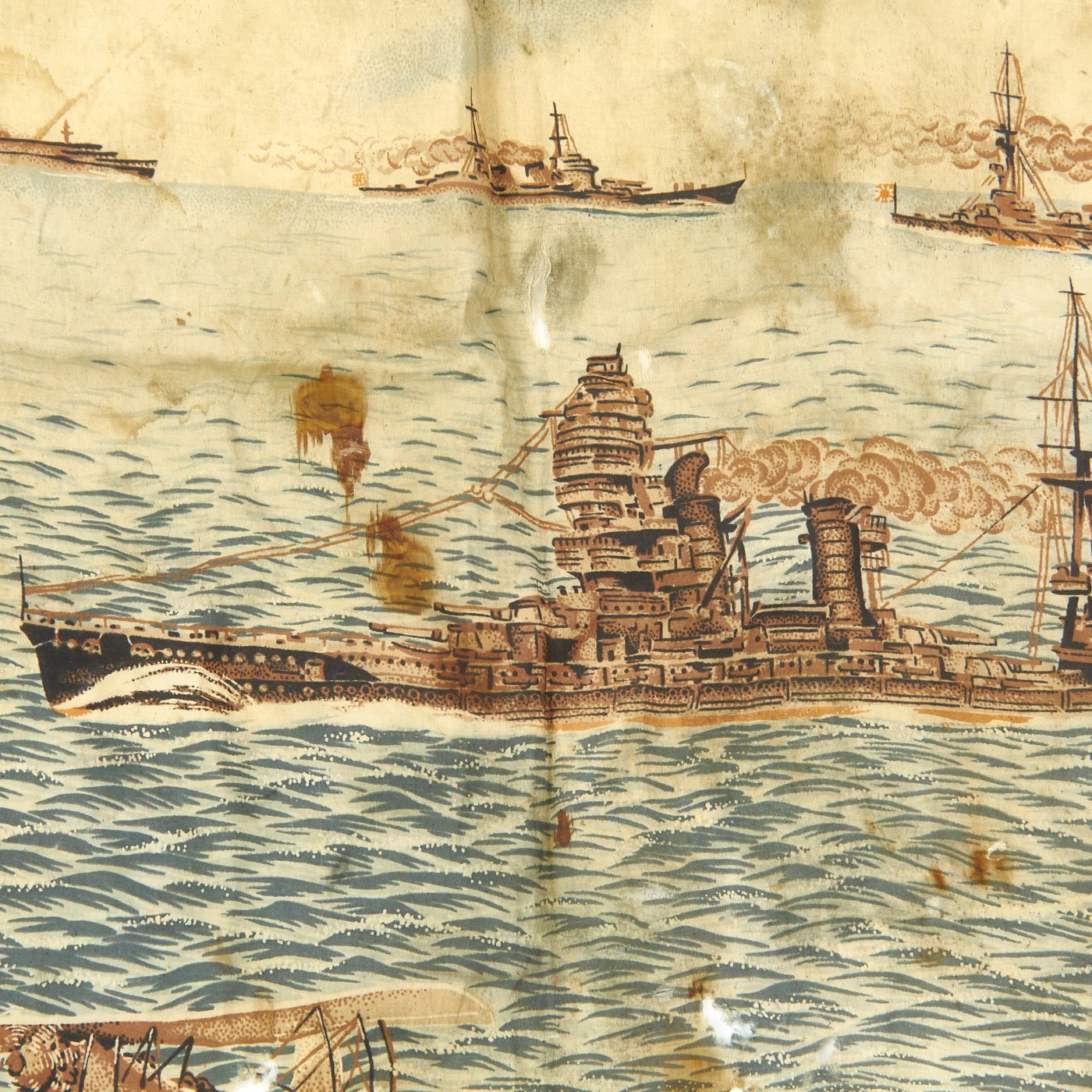 With the headband there is also a very nice decorative Japanese Naval flag, or possibly a bandana of some sort. It measures about 28 inches square, and shows a lovely WWI Era Japanese Naval scene. There is a ship in the middle, with early planes flying overhead, and a "Rising Sun" flag in the upper right corner. The material looks to be silk or rayon. There is some damage and fading, but overall it is a very attractive piece.