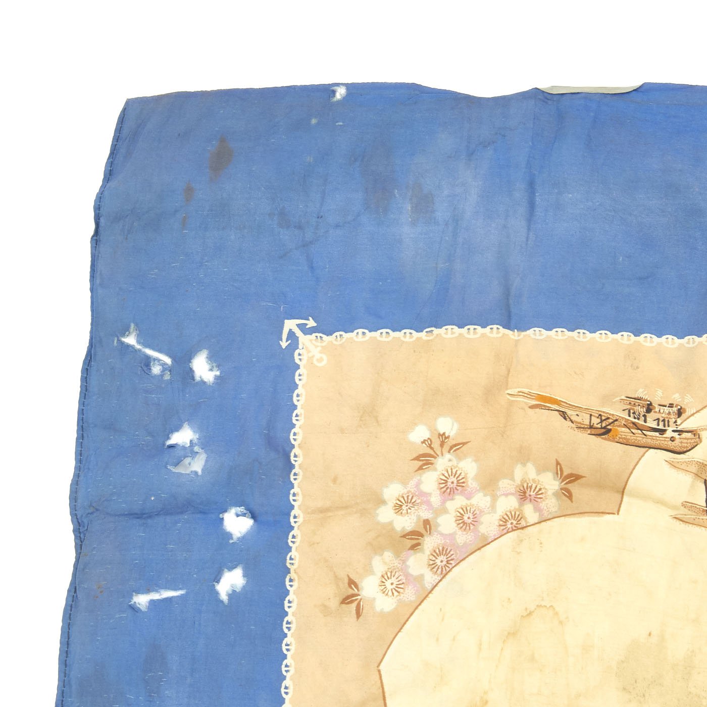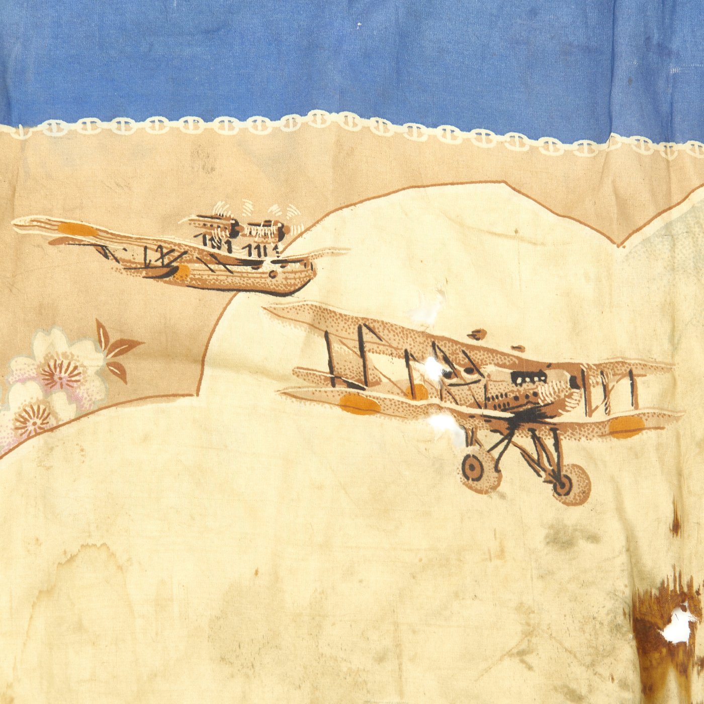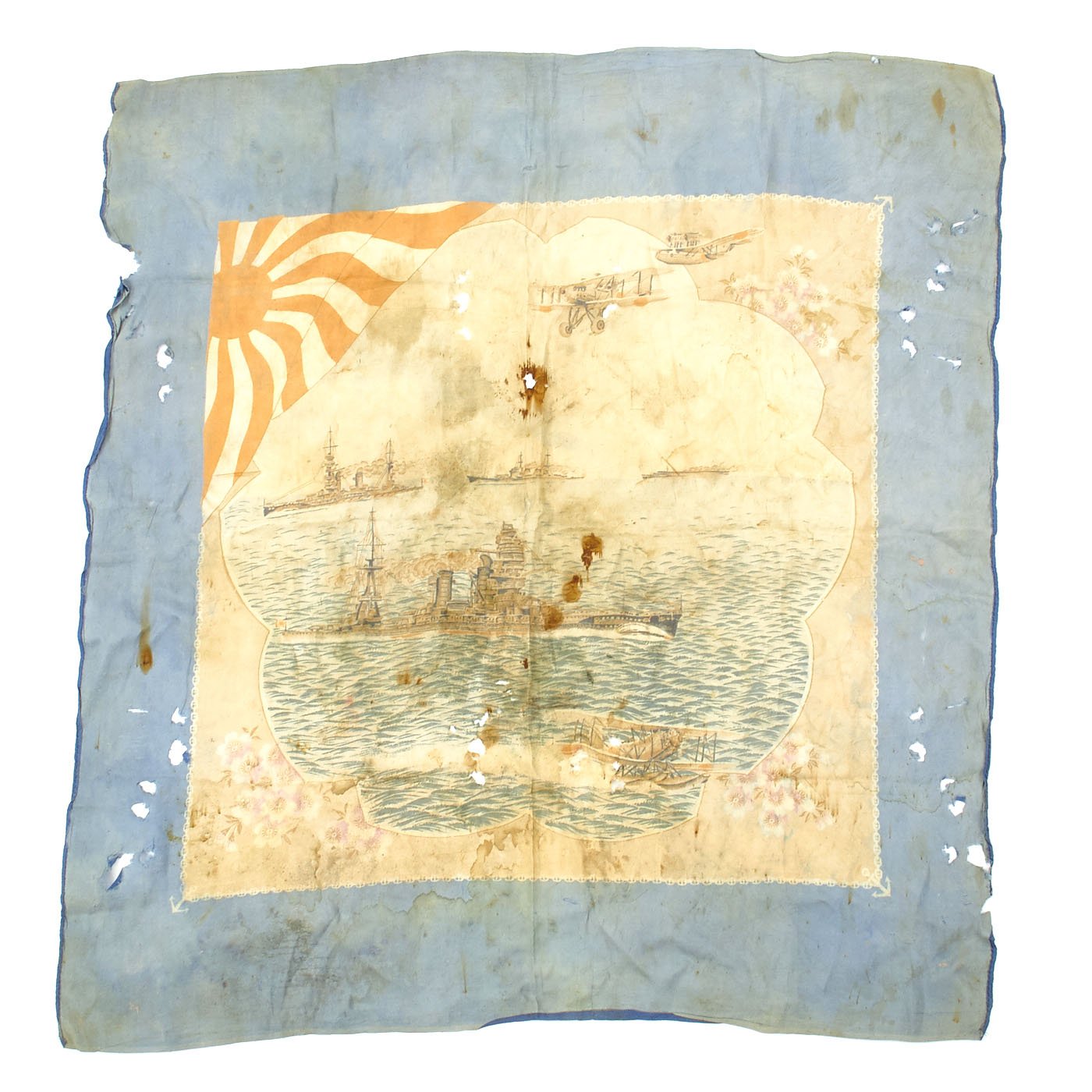 With the headband there is also a very nice decorative Japanese Naval flag, or possibly a bandana of some sort. It measures about 28 inches square, and shows a lovely WWI Era Japanese Naval scene. There is a ship in the middle, with early planes flying overhead, and a "Rising Sun" flag in the upper right corner. The material looks to be silk or rayon. There is some damage and fading, but overall it is a very attractive piece.