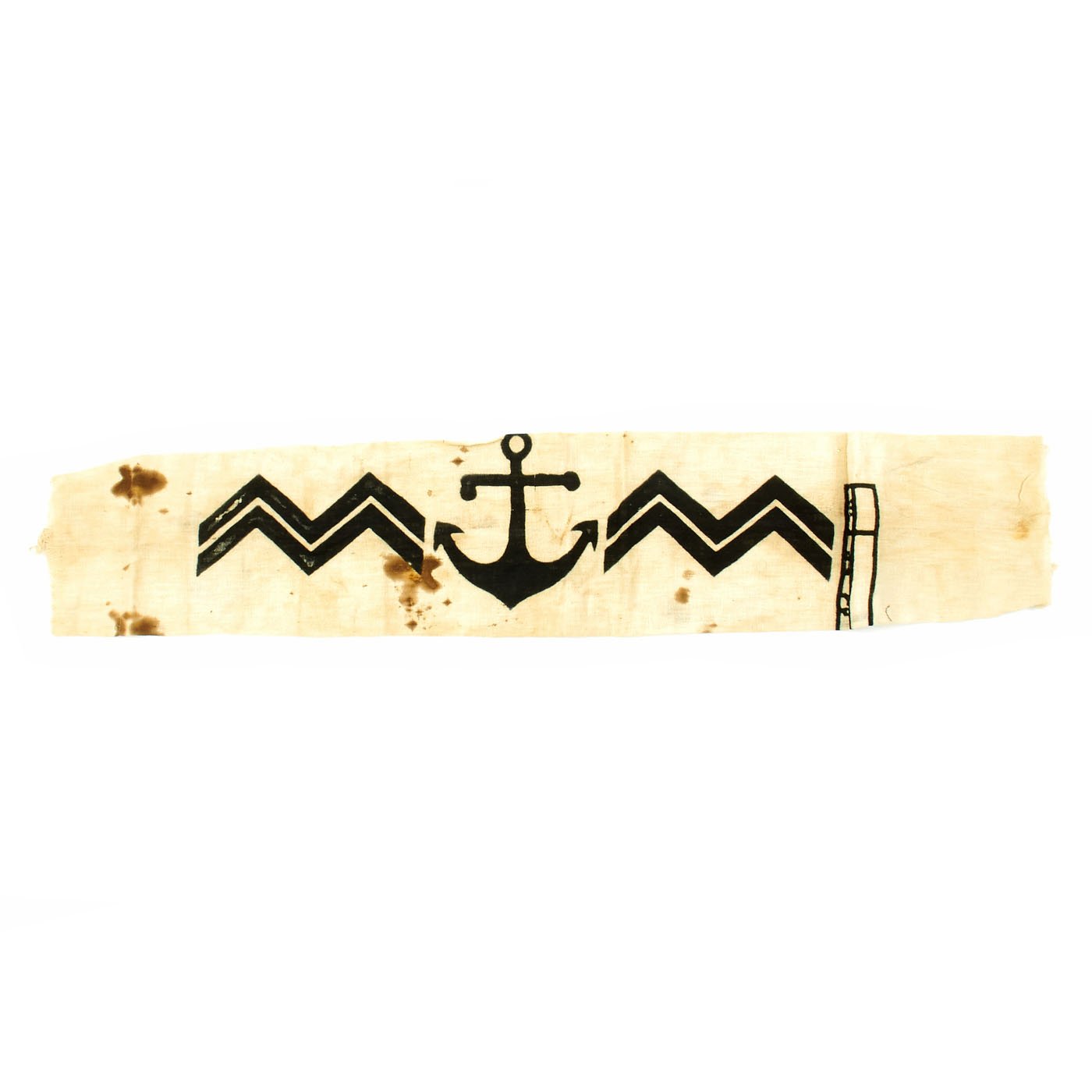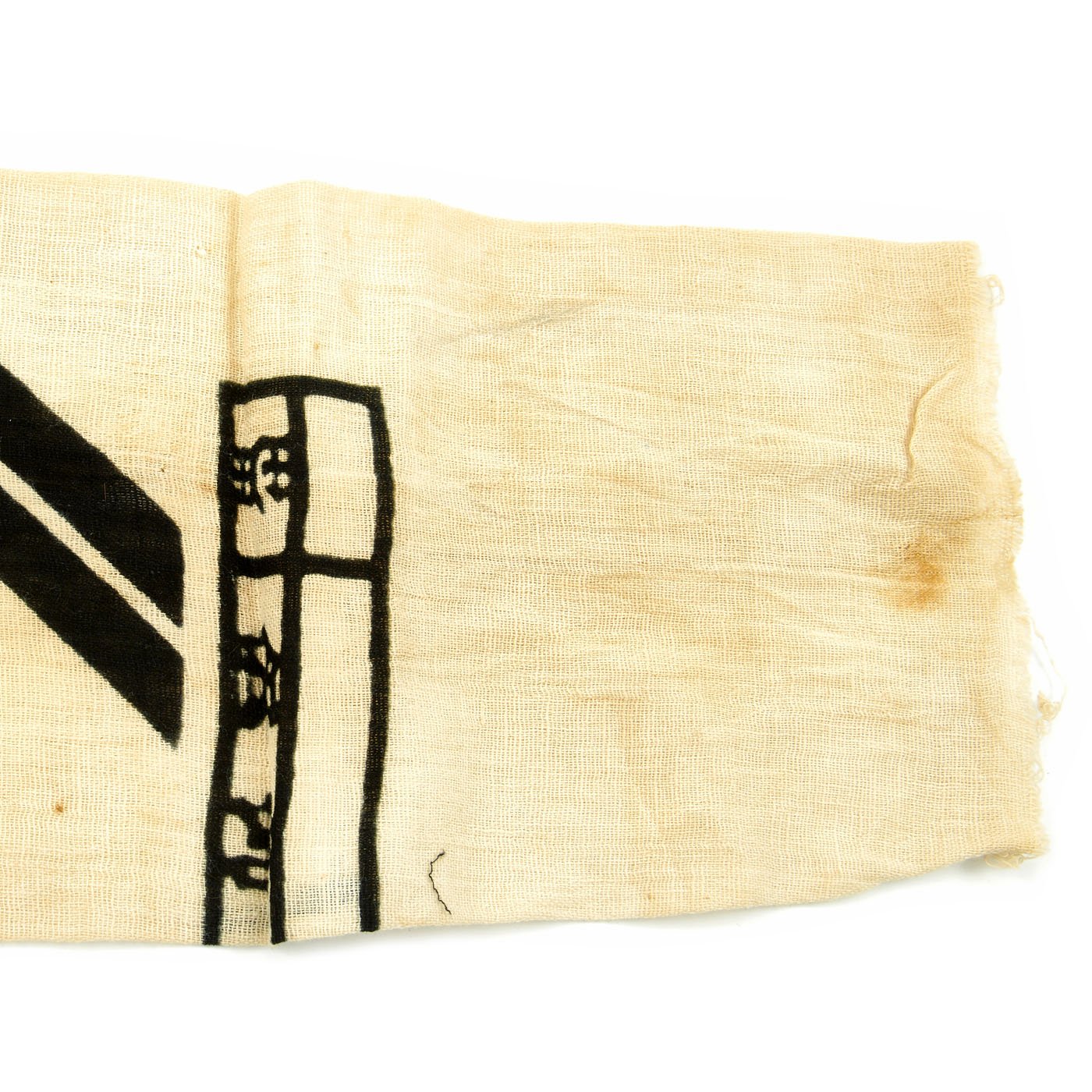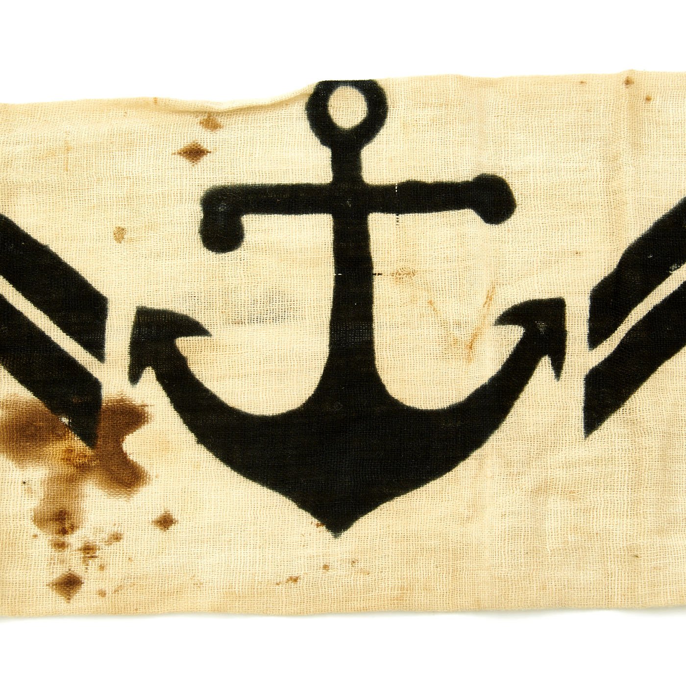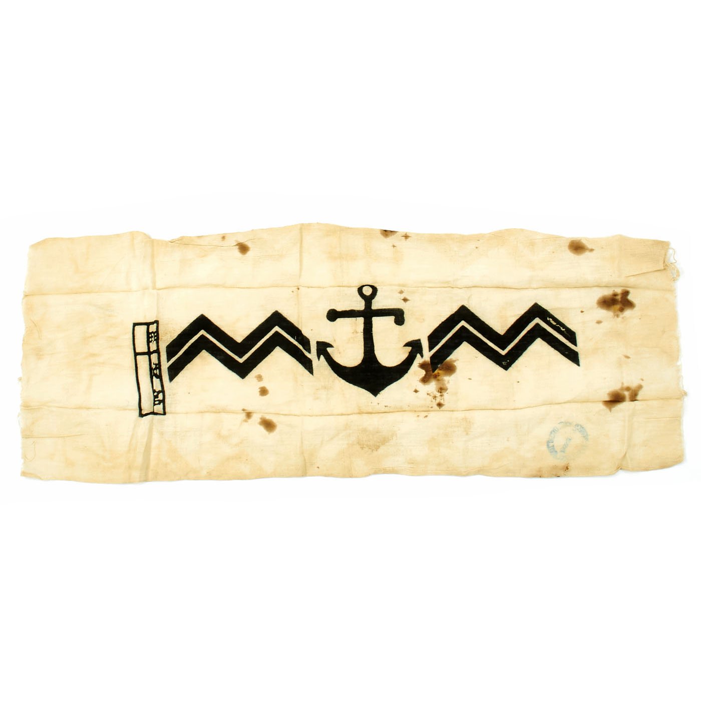 Original Item: Only One Available. This is a World War II Japanese Naval Landing Forces headband or Hachimaki (鉢巻, "helmet-scarf"). It is constructed of linen and printed with an anchor and wave motif at its center and characters within a rectangle to one side. It measures approximately 31" in length and 12" in width.