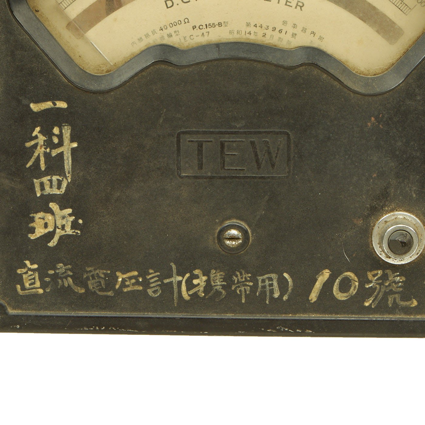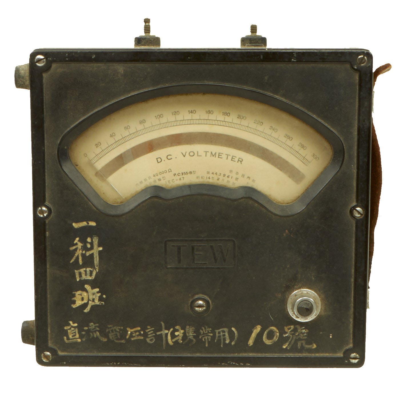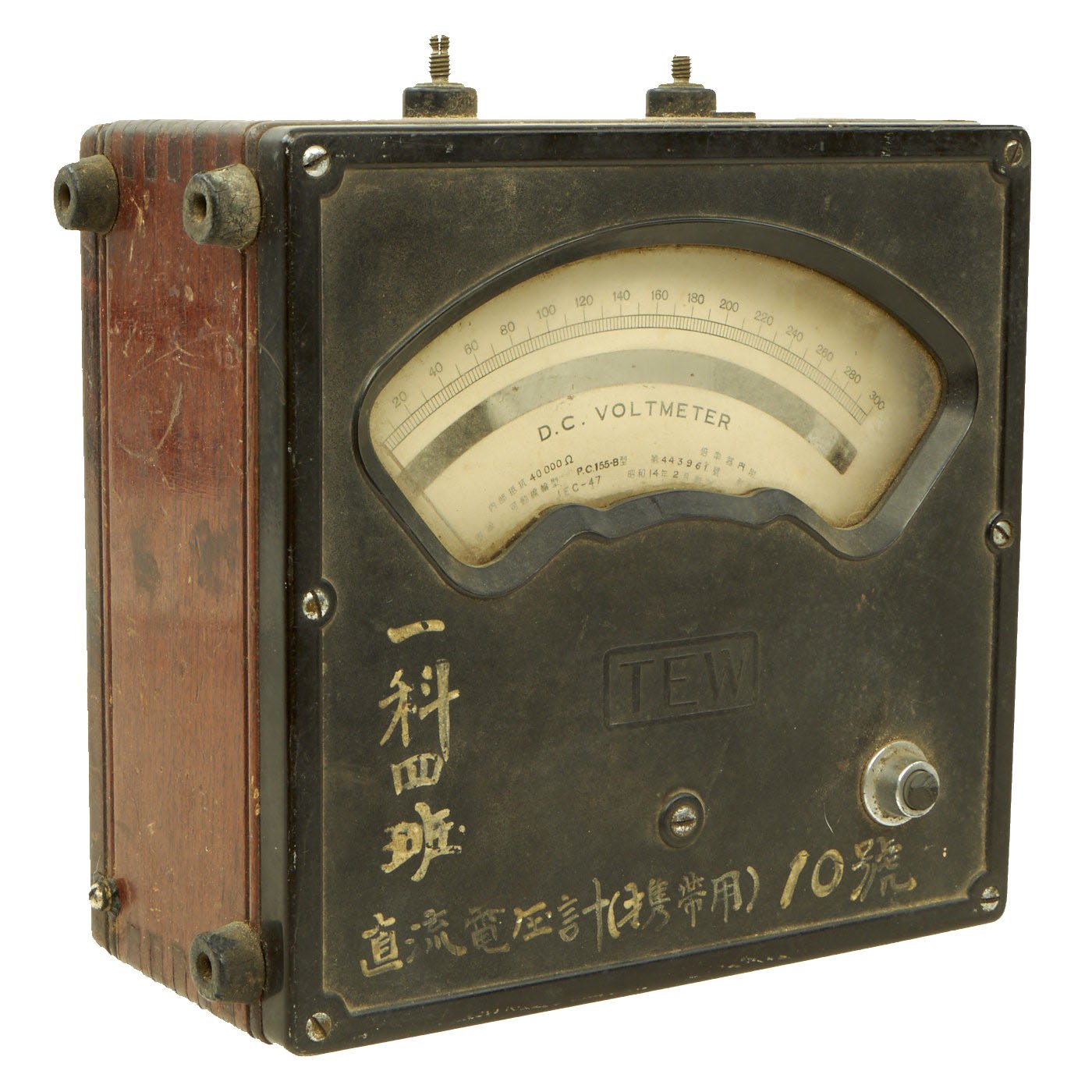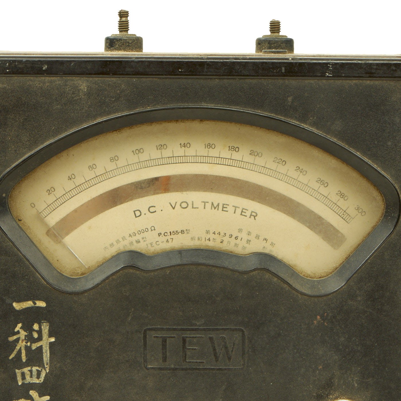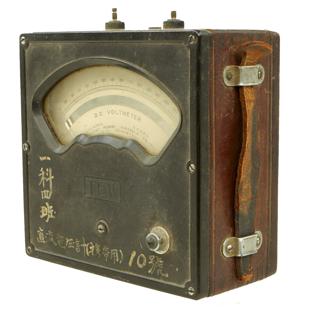 These were widely used by the Imperial Japanese Navy during WWII, as there were numerous electrical circuits and devices on ships that needed routine maintenance and repair. This example looks to possibly be civilian issue, then used for use in WWII. There are numerous kanji markings on the front and on the side of the wooden housing, which we unfortunately are unable to read. It reads up to 300 Volts, and is marked TEW in a rectangle on the front. It has attachment points for leads on the top, however the knurled nuts are missing. It has a push button on the front that we assume takes a measurement. It measures approximately 7" x 7" 4", including the feet and top button.