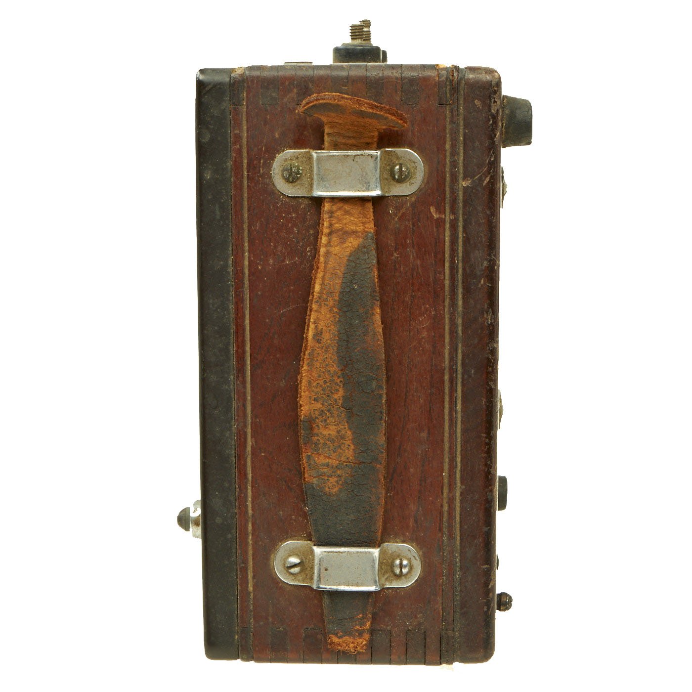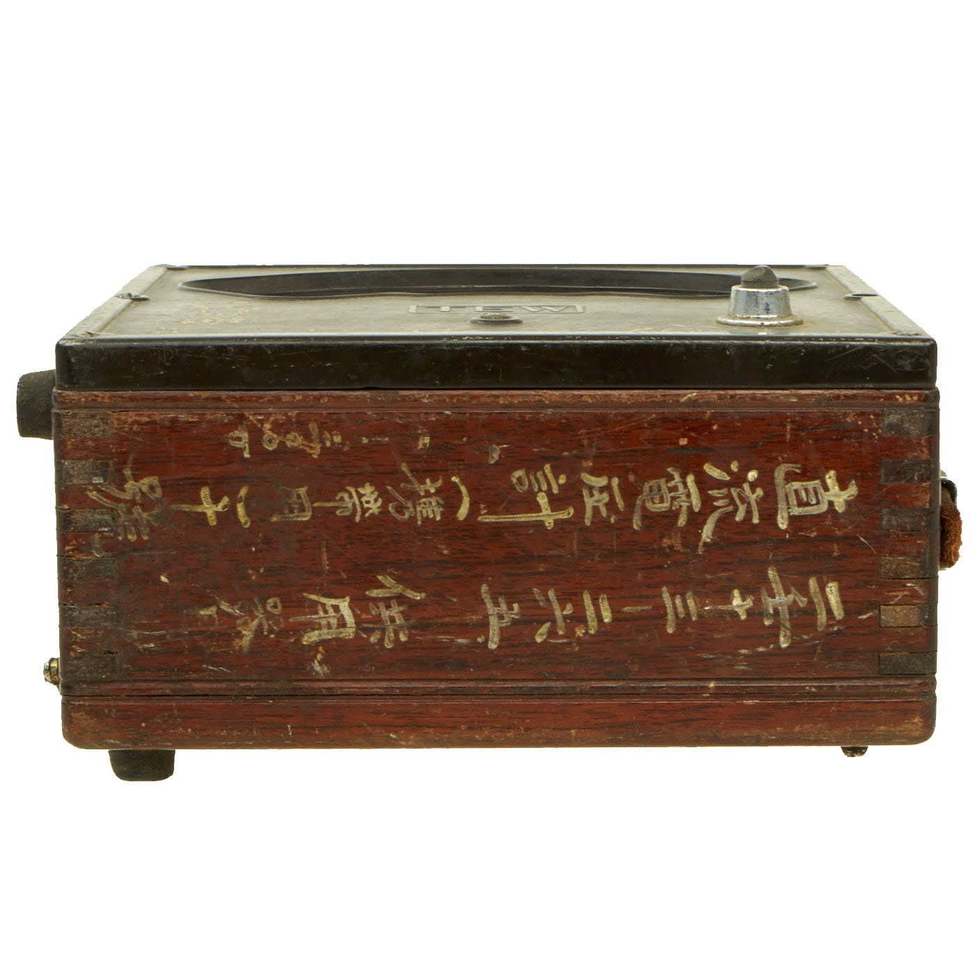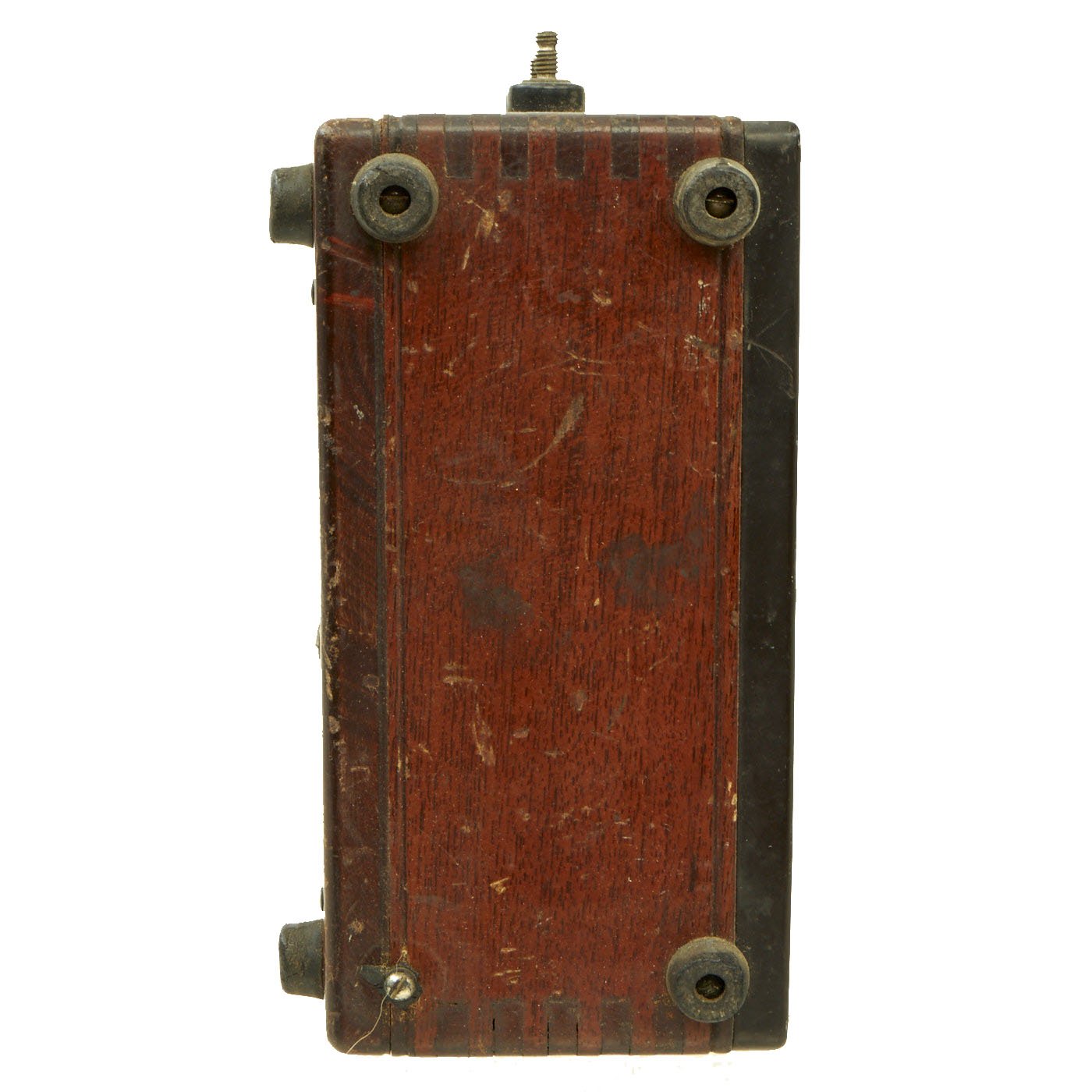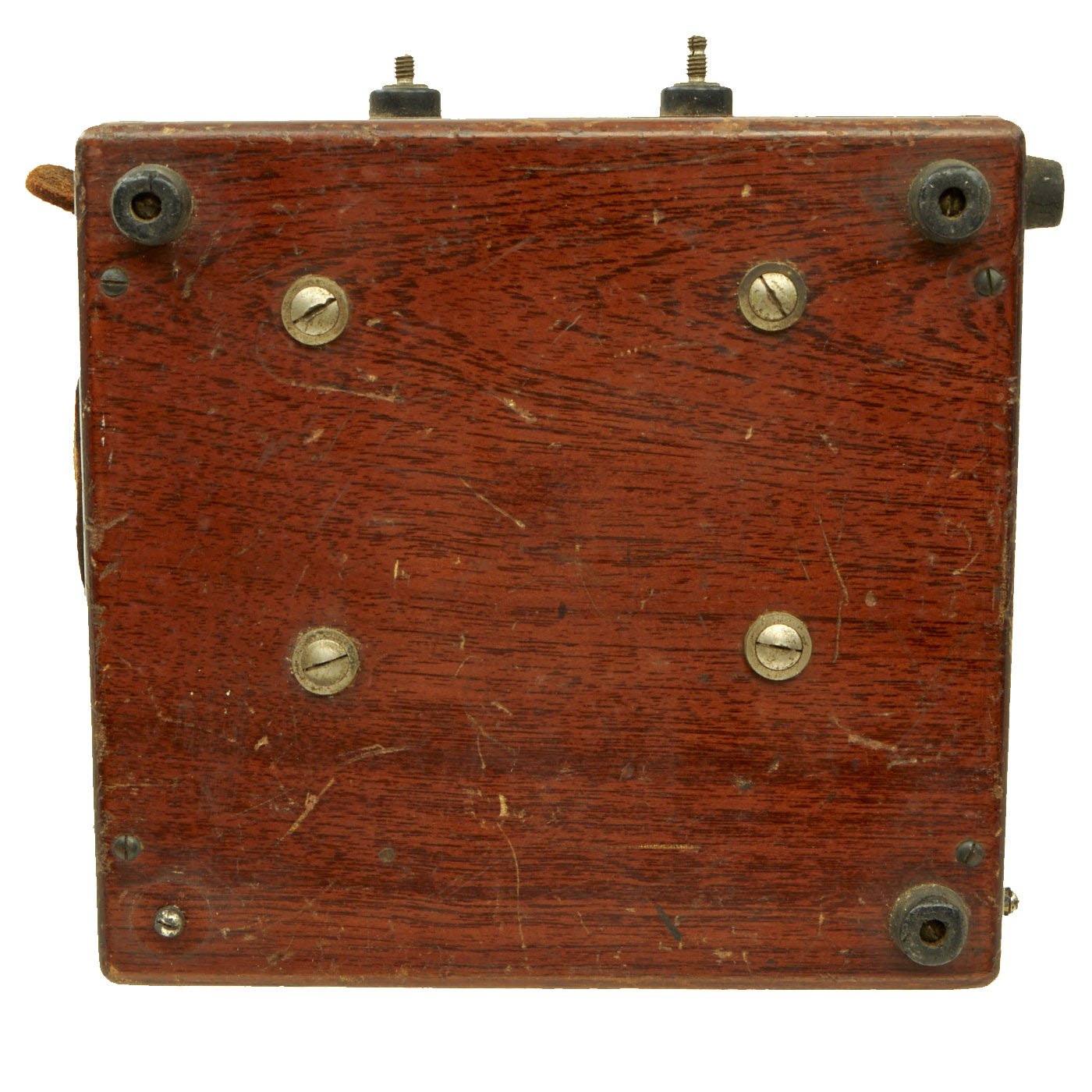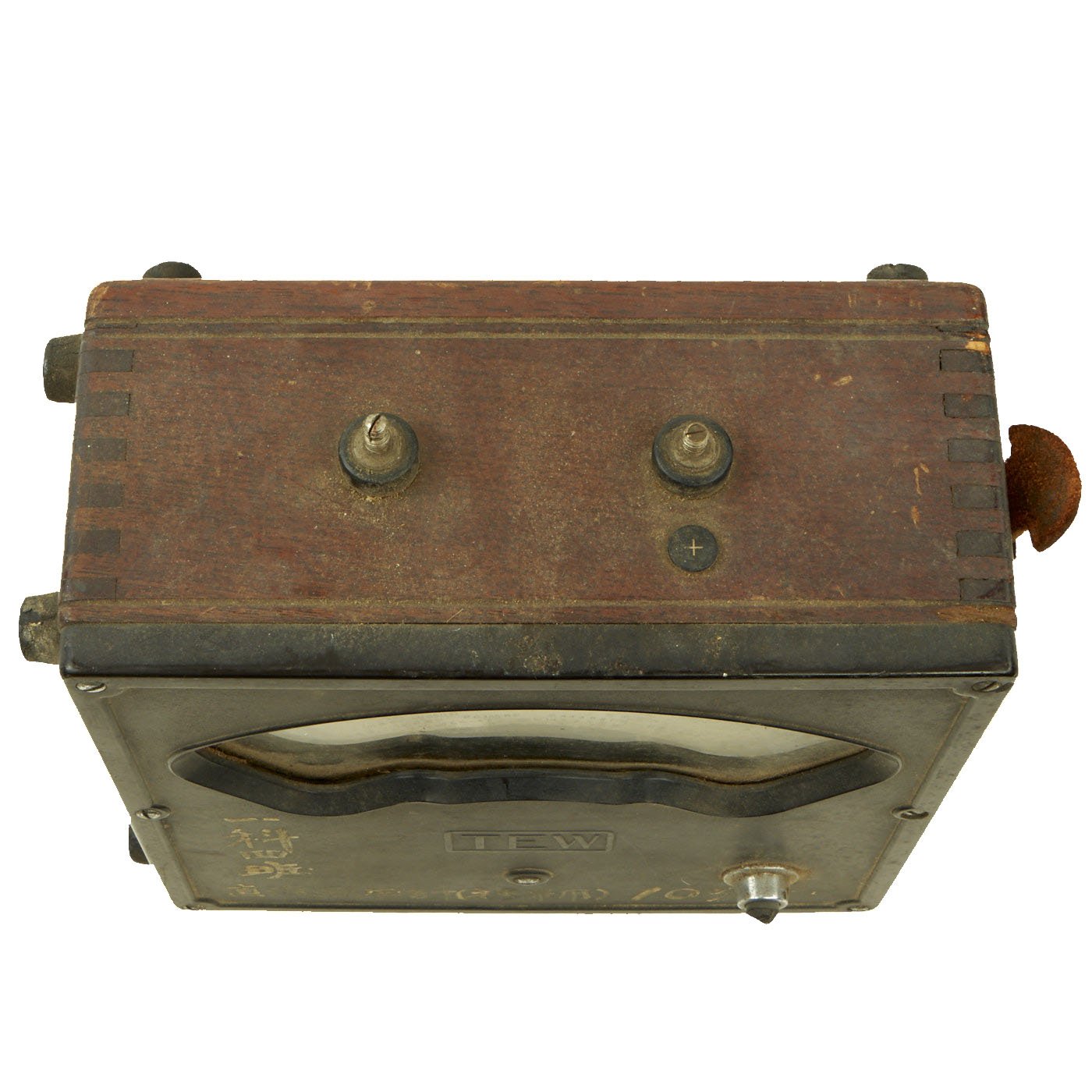 These were widely used by the Imperial Japanese Navy during WWII, as there were numerous electrical circuits and devices on ships that needed routine maintenance and repair. This example looks to possibly be civilian issue, then used for use in WWII. There are numerous kanji markings on the front and on the side of the wooden housing, which we unfortunately are unable to read. It reads up to 300 Volts, and is marked TEW in a rectangle on the front. It has attachment points for leads on the top, however the knurled nuts are missing. It has a push button on the front that we assume takes a measurement. It measures approximately 7" x 7" 4", including the feet and top button.