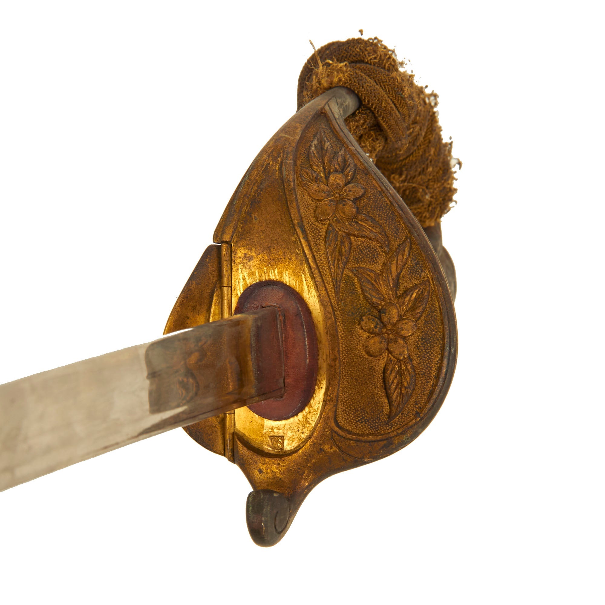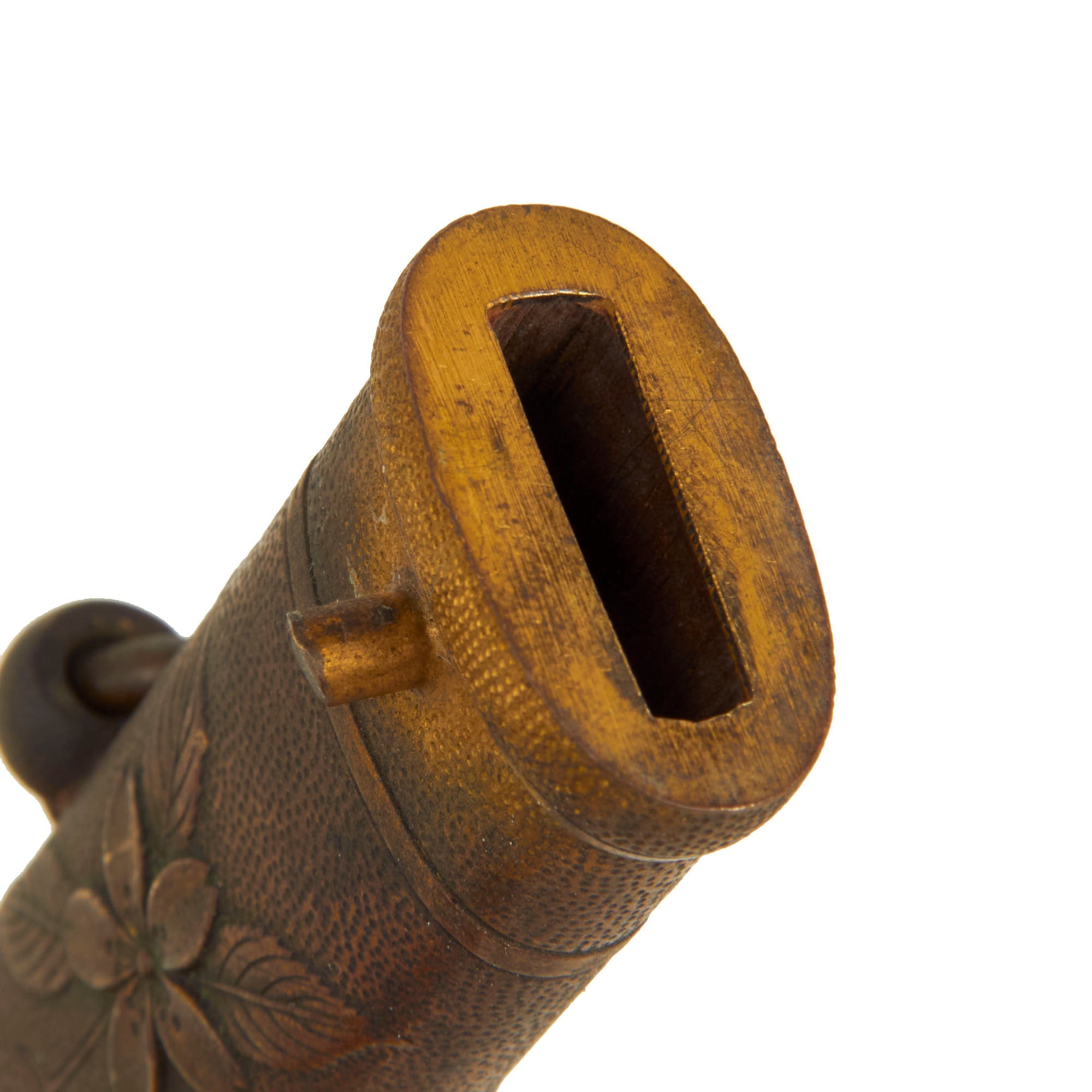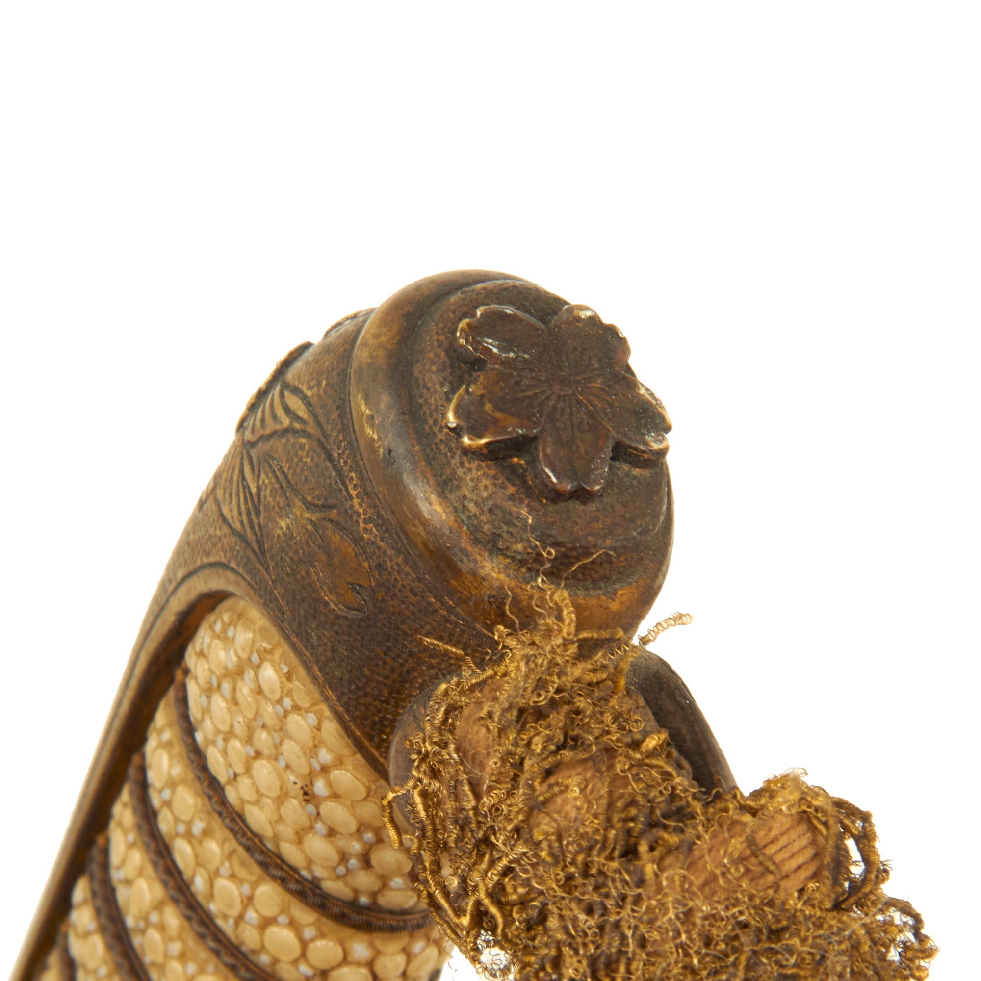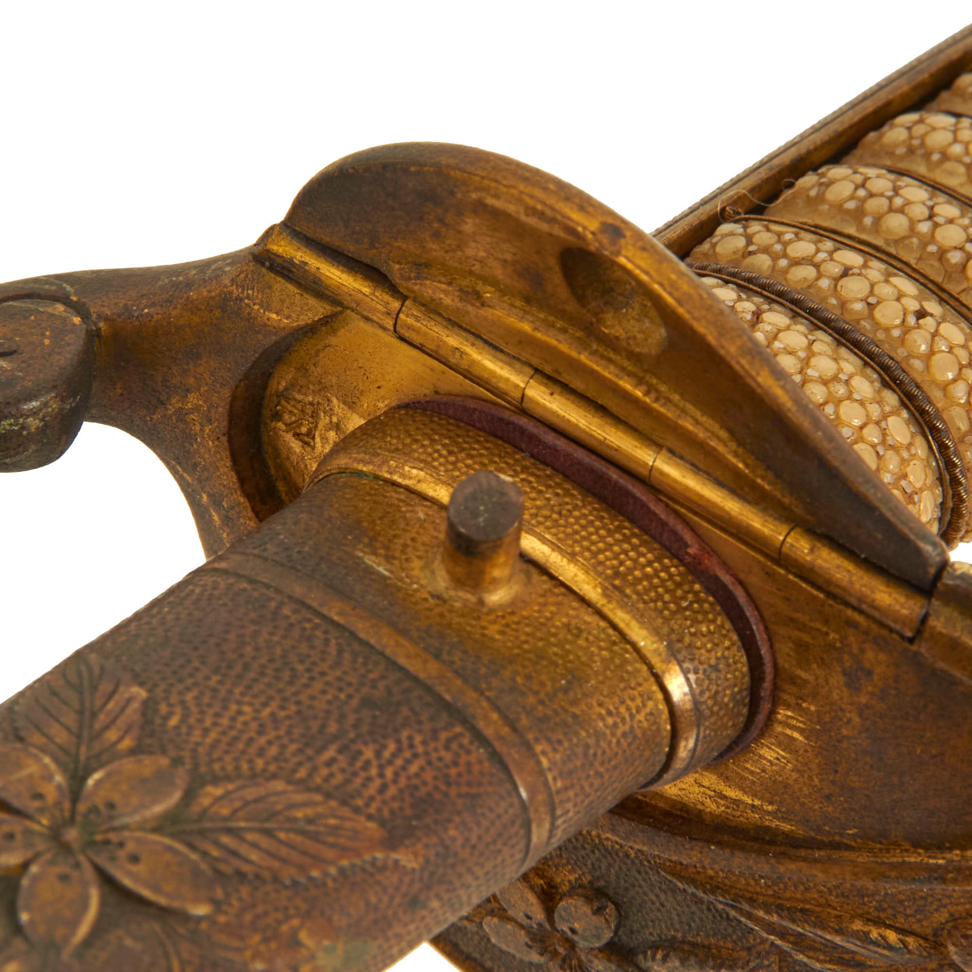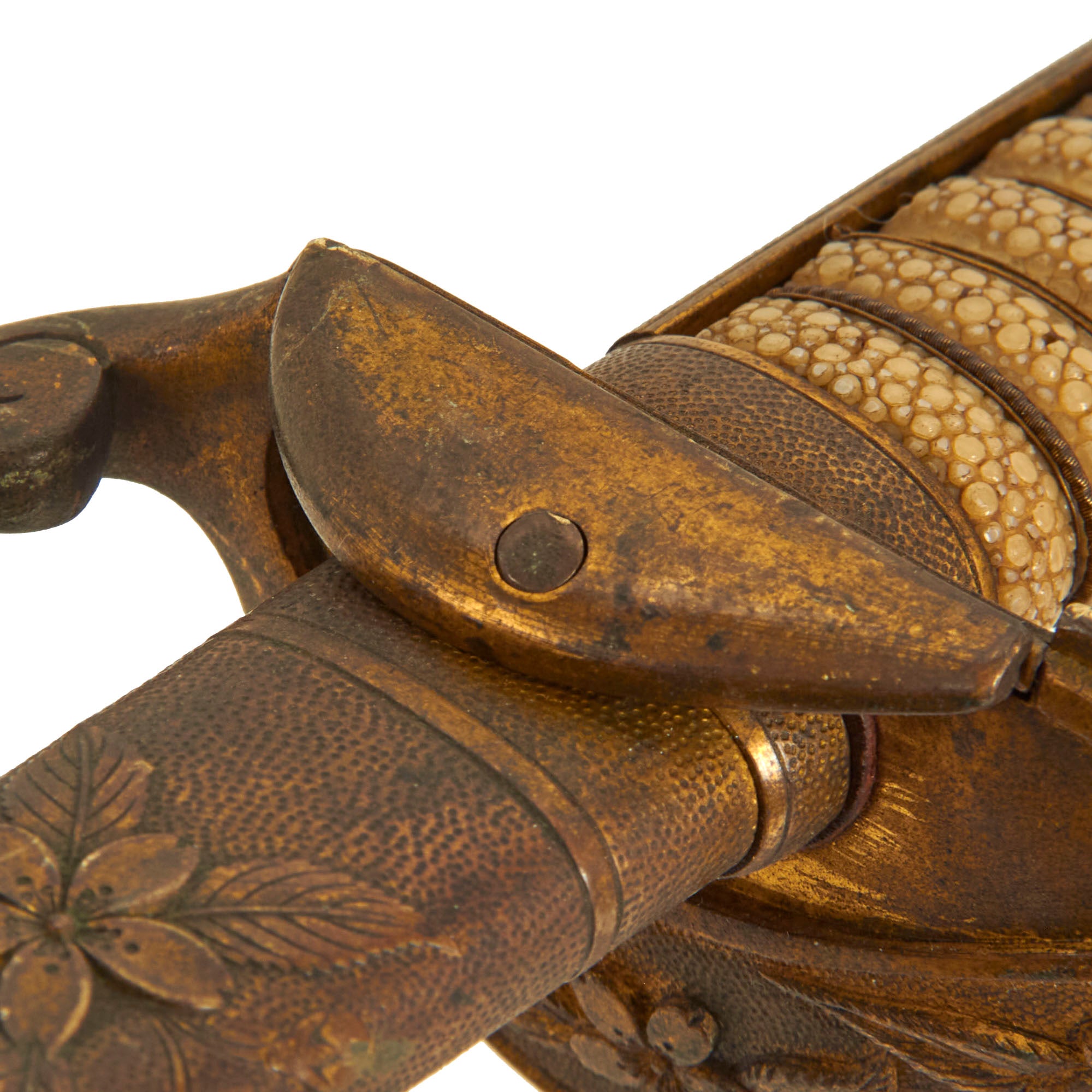 The hand and crossguard have some areas where the gilding is intact, especially on the blade side, with the rest having a nicely worn and polished brass patina. There are several 5 petal cherry blossom motifs on the hilt, as is correct for the pattern. It has the standard European-style "D" guard, as well as a very nice stingray skin (same) grip, with the original brass wire binding mostly intact. There is also a fold down guard on the hilt, which locks onto a tab on the scabbard. The blade has just a bit of wobble in the hilt, as we usually see. The sword knot is present but in rather delicate condition, so do handle with care.