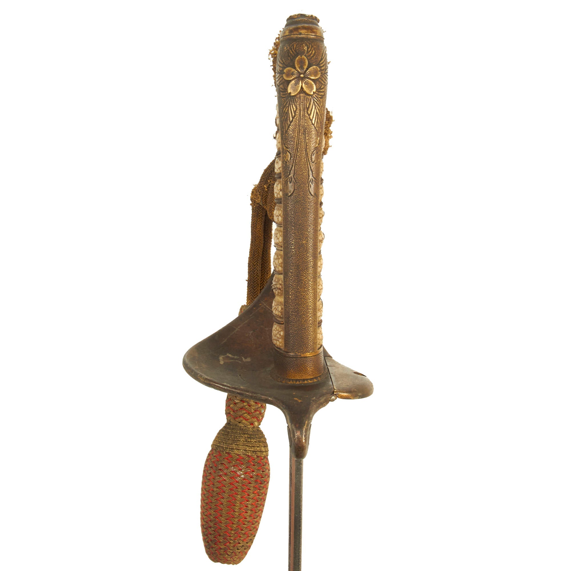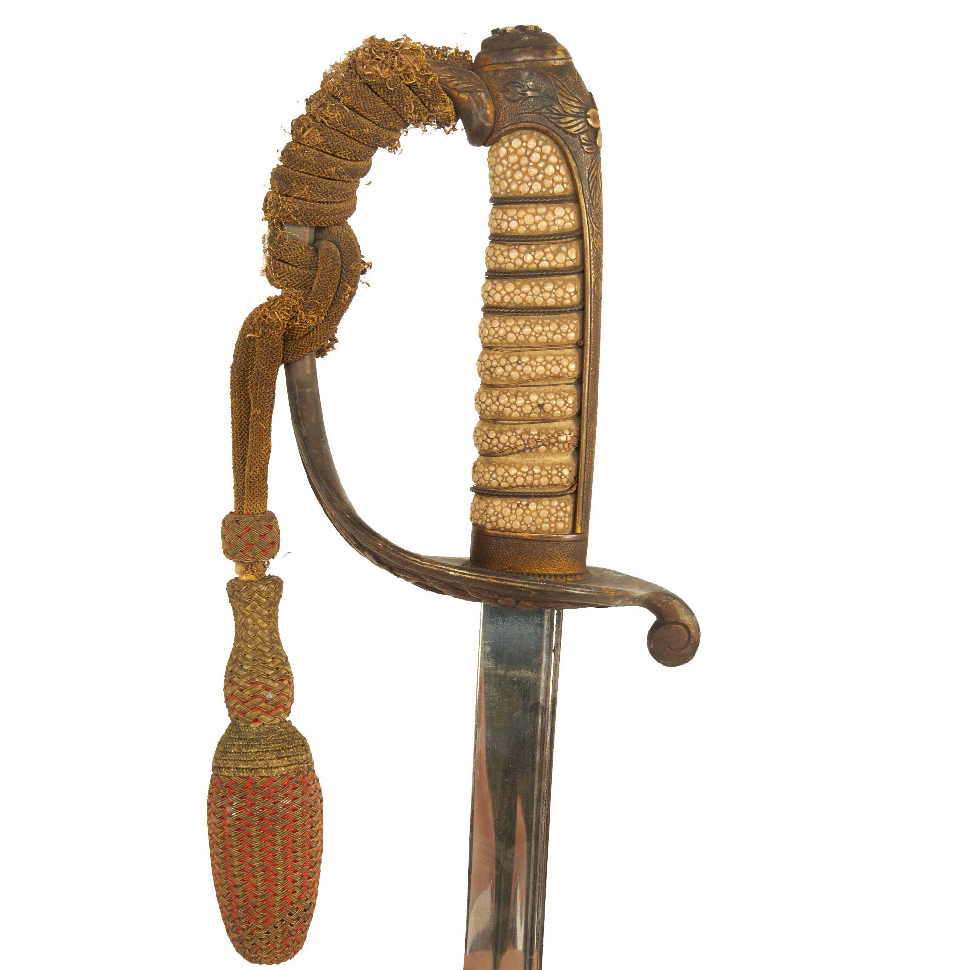 This is an excellent example of a Navy Officer Kyu-Gunto, complete with a brass fit leather parade scabbard. Like their western counterparts, officer's swords such as these were produced with a more ornate "parade" scabbard, and a steel "field" scabbard. This sword was produced prior to WWII or during the early war period, before the fittings were switched to aluminum, and construction simplified. The 26 3/4" blade on this example is machine-made, and fully nickel plated. The blade is in pretty much unissued condition, with full nickel plating, and just a bit of speckling near the hilt.