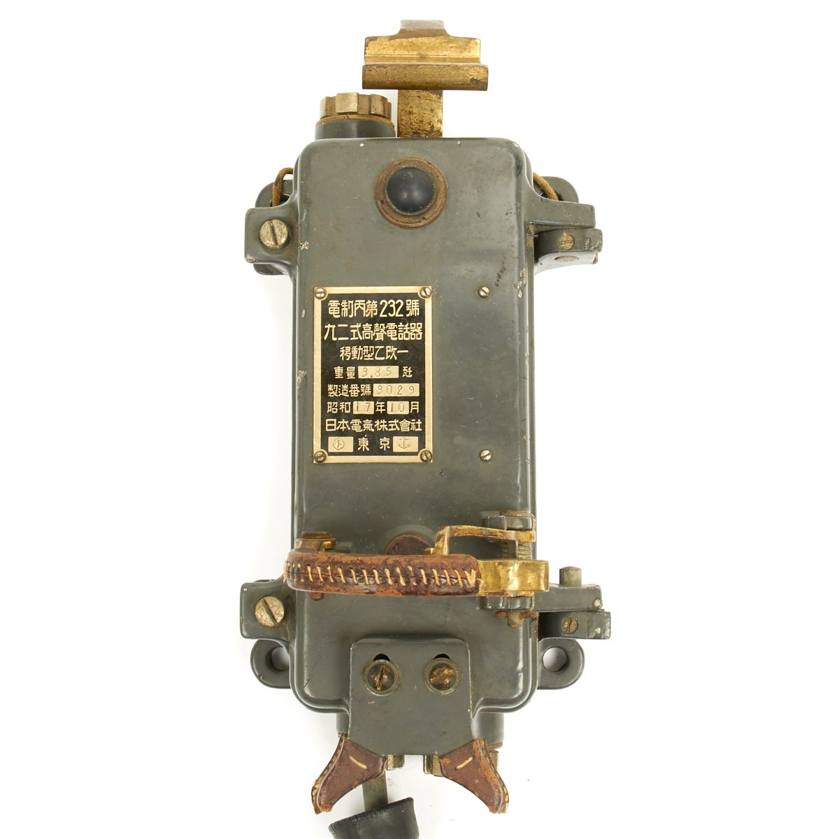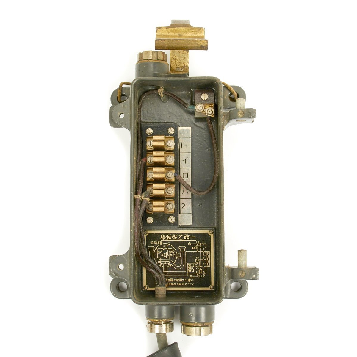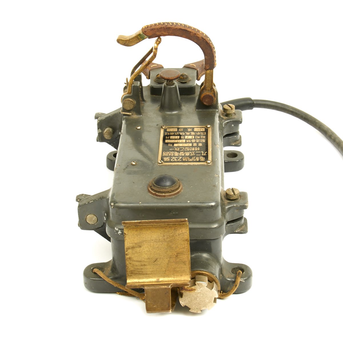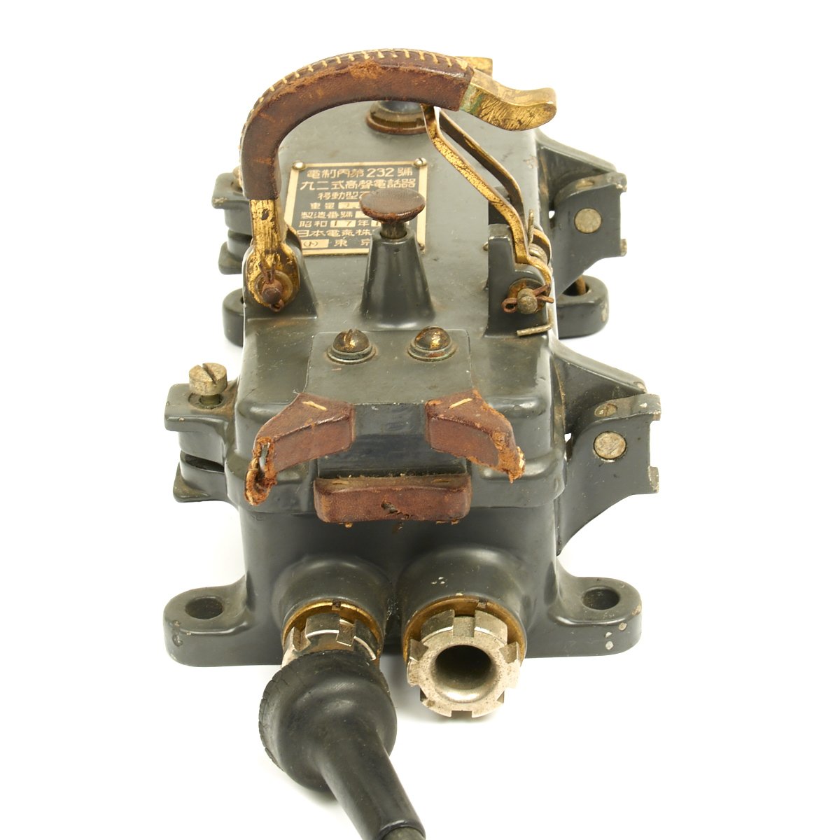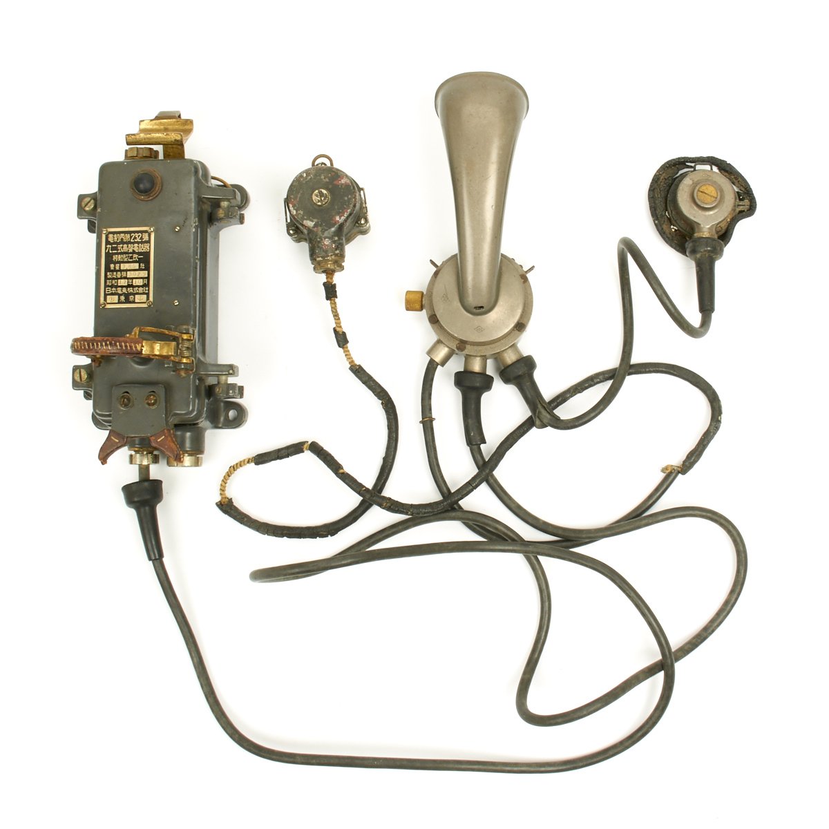 There is a nomenclature data plate mounted to the body of the casing and triple hub the connects a speaking horn and two receivers. Portions of the black rubber cord are fragmented and chipping, but only one connecting wire of four is actually broken. Internals all seem to be present. A great display piece and very well made. Japanese Imperial Navy items are very difficult to find.