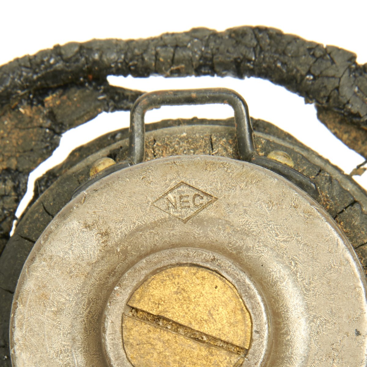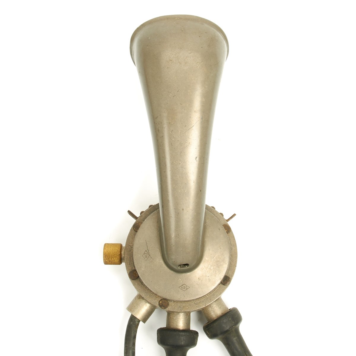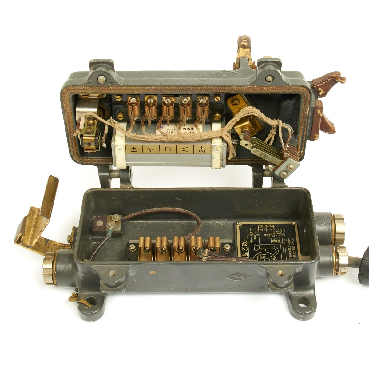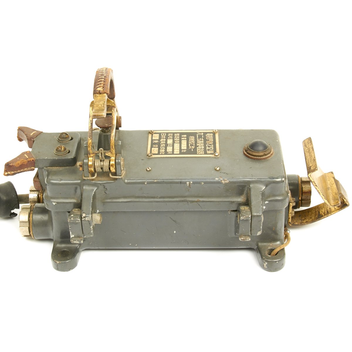 There is a nomenclature data plate mounted to the body of the casing and triple hub the connects a speaking horn and two receivers. Portions of the black rubber cord are fragmented and chipping, but only one connecting wire of four is actually broken. Internals all seem to be present. A great display piece and very well made. Japanese Imperial Navy items are very difficult to find.