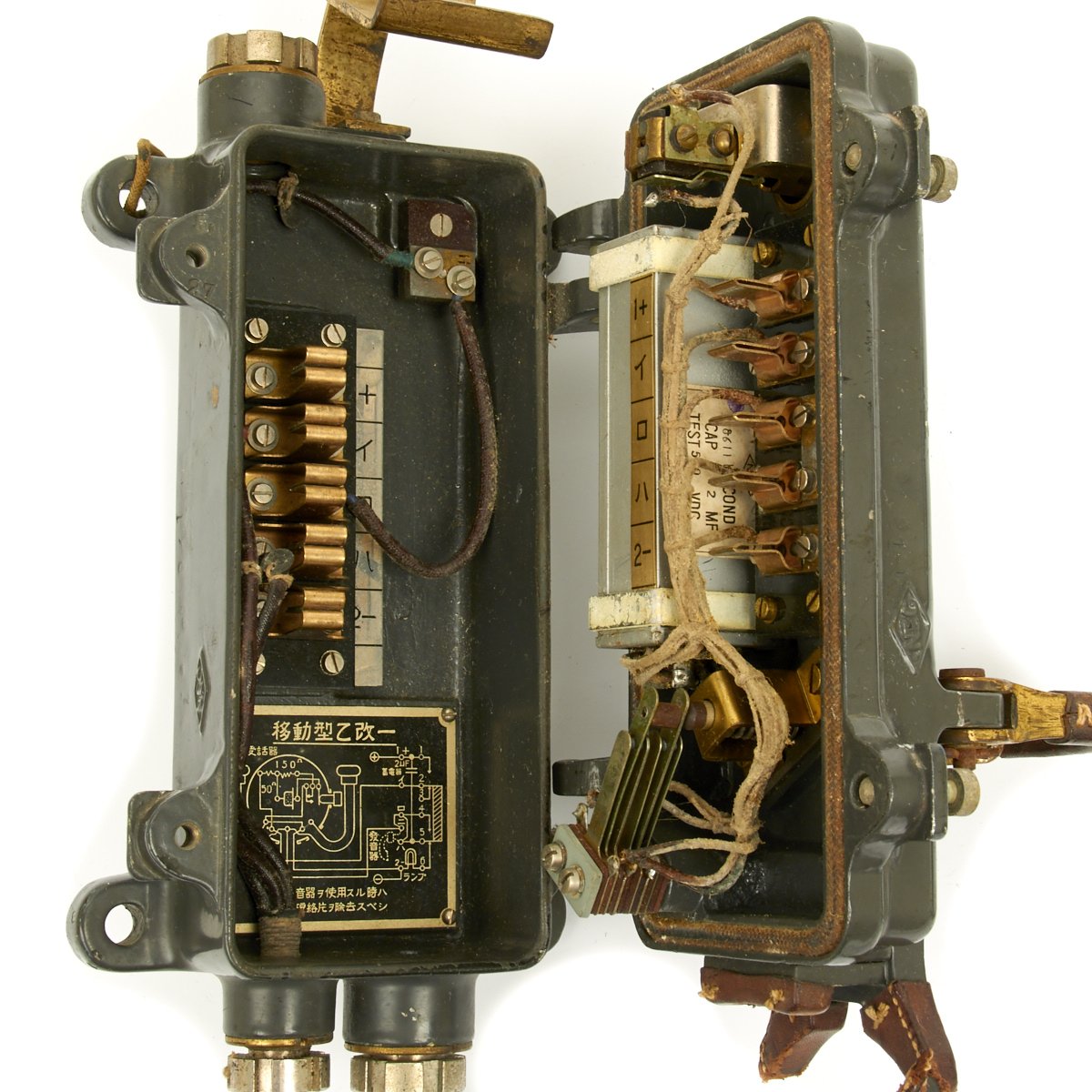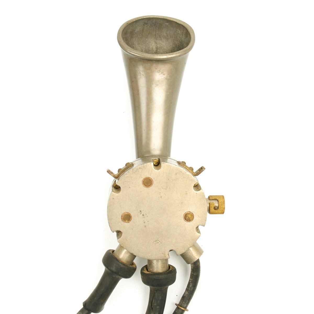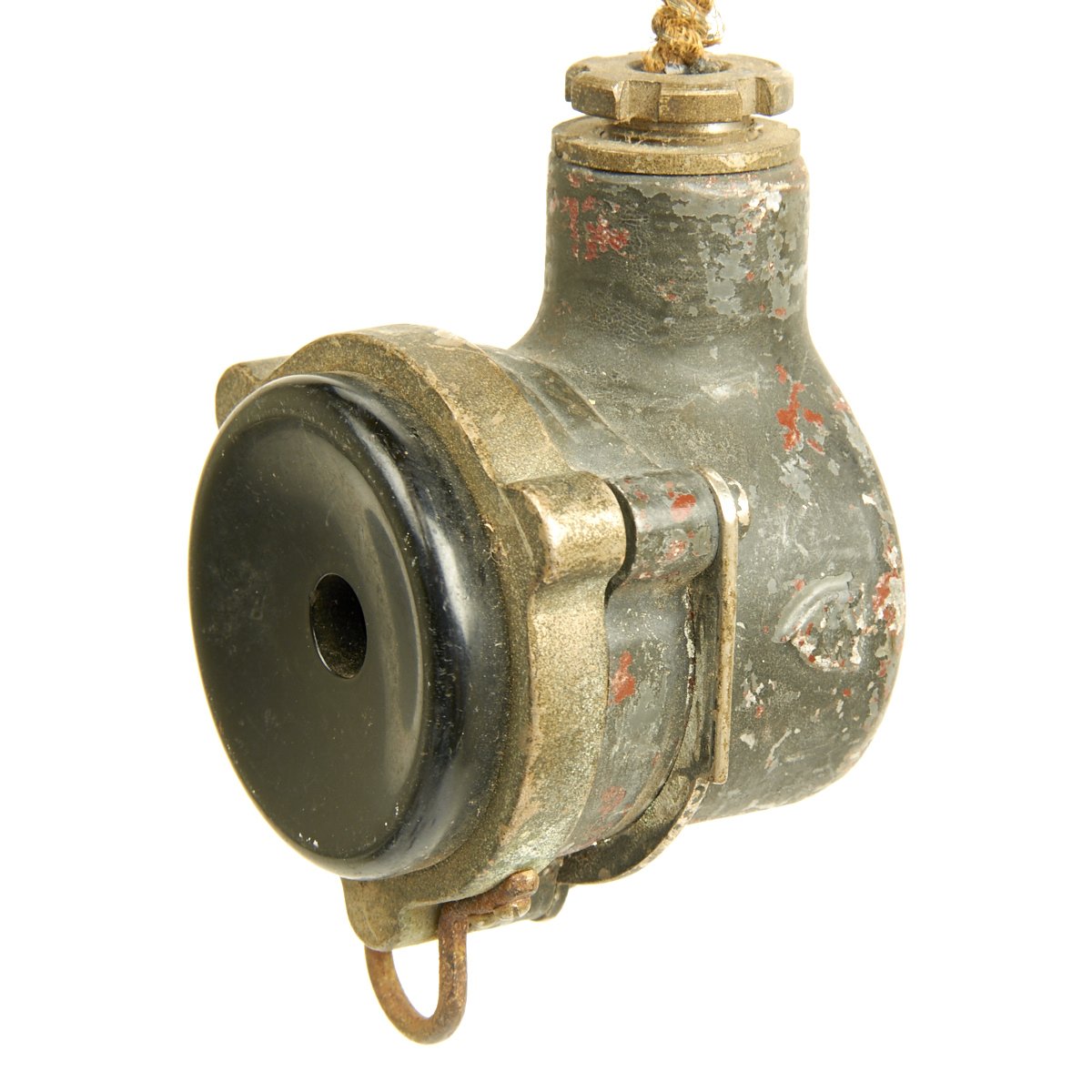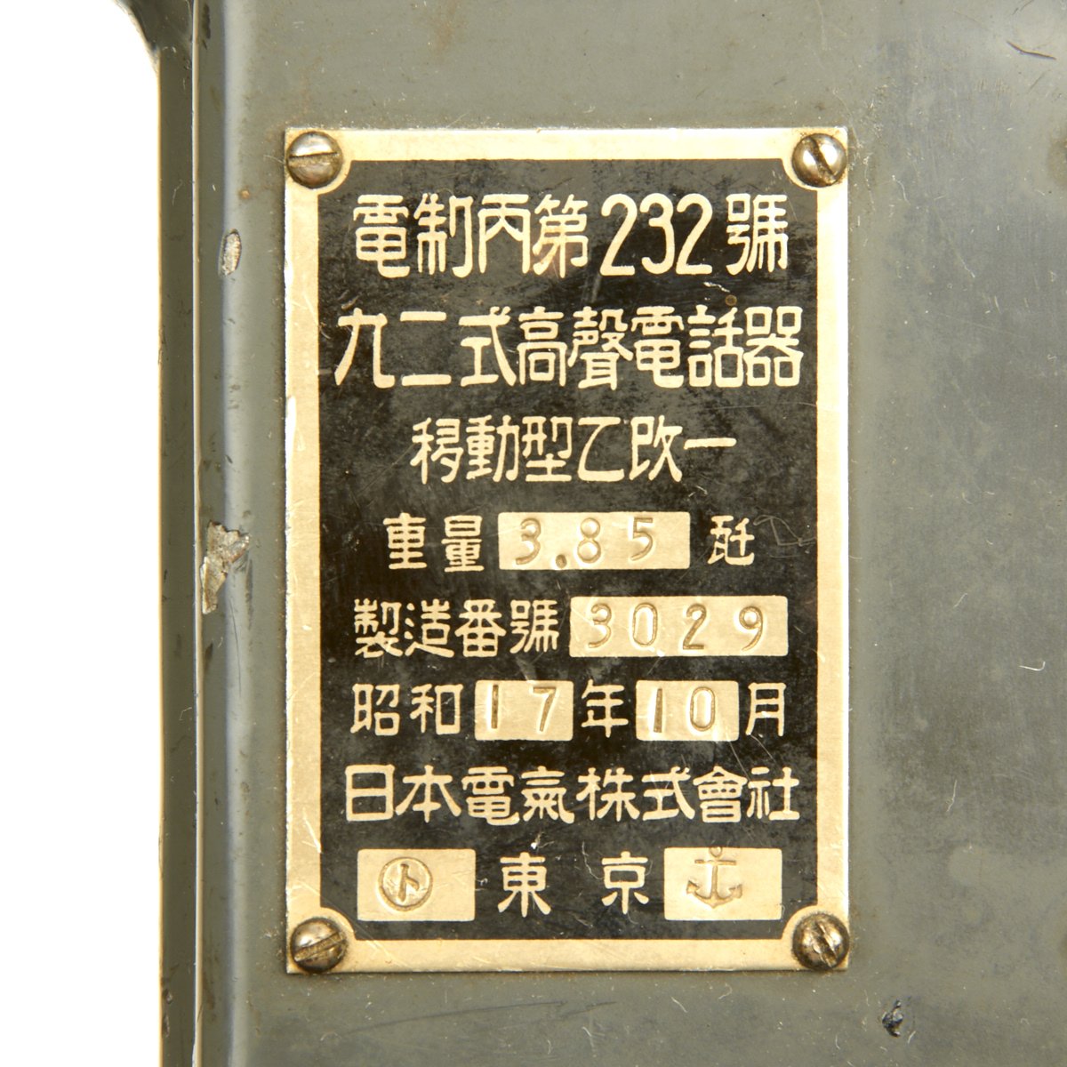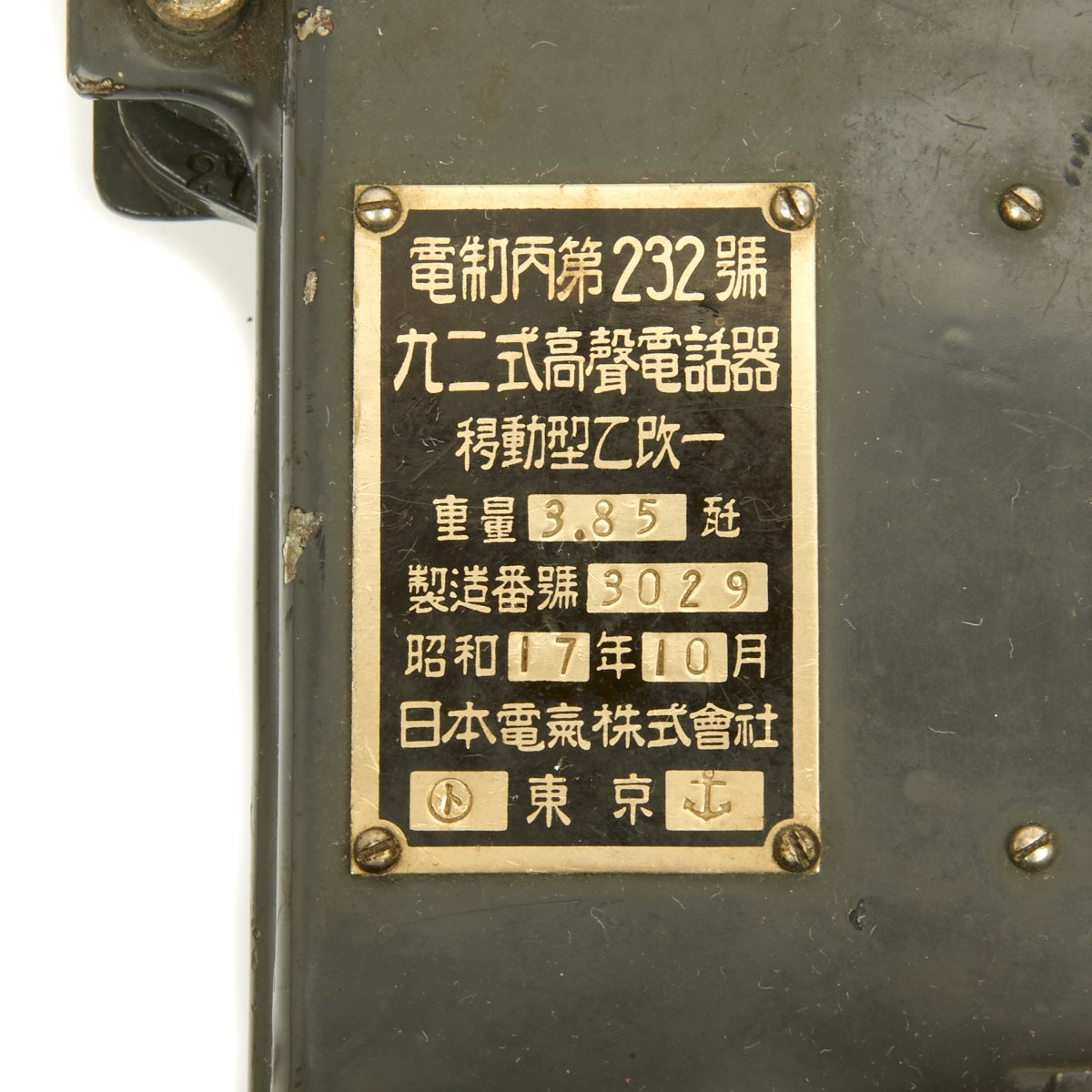 There is a nomenclature data plate mounted to the body of the casing and triple hub the connects a speaking horn and two receivers. Portions of the black rubber cord are fragmented and chipping, but only one connecting wire of four is actually broken. Internals all seem to be present. A great display piece and very well made. Japanese Imperial Navy items are very difficult to find.