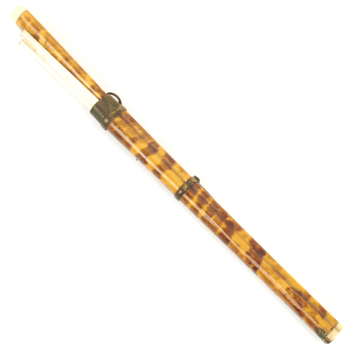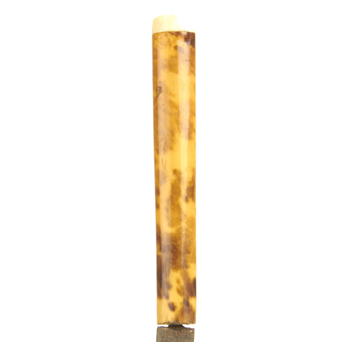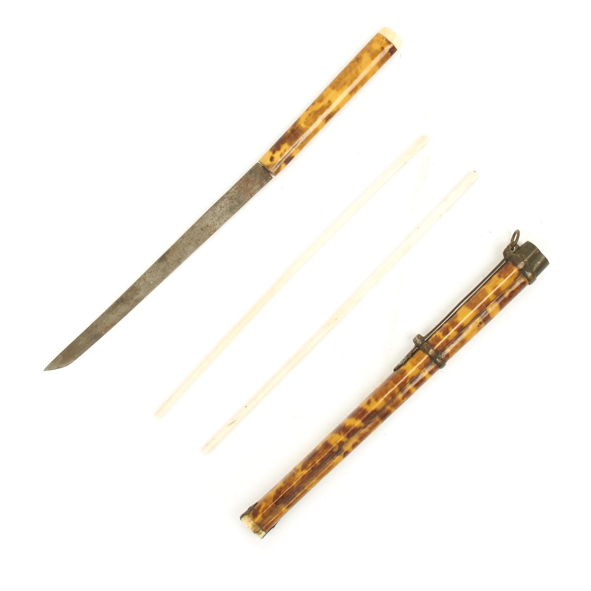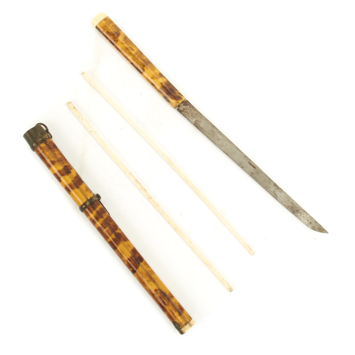 This is the third set we have offered, and it is 11 1/2" overall length. The case is made of of lacquered wood in a most attractive color combination of amber with mid brown spots. It has a small TANTO style knife with a 6 1/2" blade and a lacquered hilt to match the Case (Trousse). It also contains a pair of slim ivory or bone chopsticks. A very pleasing set.
