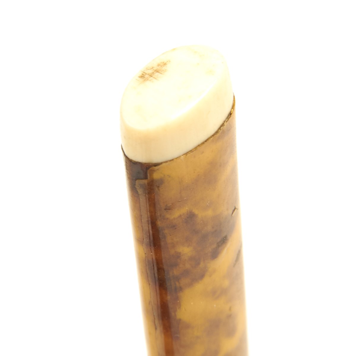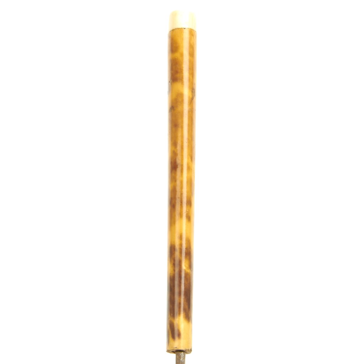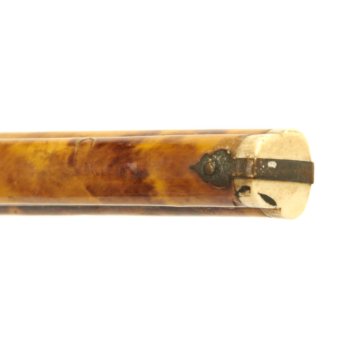 This is the third set we have offered, and it is 11 1/2" overall length. The case is made of of lacquered wood in a most attractive color combination of amber with mid brown spots. It has a small TANTO style knife with a 6 1/2" blade and a lacquered hilt to match the Case (Trousse). It also contains a pair of slim ivory or bone chopsticks. A very pleasing set.