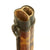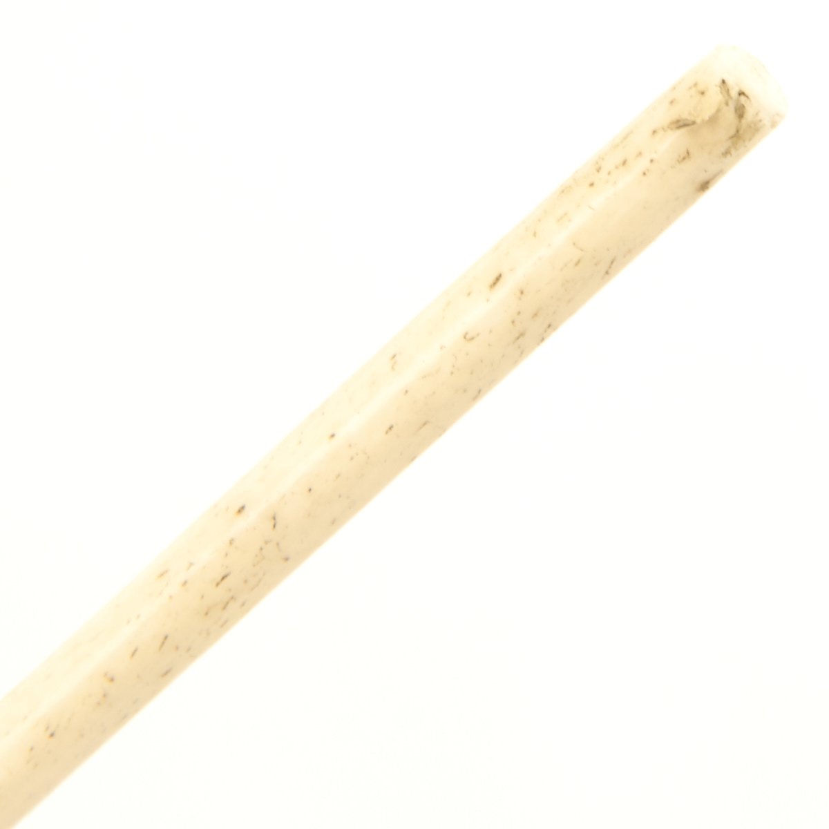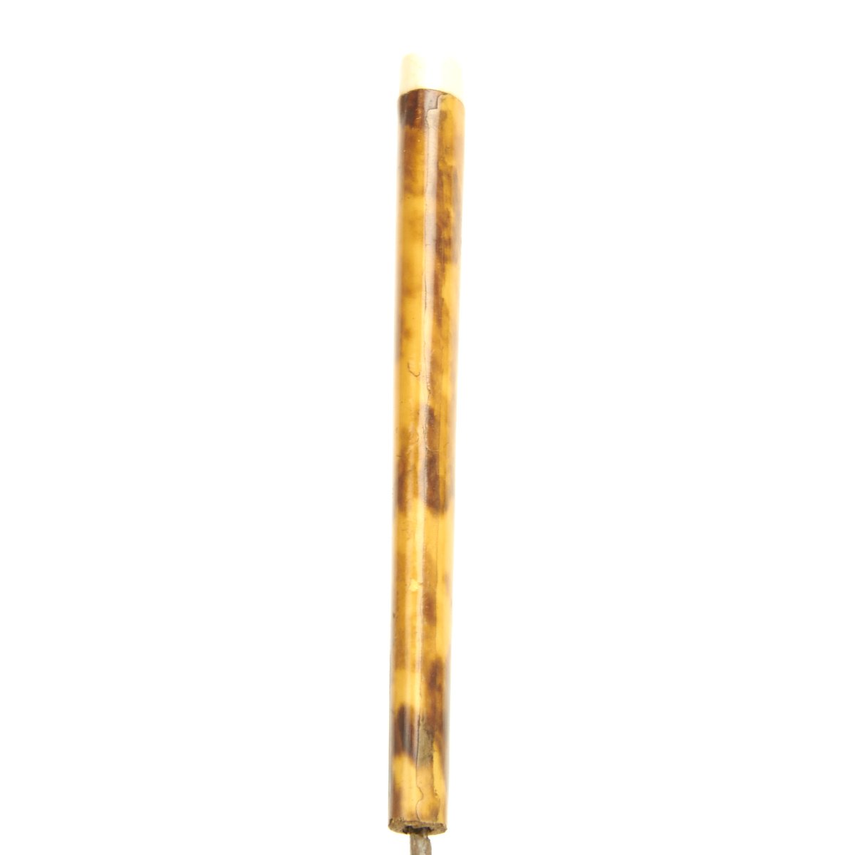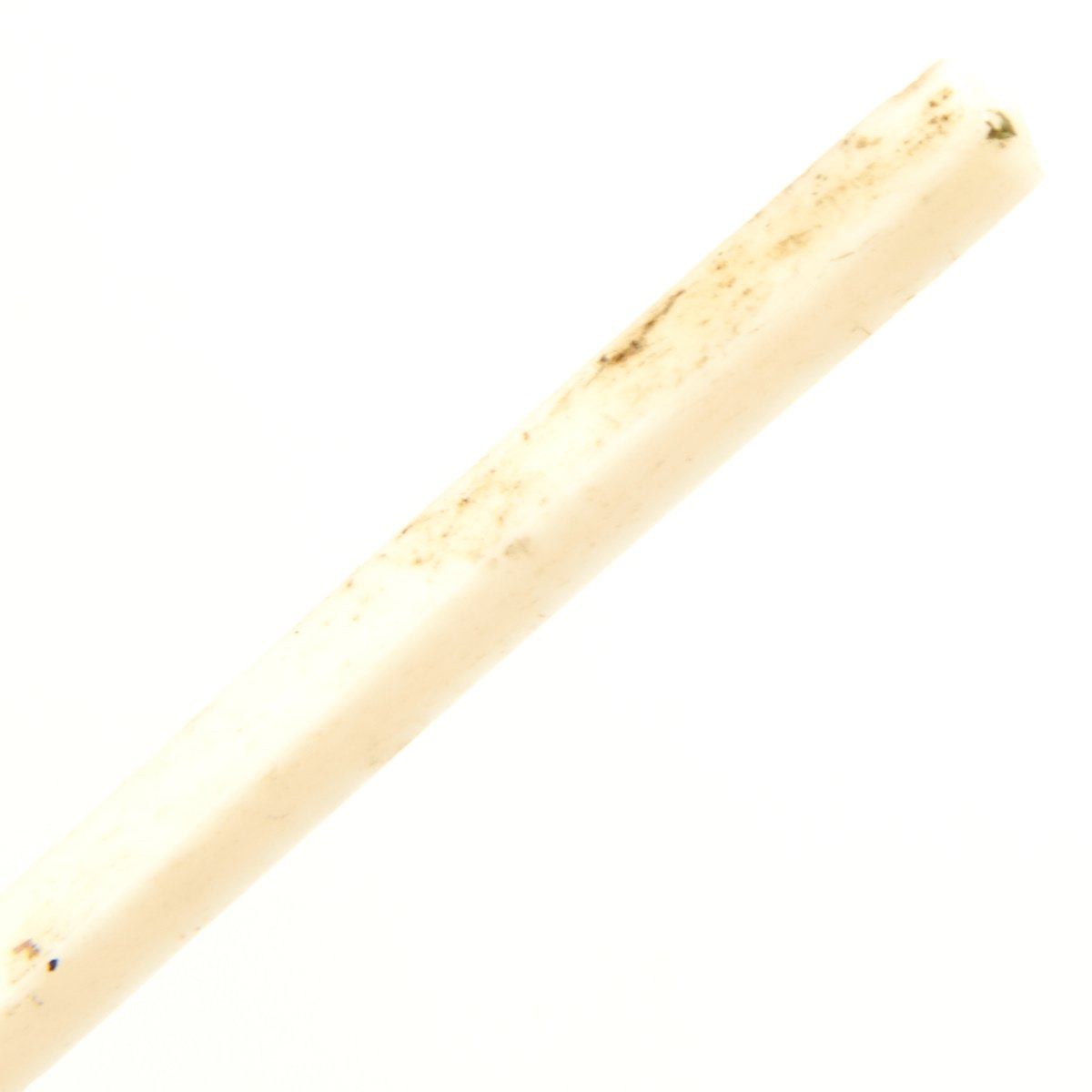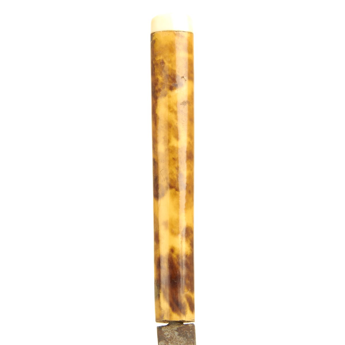 This is the third set we have offered, and it is 11 1/2" overall length. The case is made of of lacquered wood in a most attractive color combination of amber with mid brown spots. It has a small TANTO style knife with a 6 1/2" blade and a lacquered hilt to match the Case (Trousse). It also contains a pair of slim ivory or bone chopsticks. A very pleasing set.