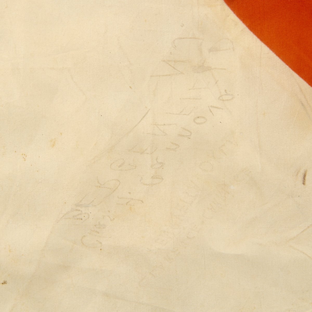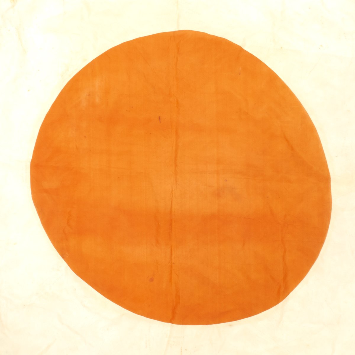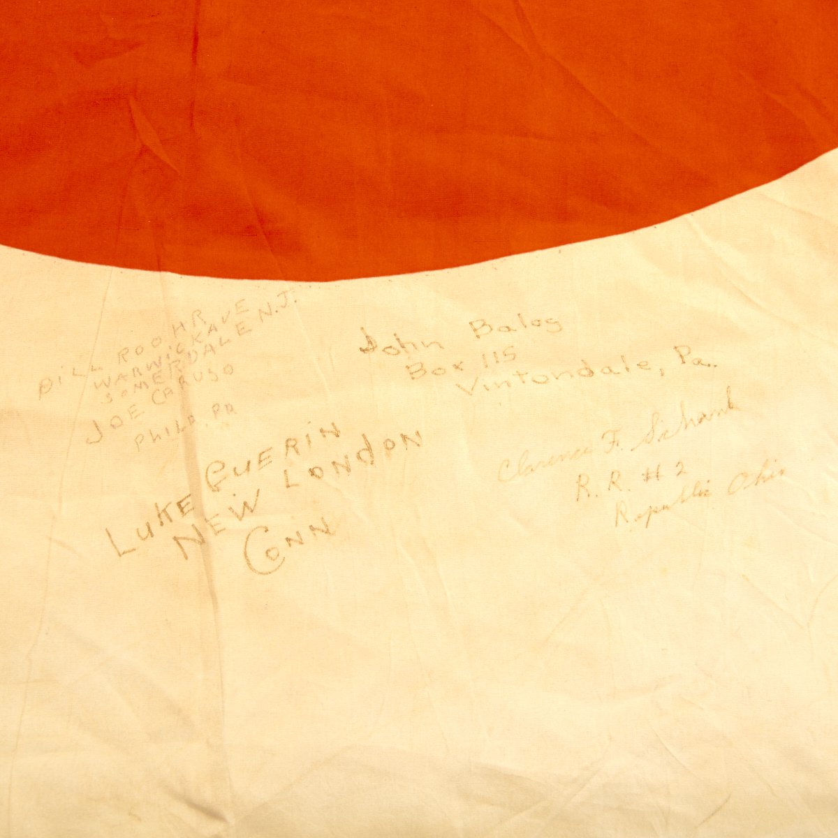 The Japanese call their country's flag hinomaru, which translates literally to "sun-round", referencing the red circle on a white field. When the hinomaru was signed, the Japanese characters were usually written vertically, and radiated outward from the edge of the red circle. This practice is referenced in the second term, yosegaki, meaning "sideways-writing". The phrase hinomaru-yosegaki can be interpreted as "To write sideways around the red sun", describing the appearance of the signed flag. This particular example completely unique is written in old KANJI the writing are mainly Japanese names of this soldier's family and friends with quotes and phrases.