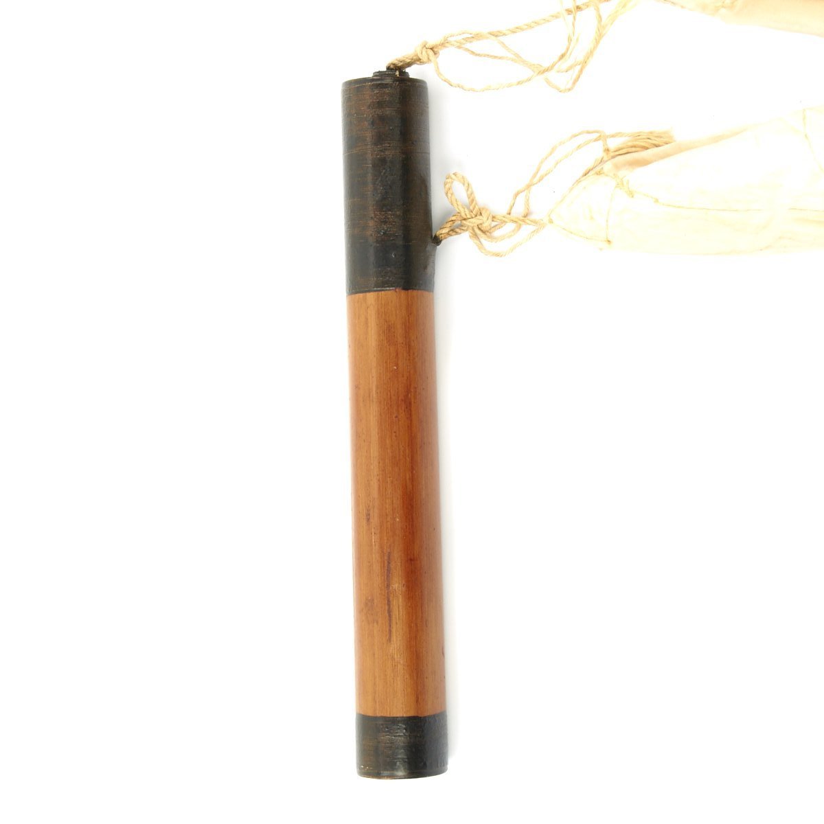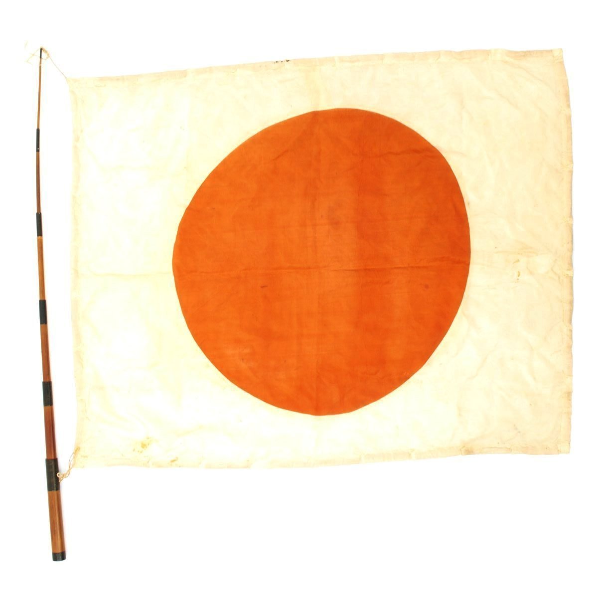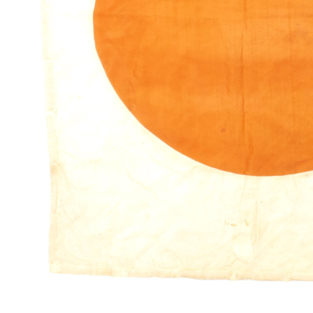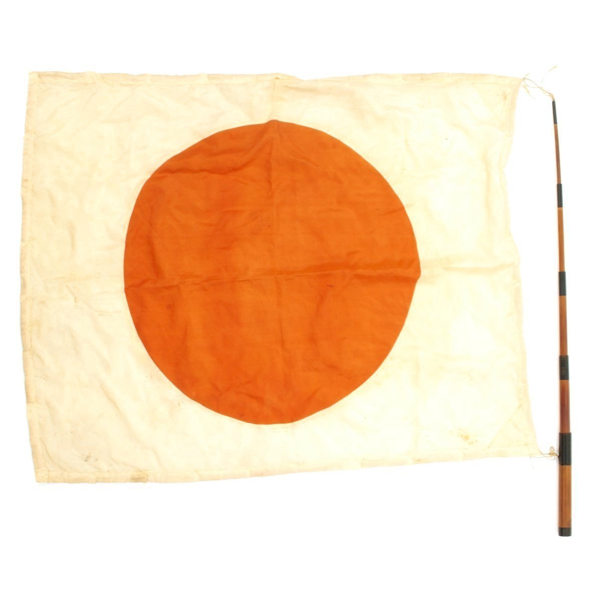 Original Item: One-of-a-kind. This is a rare World War II Japanese pilot’s bail-out survival meatball float flag. The flag is constructed of silk with a stitched and stuffed buoyant border to assist in the flotation of the flag on the water for a Japanese pilot who crashed in the sea. The flag is in very good condition and is still attached to its original telescoping bamboo pole. This poles can be collapsed to a compact size of only 7 inches and extended to a length of 33 inches which was important for allowing the pilot to signal other aircraft and ships. These have become increasingly difficult to find and the first one we have had in several years. Flag measures approximately 38” by 30”.