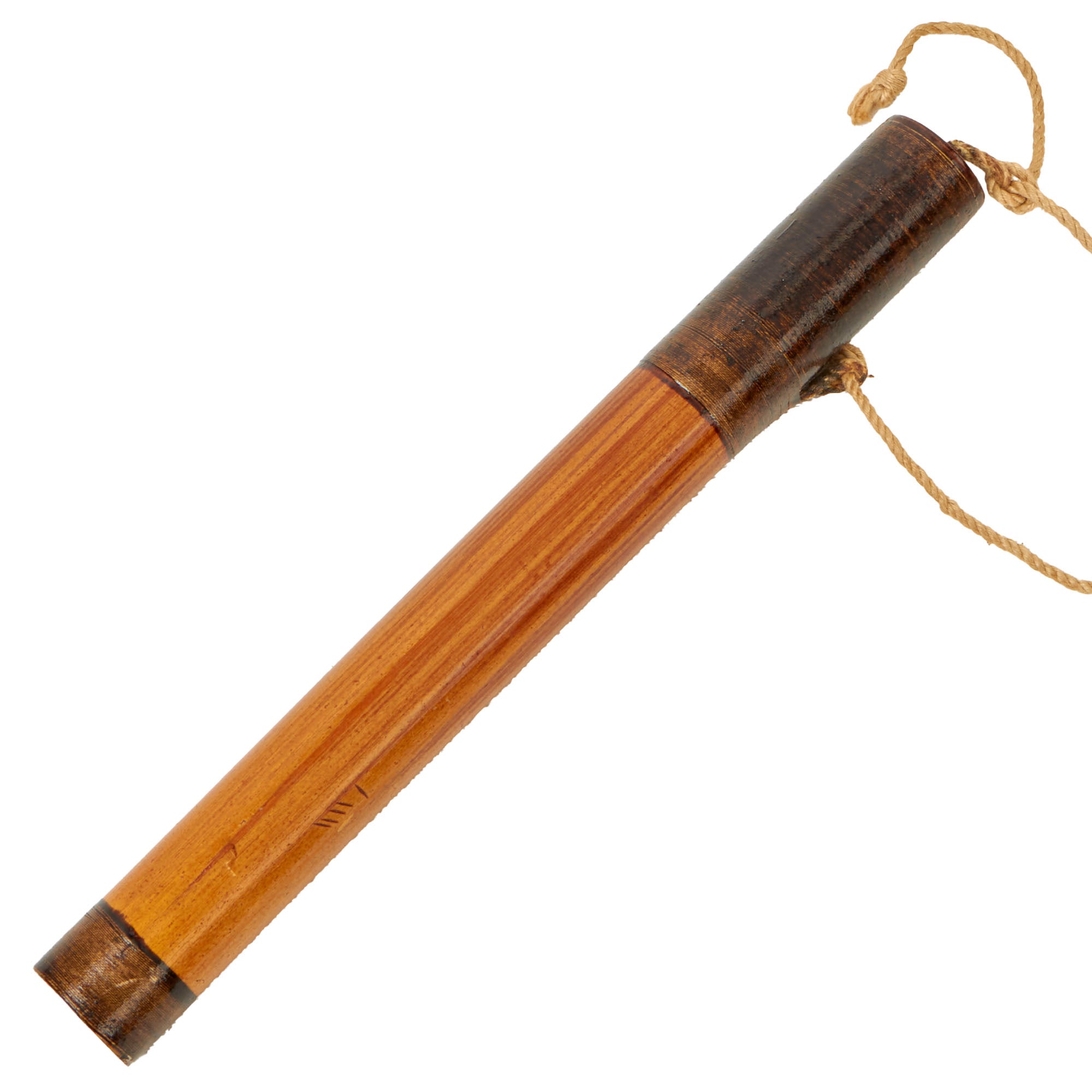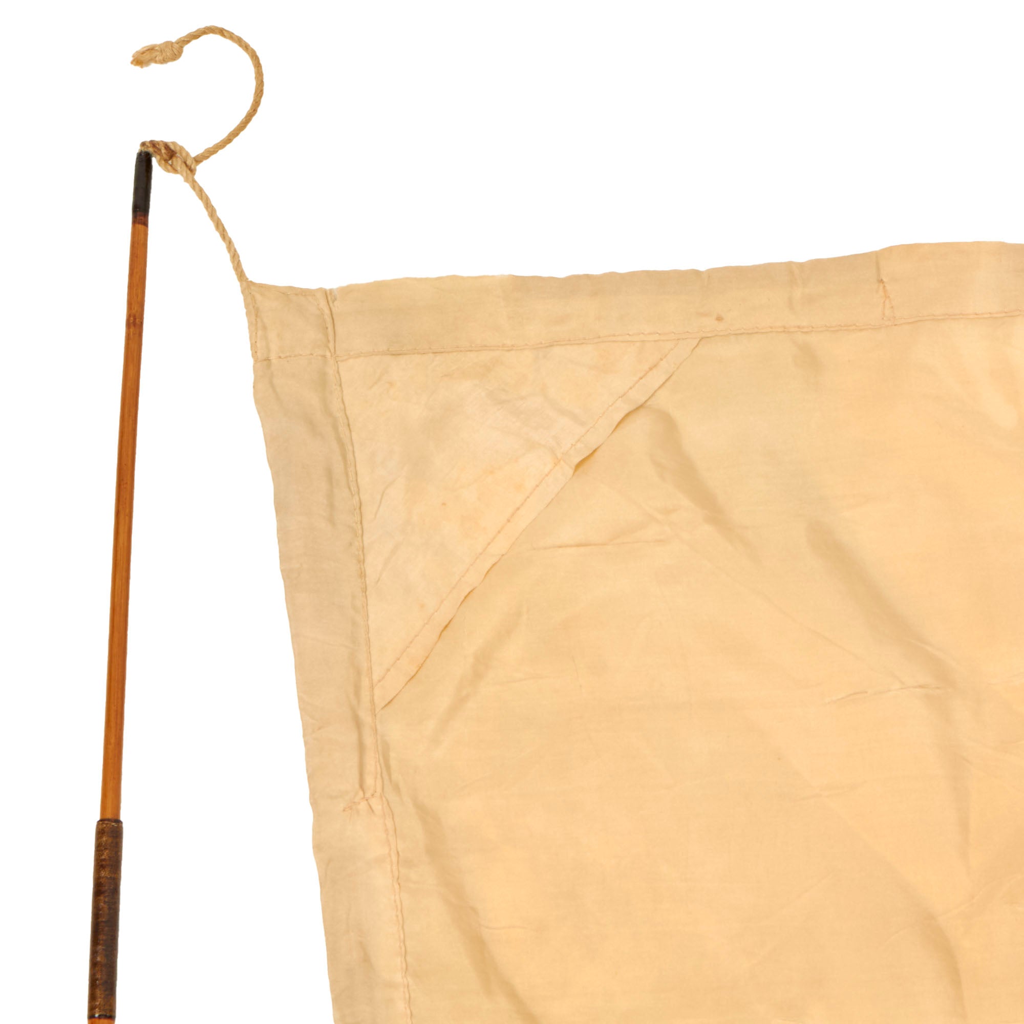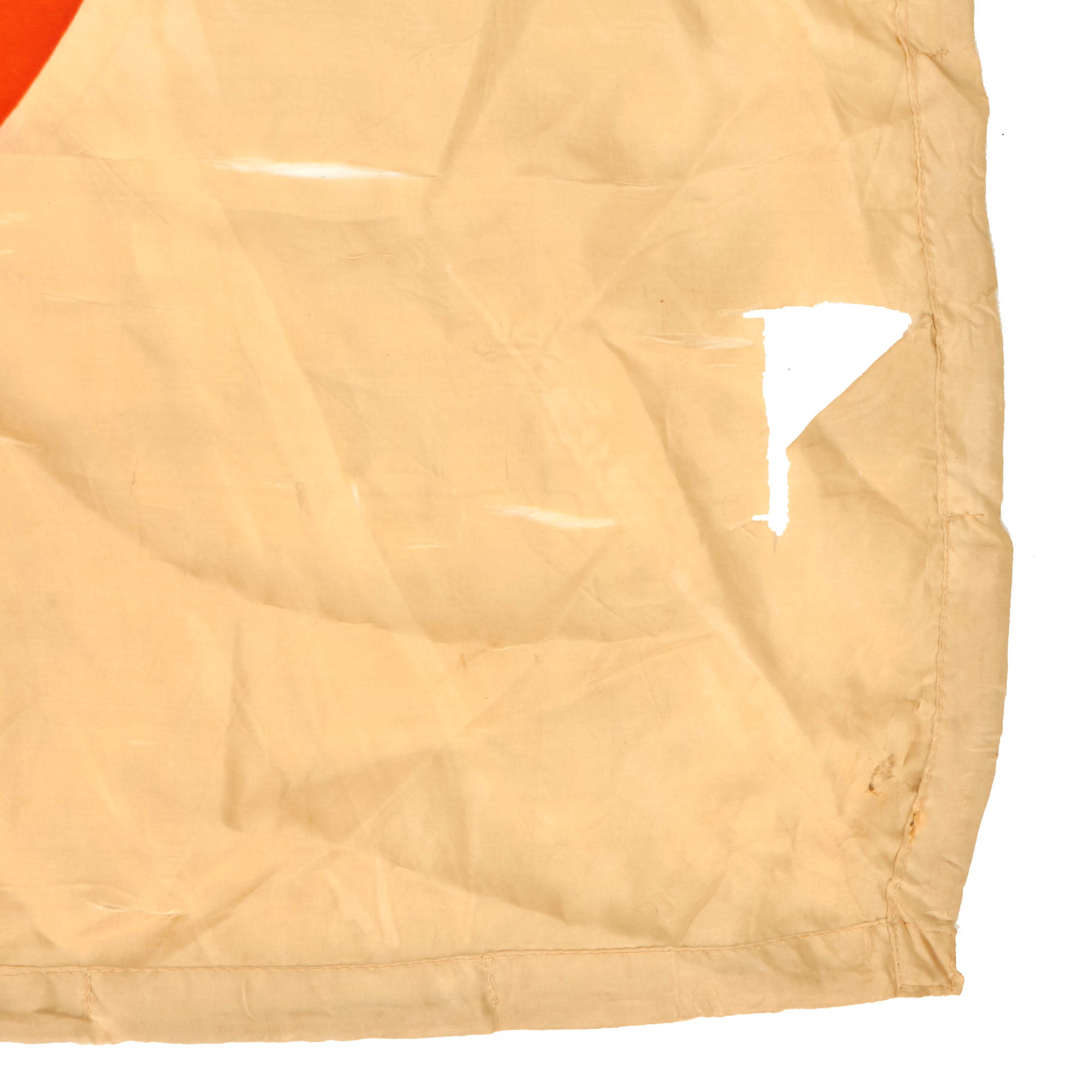 The flag is in fair condition with some rips as shown, and retains the original telescoping bamboo pole. It looks to be made of the usual rayon cloth, with the red "sun" dyed in the middle. These have become increasingly difficult to find, especially with the original telescoping pole. Flag measures approximately 30” by 38”. This example is in fair condition with extensive tearing and holes with a very delicate feel to it.