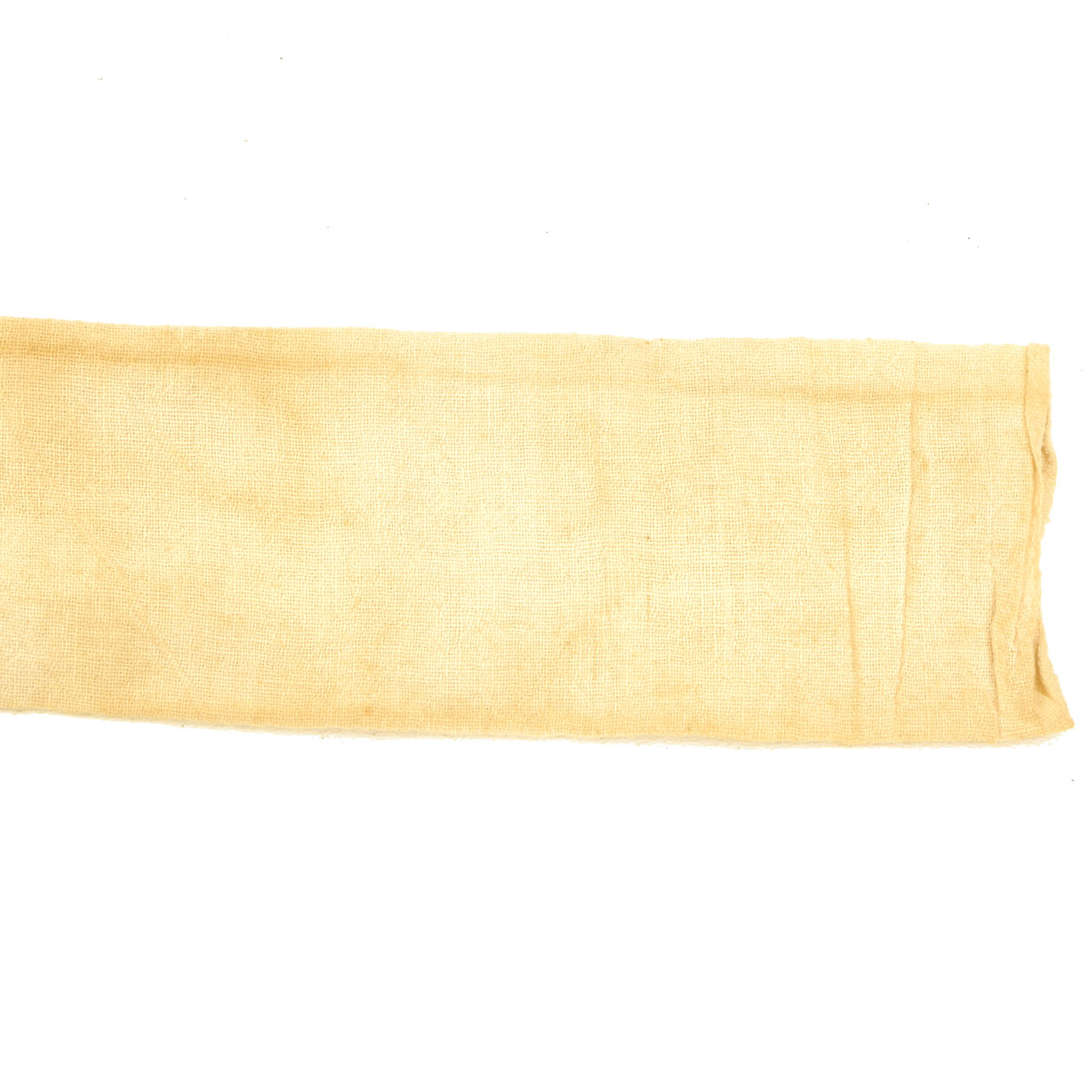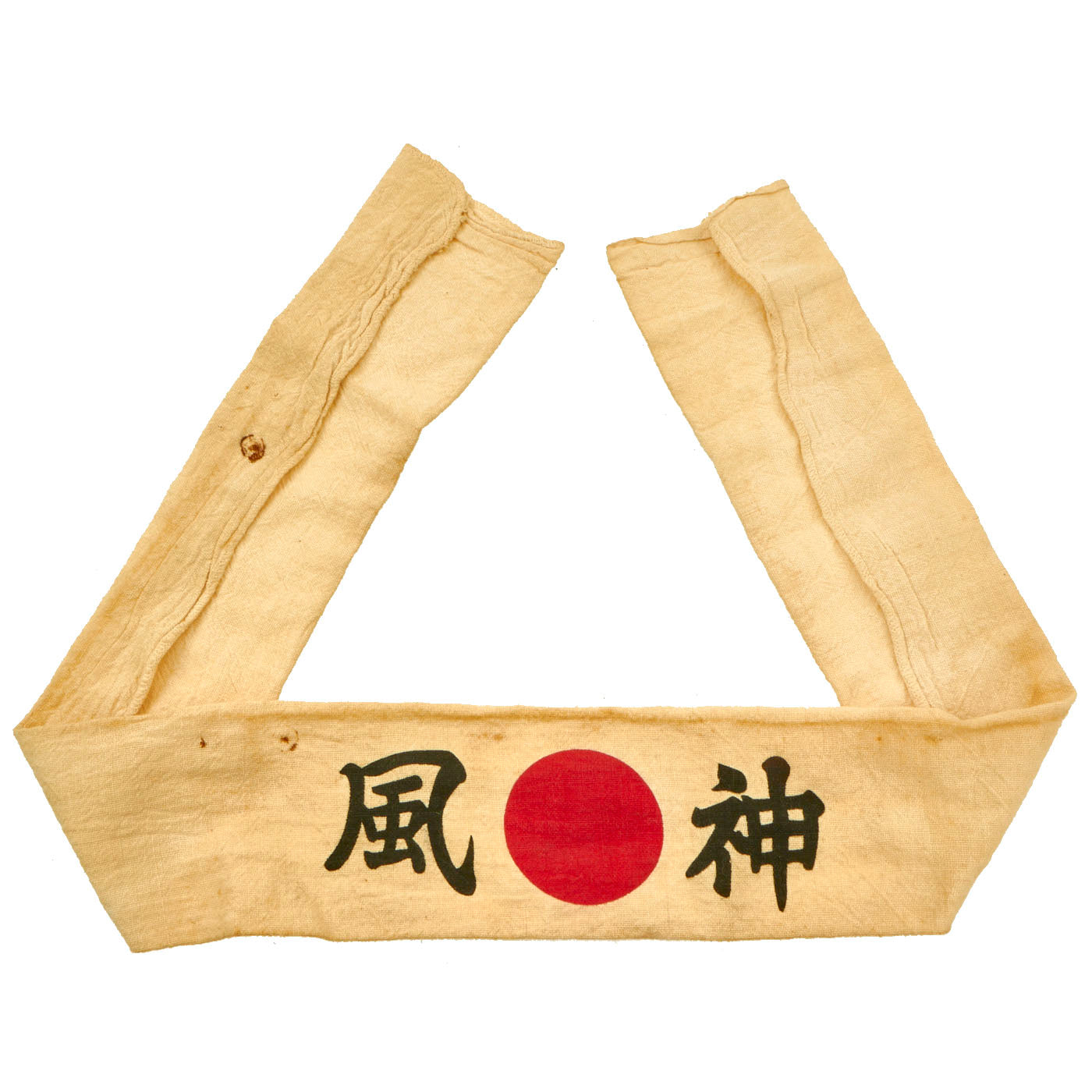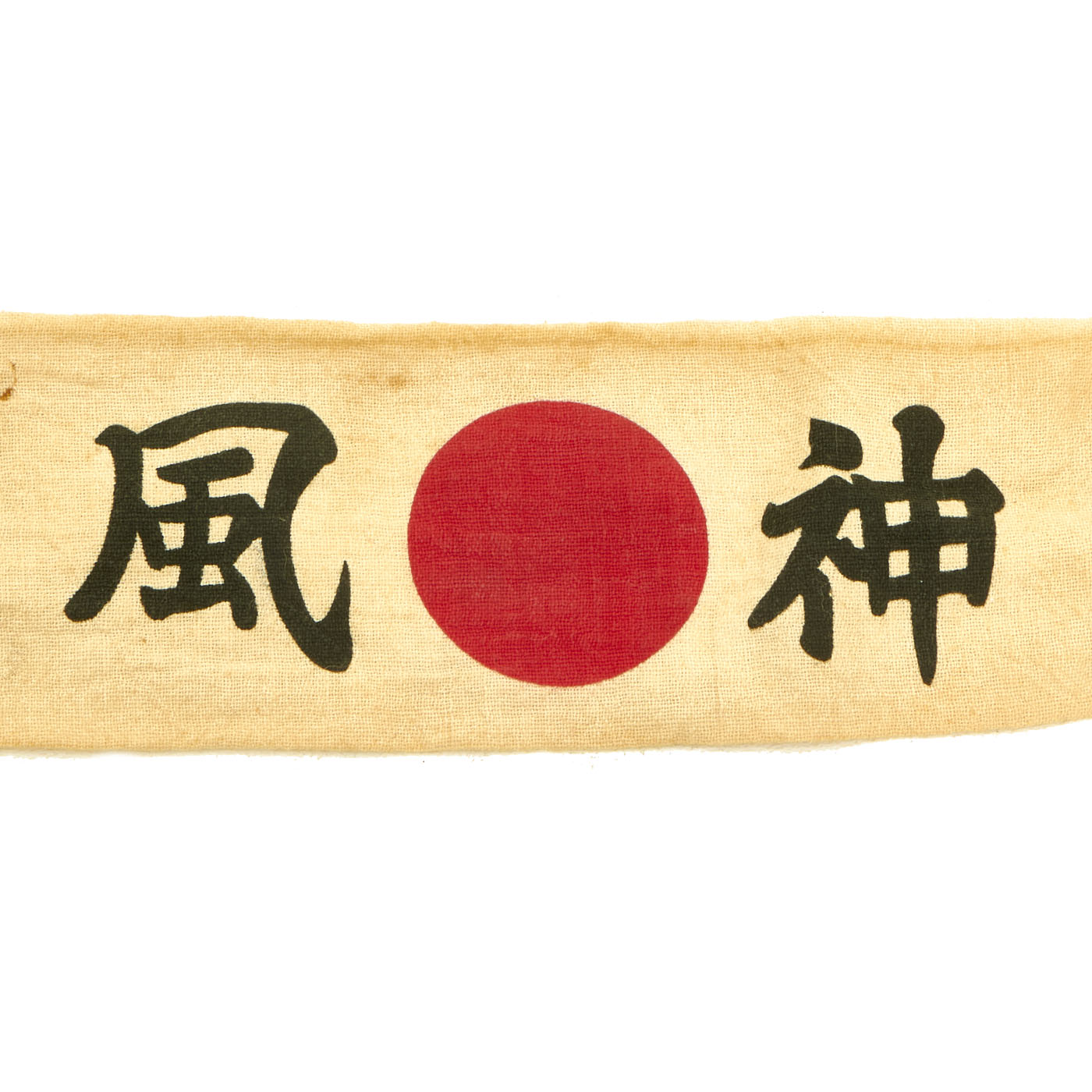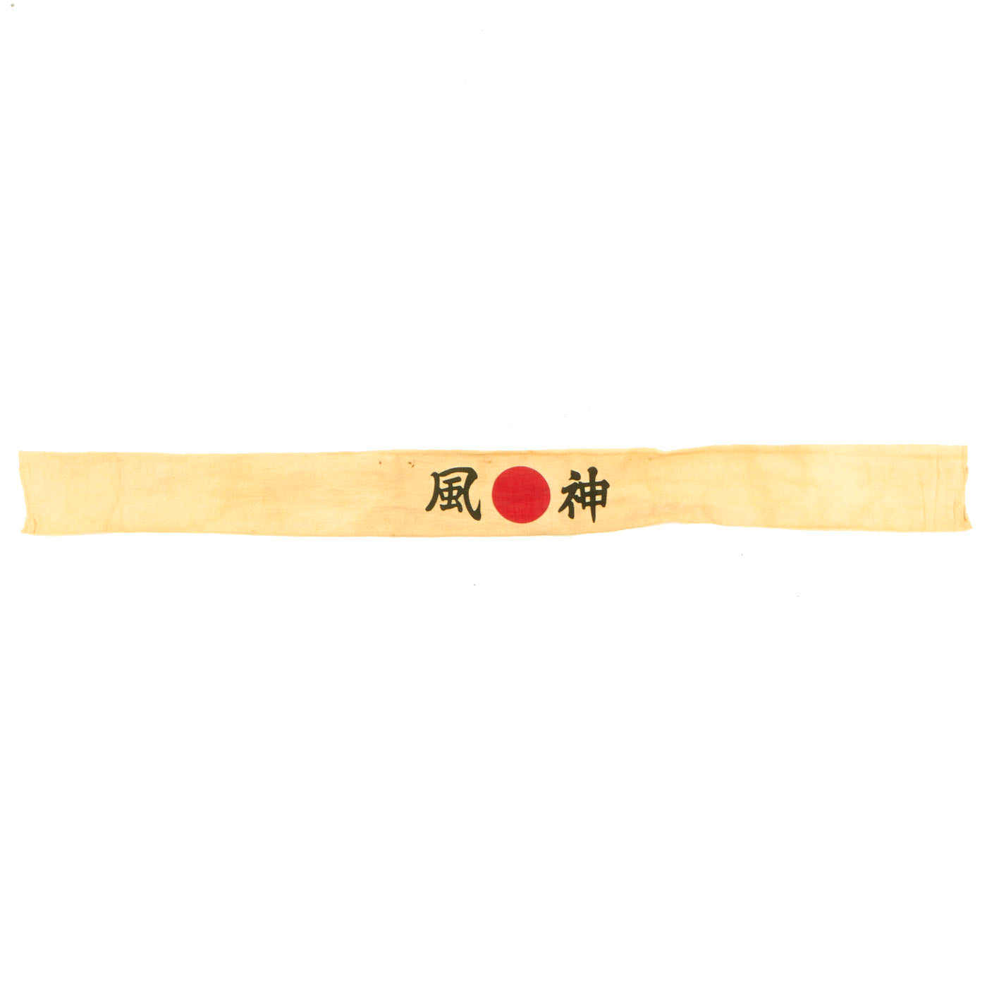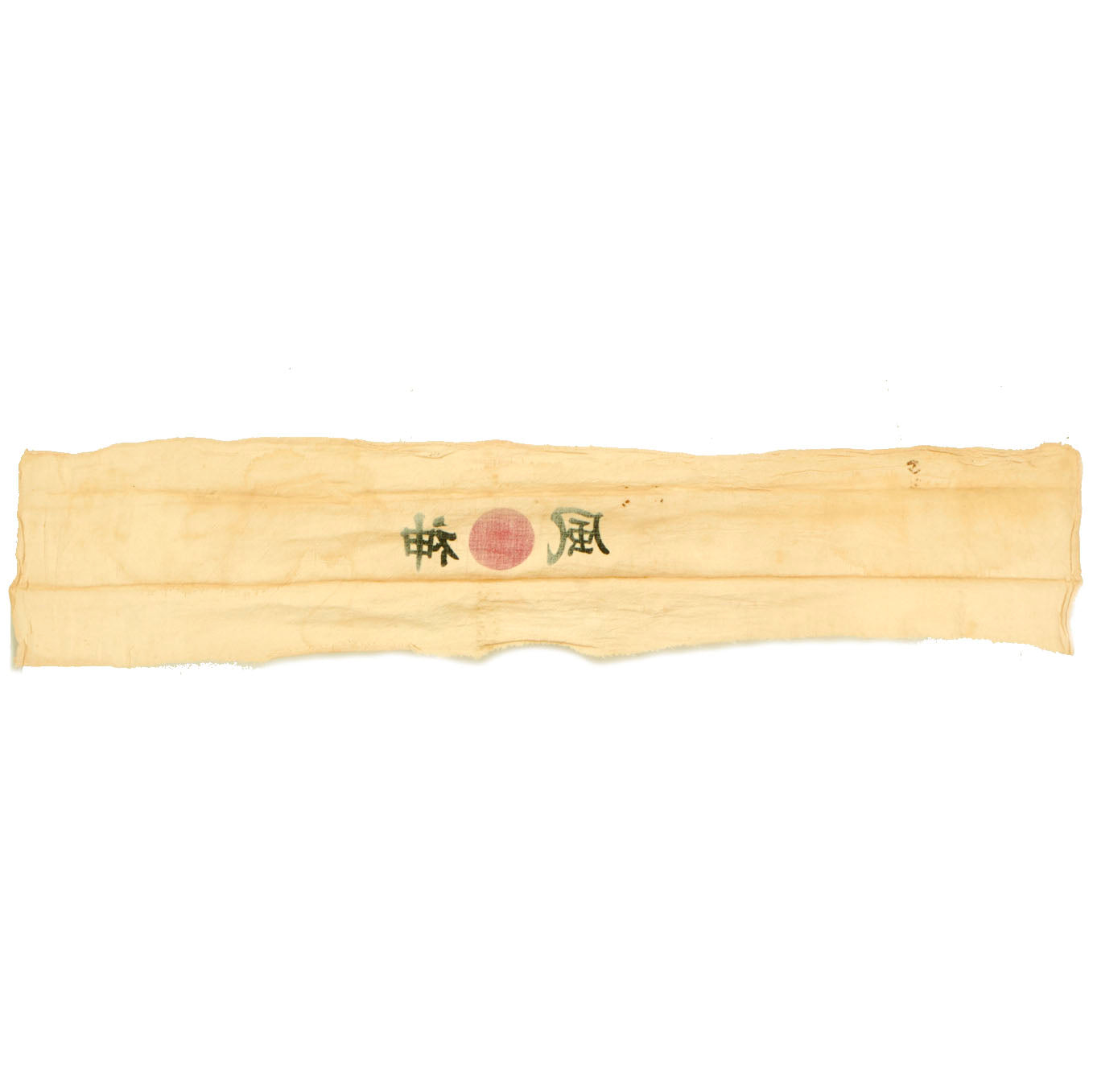This example is of lightweight cotton canvas construction and measures approximately 36 inches x 7 1/2 inches when unfolded completely. It features the "Hinomaru (日の丸 or Circle of the Sun) in the center, surrounded by 神風 (Kamikaze or Divine Wind), both printed onto the fabric. It does not show much sign of use during the war, but is now age toned to a light beige, and shows light stains in areas from what look to be metal thumbtacks. It was most likely hung up on display for some time.