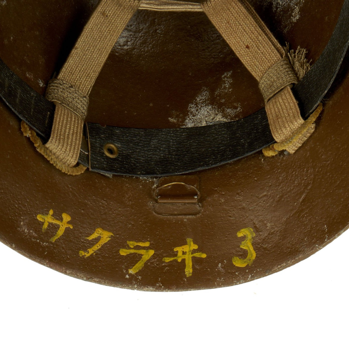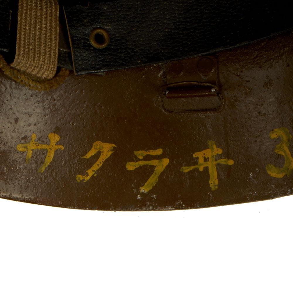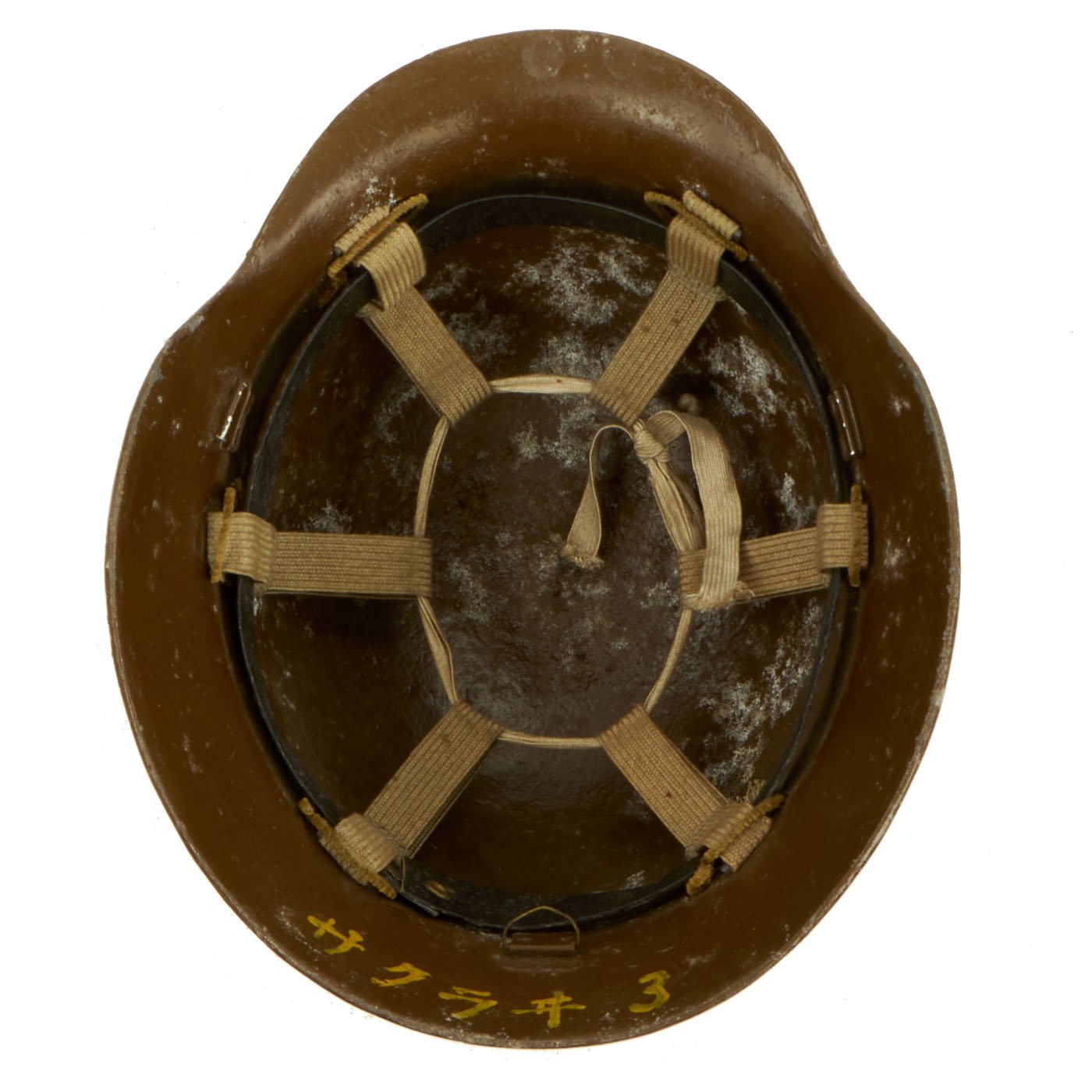 Original Item: Only One Available. Scarce original WWII Japanese Civic Helmet cast from aluminum which mimics the pattern of a German M-35 Stahlhelm. Complete with original suspension and liner. The helmet exhibits a beautiful original painted finish, and the lining is in exceptional condition, which is amazing for how delicate and fragile the original design and materials were for when the helmet was made. Painted in the helmet in Katakana is the Japanese word/name “Sakurawi” followed by the Western number 3 (サクラヰ 3).
