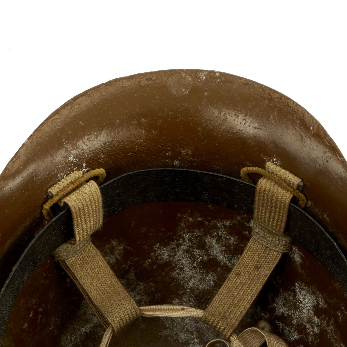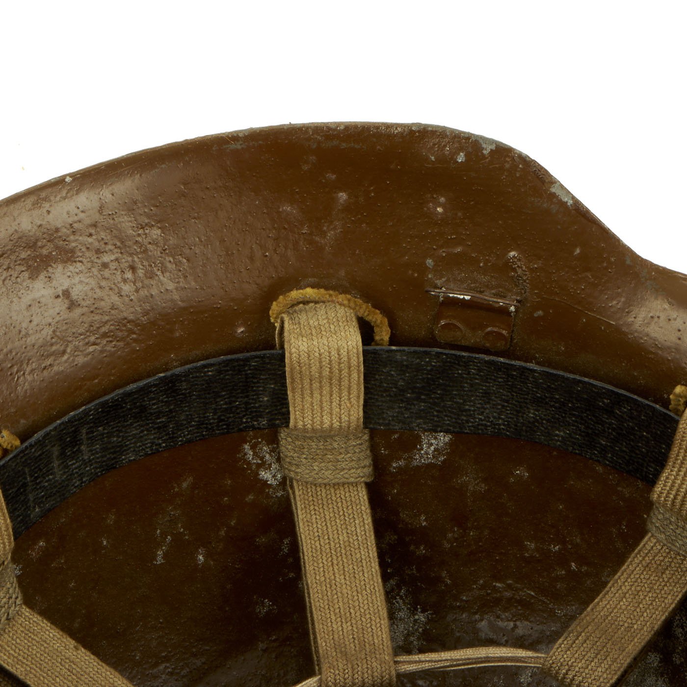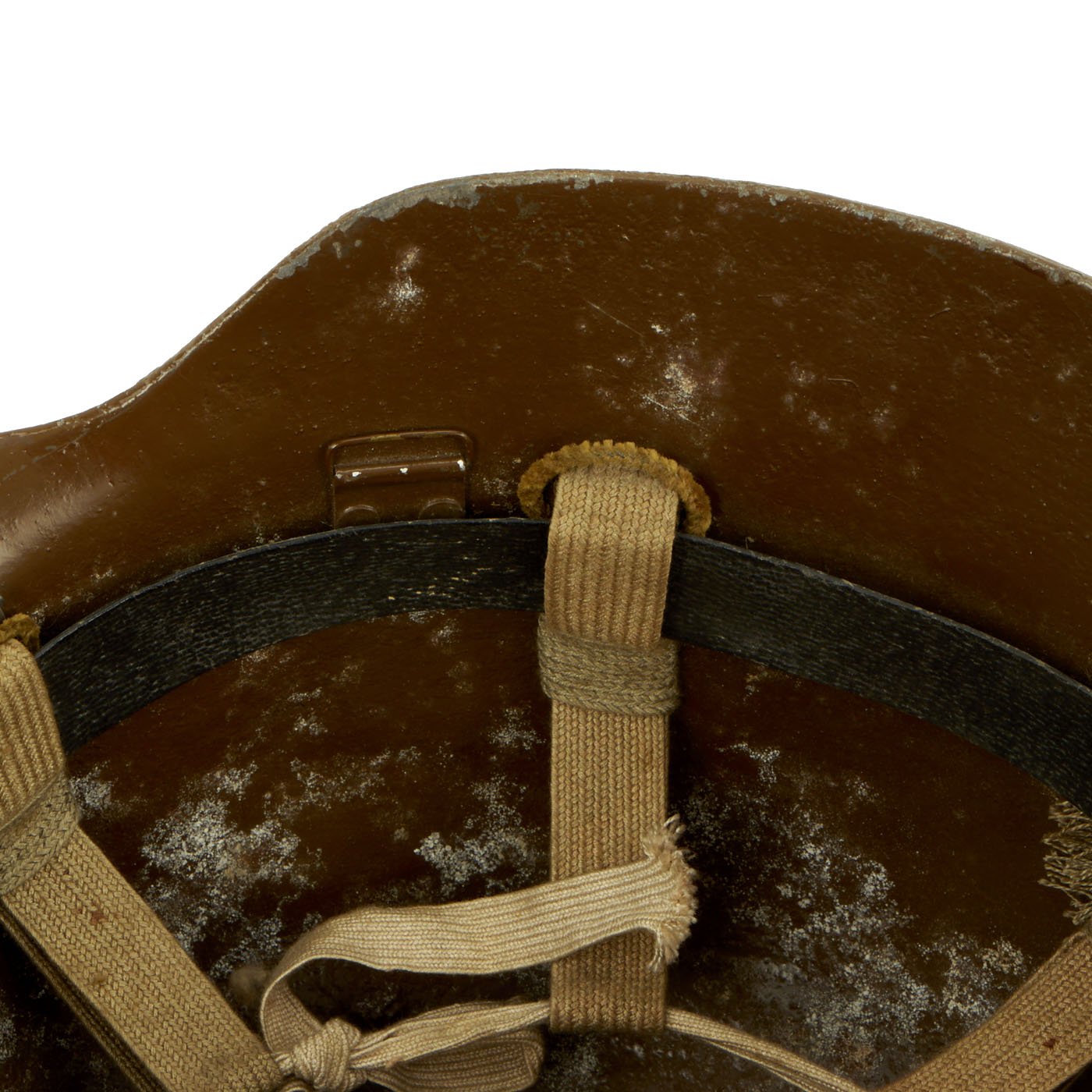 Original Item: Only One Available. Scarce original WWII Japanese Civic Helmet cast from aluminum which mimics the pattern of a German M-35 Stahlhelm. Complete with original suspension and liner. The helmet exhibits a beautiful original painted finish, and the lining is in exceptional condition, which is amazing for how delicate and fragile the original design and materials were for when the helmet was made. Painted in the helmet in Katakana is the Japanese word/name “Sakurawi” followed by the Western number 3 (サクラヰ 3).