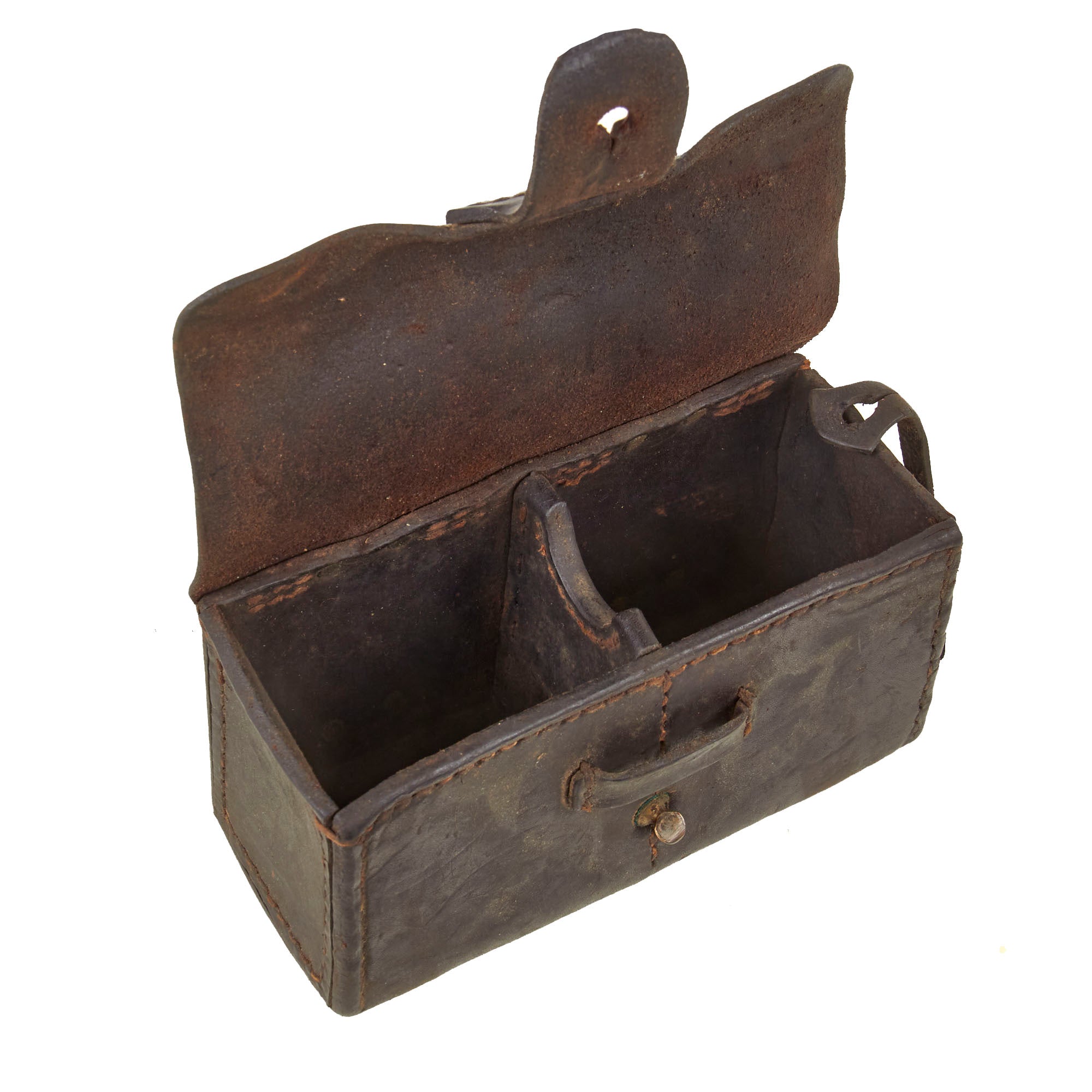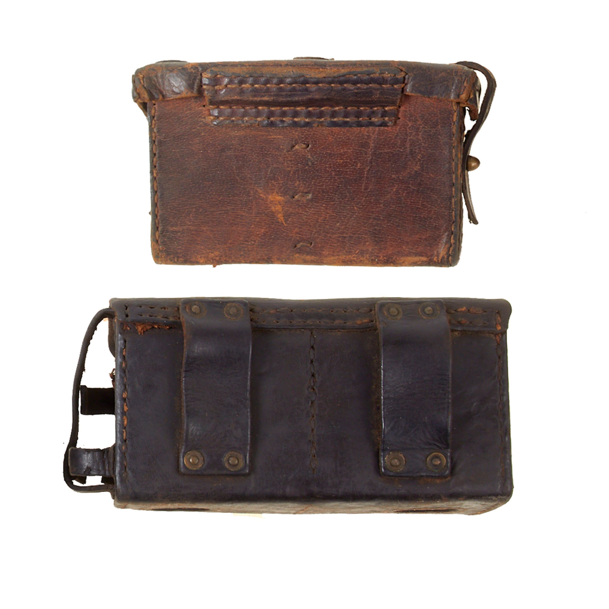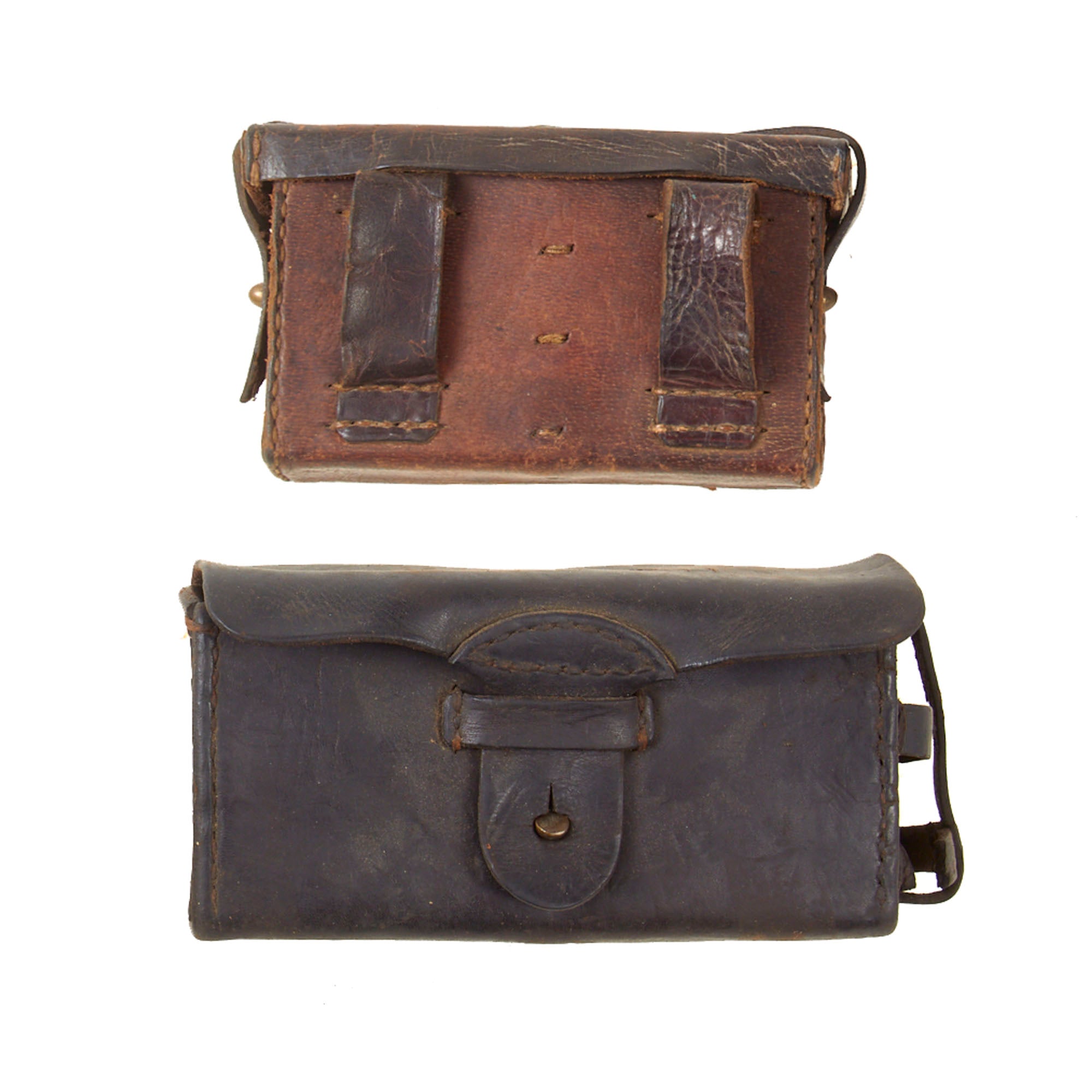 The smaller pouch is one of the two front worn pouches. This is the first pattern, with only one securing loop over the closure strap. The second pattern added a second loop, which made it much more stable. These were usually worn 2-3 on a belt, and are very hard to find, even as just a single pouch. This example retains both securing strap ends for the side knobs, and both belt loops.