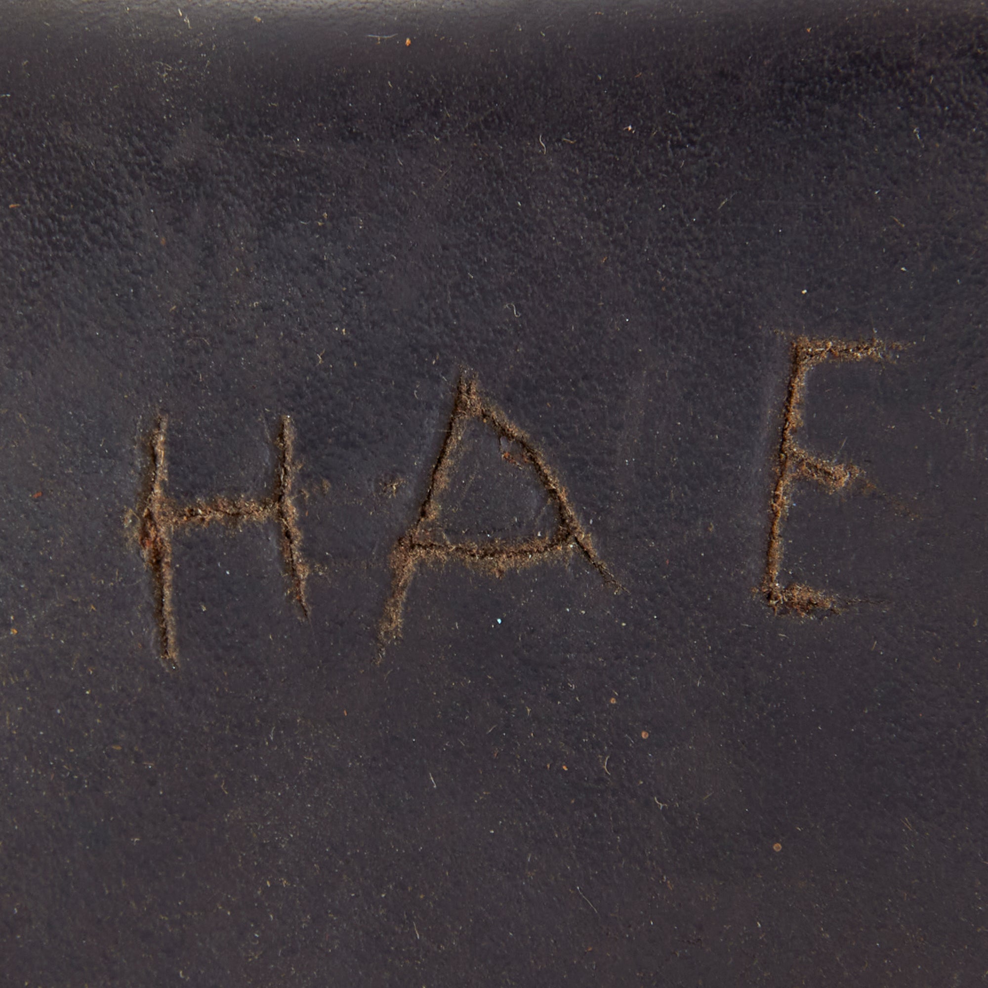 The second pouch is the larger pouch to be worn on the back of the belt, and shows heavier service wear. It is in great condition besides that the straps to the side that are meant to hold the oiler. These straps are now broken and will not hold an oiler. The front securing strap and belt loops are in good shape. There are initials scratched onto the top, HAE.