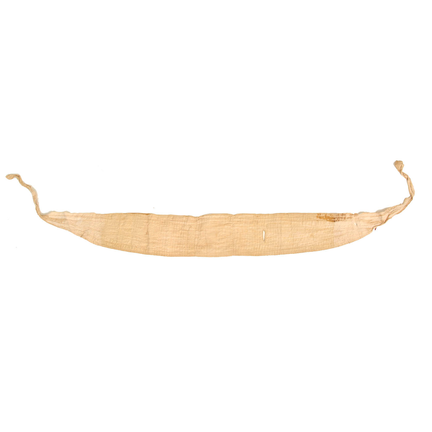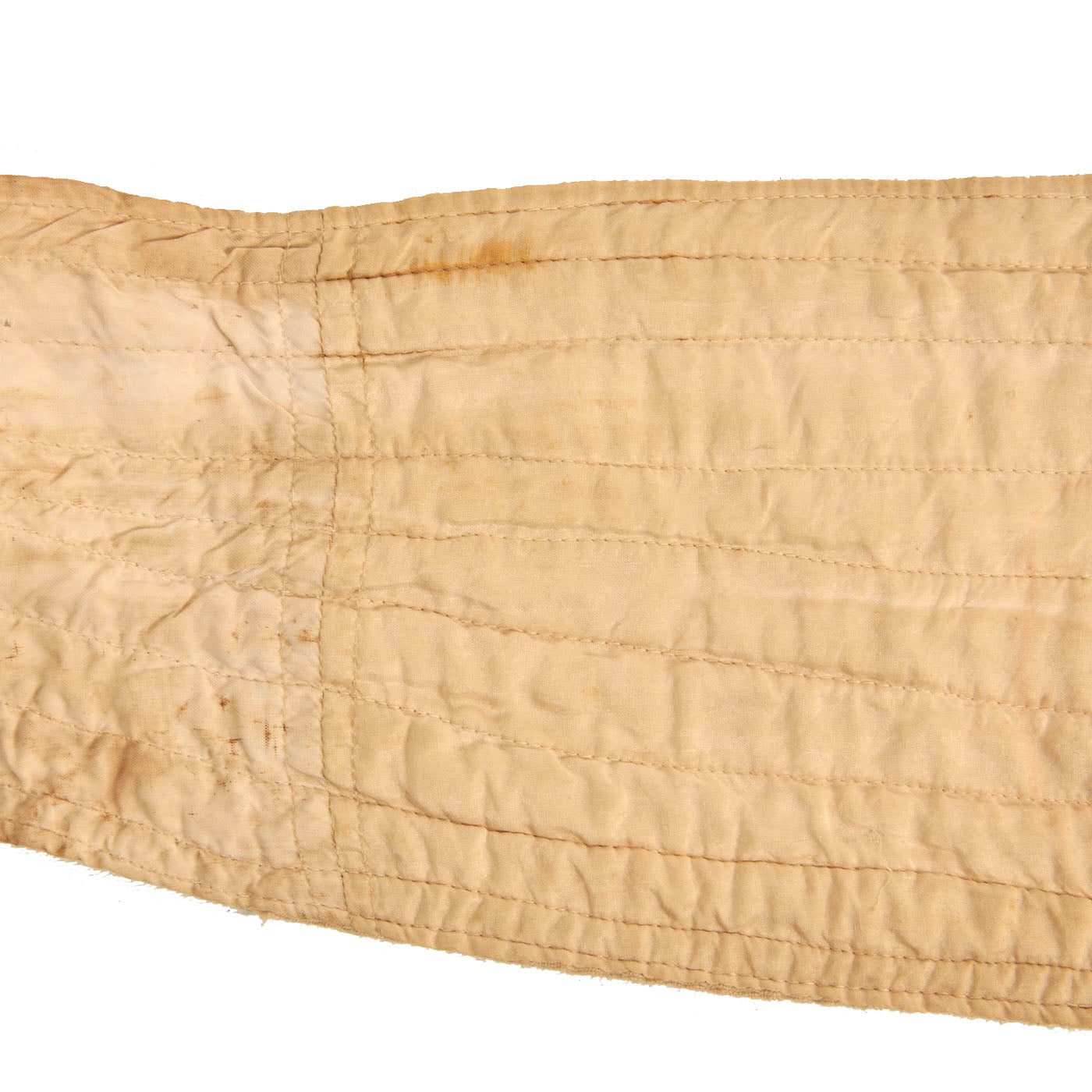 The belt appears to be made of linen cloth, and has been folded over and stitched together around an inner layer of padding. There are some small tears and staining, as well as overall age toning. However it still displays very nicely.