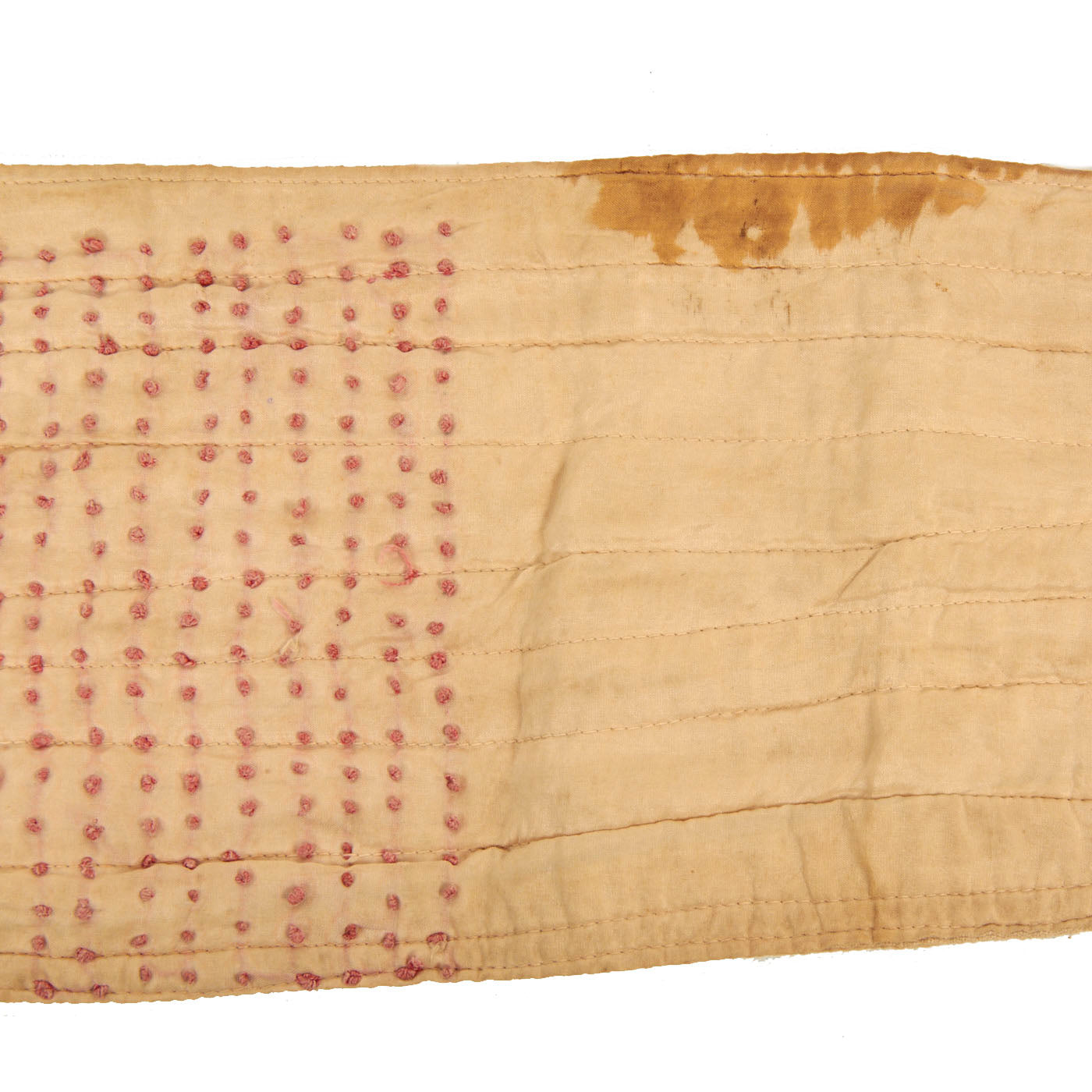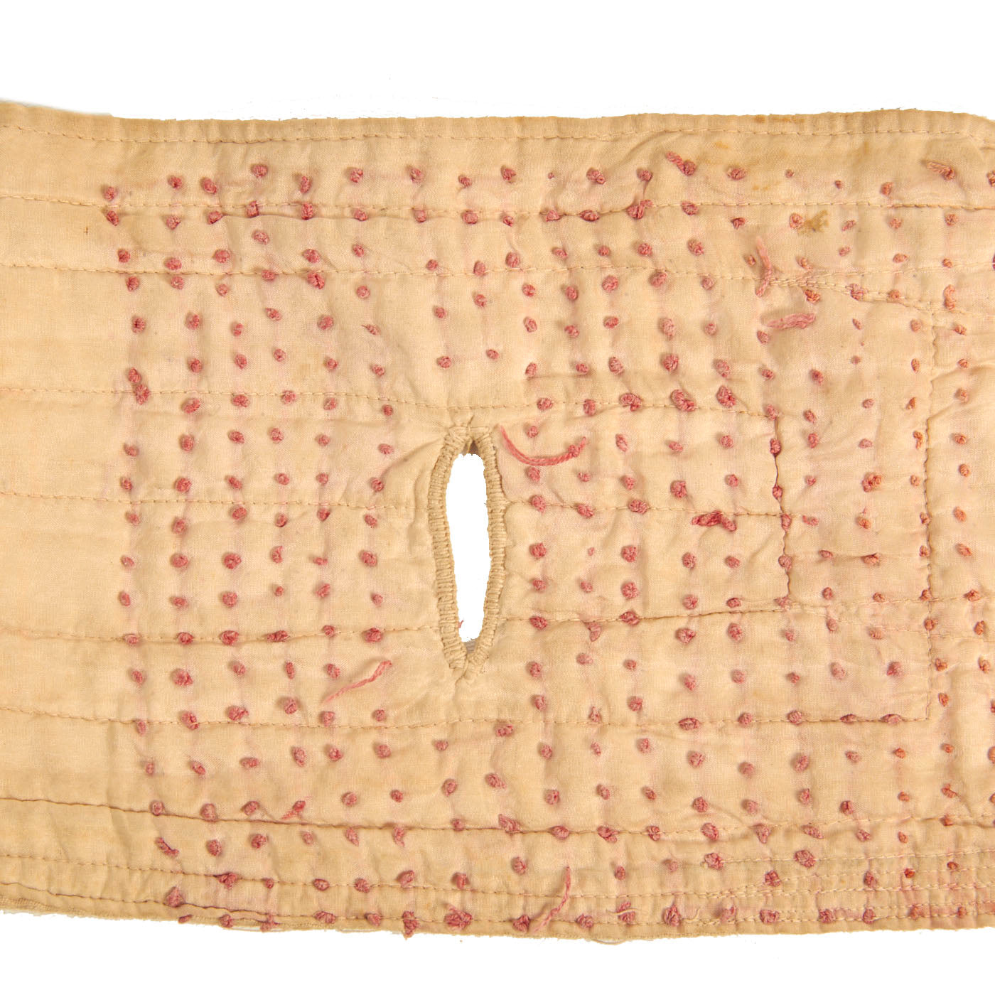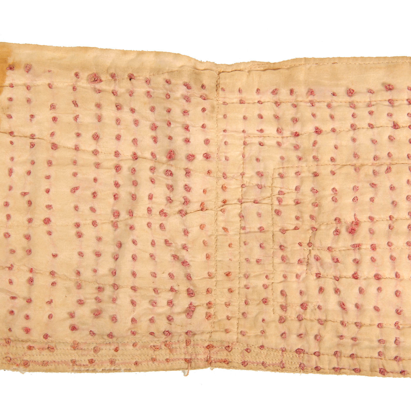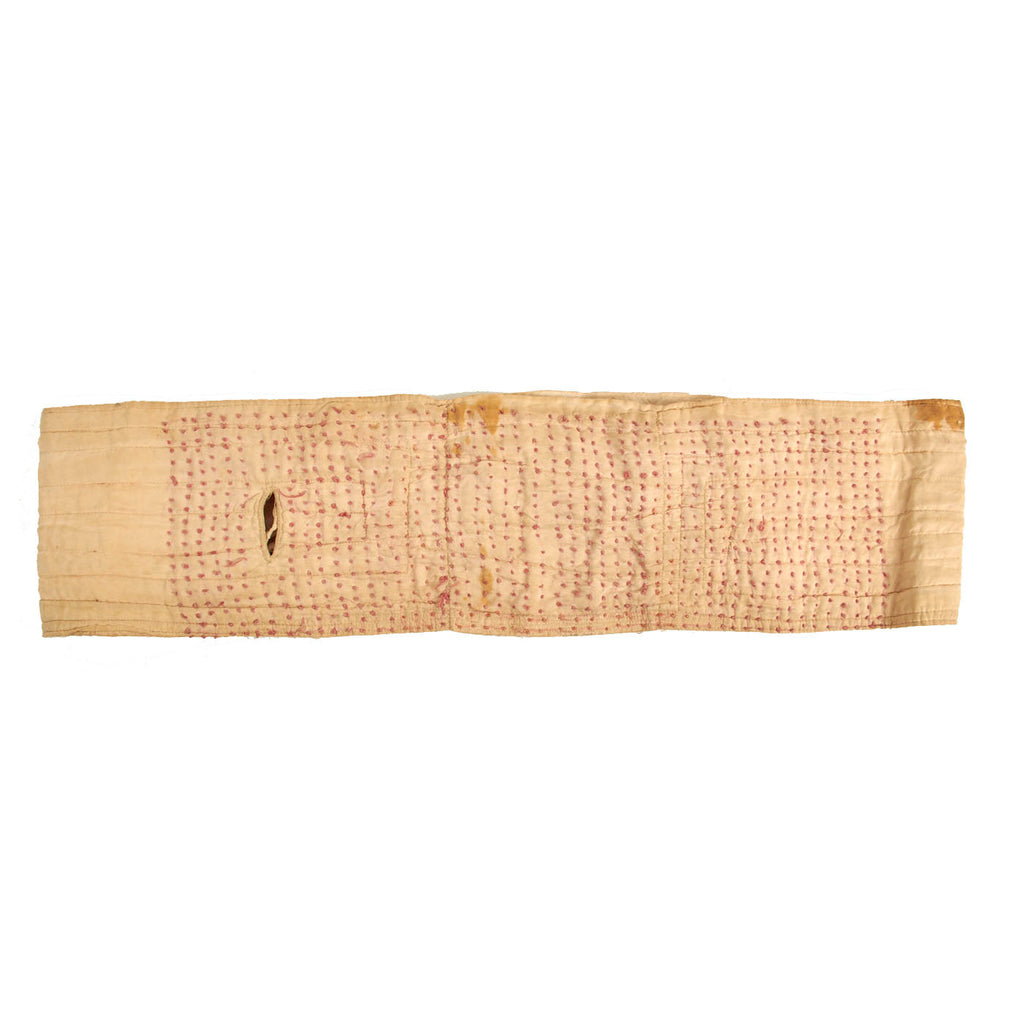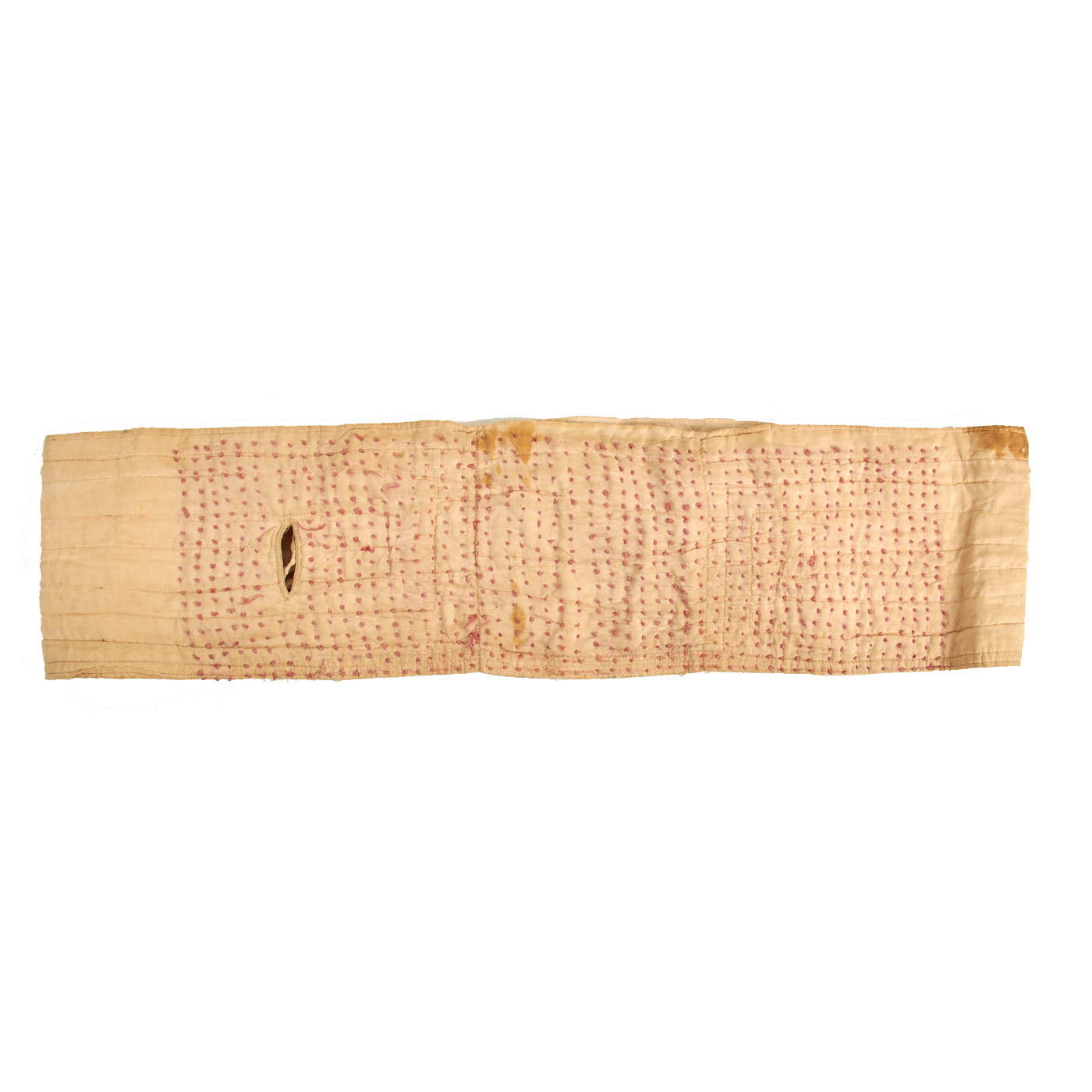 Original Item: One-of-a-kind. A Senninbari (千人針 thousand-person-stitches) or One-thousand stitch is a strip of cloth that measures approximately 15 cm (6 in) high and up to 90–120 cm (3–4 ft) or more in length. Each end of the belt (sash) may or may not have strings, snaps or buttons that allow it to be fastened about the waist. Examples that lack these were often tucked into the waist. Other variations were never worn but may have been folded and placed inside helmet liners, pockets or packs. Senninbari were decorated with 1000 knots or stitches, and each stitch was normally made by a different woman. Senninbari were given as an amulet by women to soldiers on their way to war as a part of the Shinto culture of Imperial Japan.