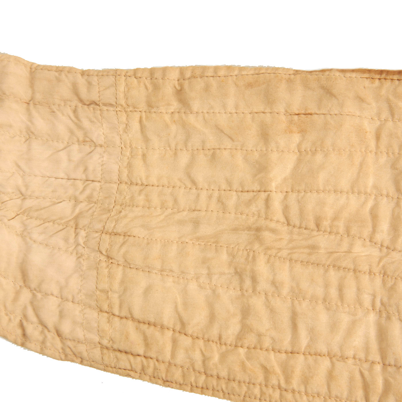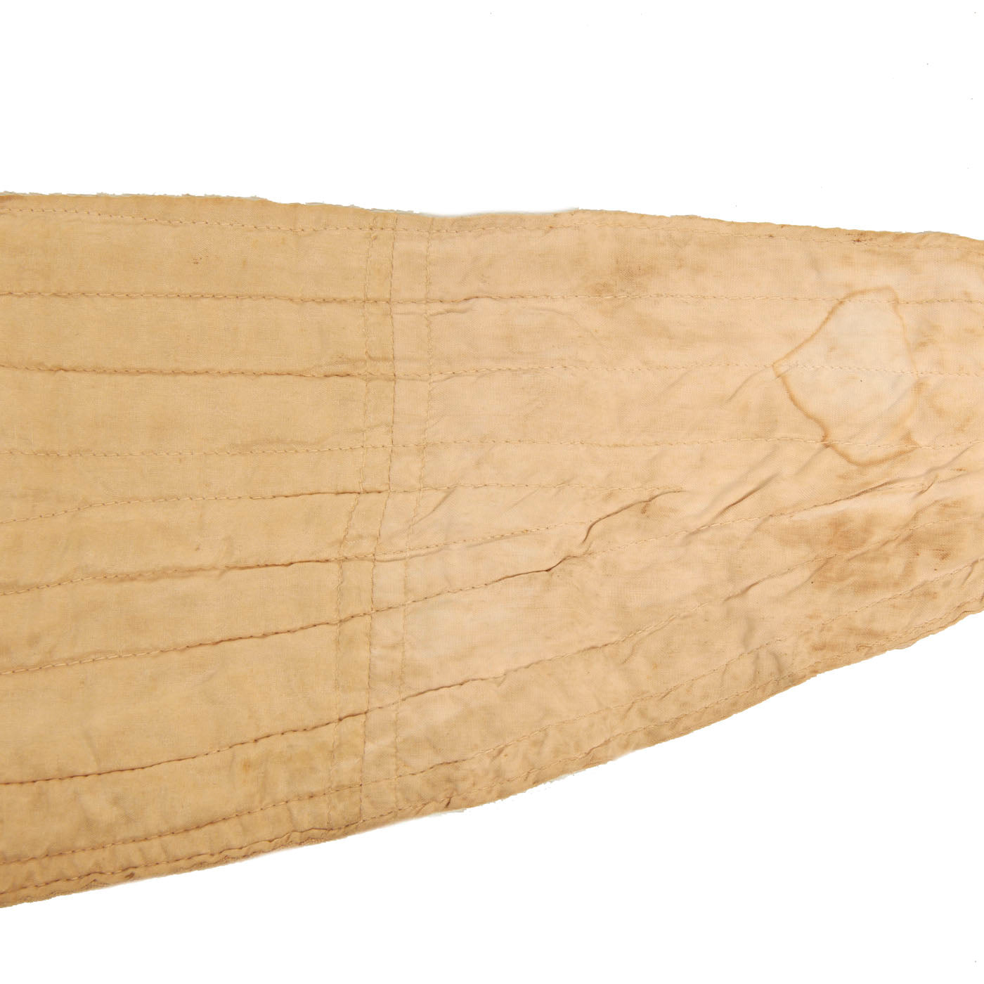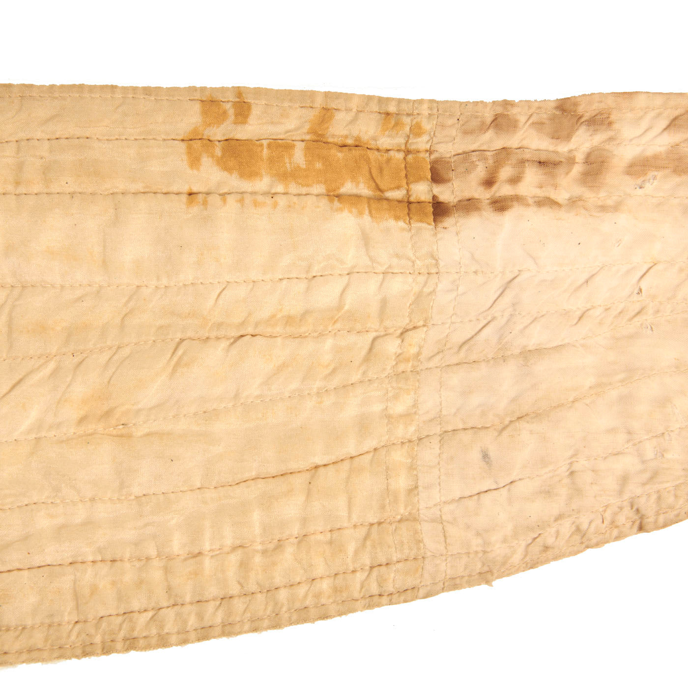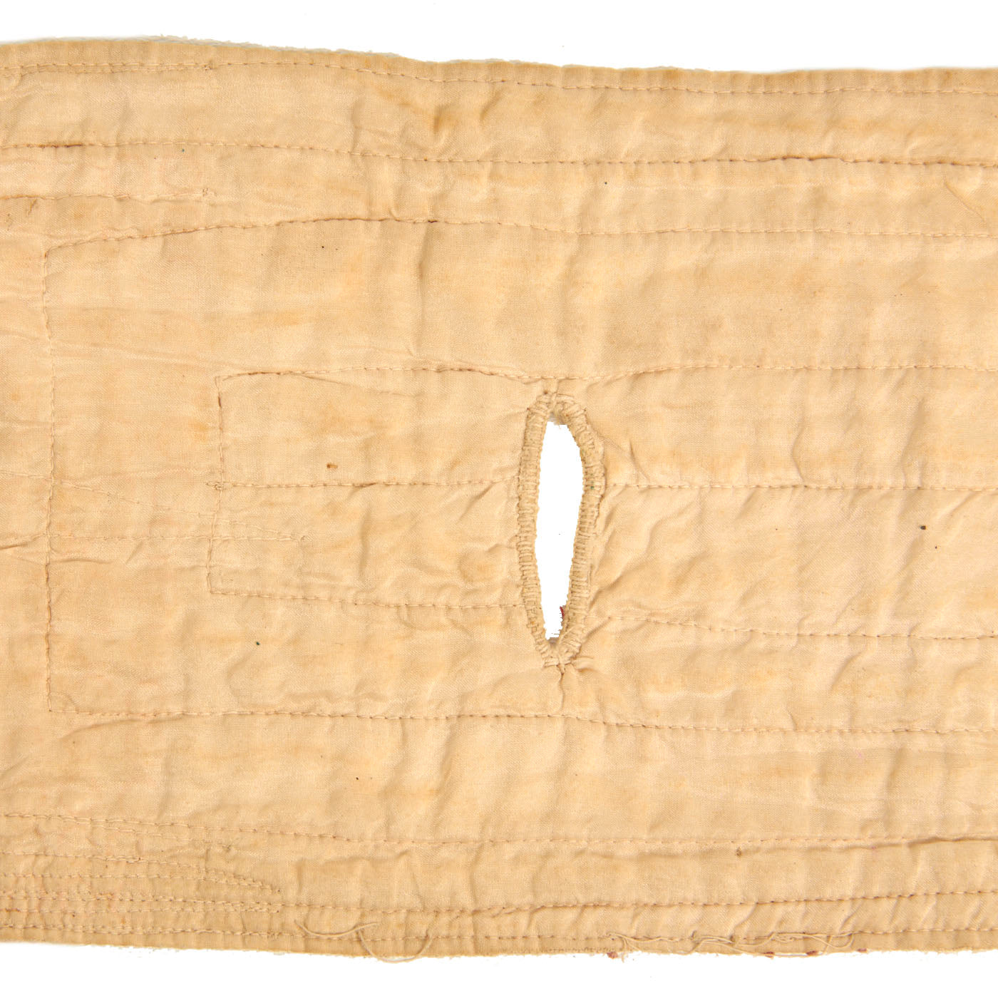 Original Item: One-of-a-kind. A Senninbari (千人針 thousand-person-stitches) or One-thousand stitch is a strip of cloth that measures approximately 15 cm (6 in) high and up to 90–120 cm (3–4 ft) or more in length. Each end of the belt (sash) may or may not have strings, snaps or buttons that allow it to be fastened about the waist. Examples that lack these were often tucked into the waist. Other variations were never worn but may have been folded and placed inside helmet liners, pockets or packs. Senninbari were decorated with 1000 knots or stitches, and each stitch was normally made by a different woman. Senninbari were given as an amulet by women to soldiers on their way to war as a part of the Shinto culture of Imperial Japan.