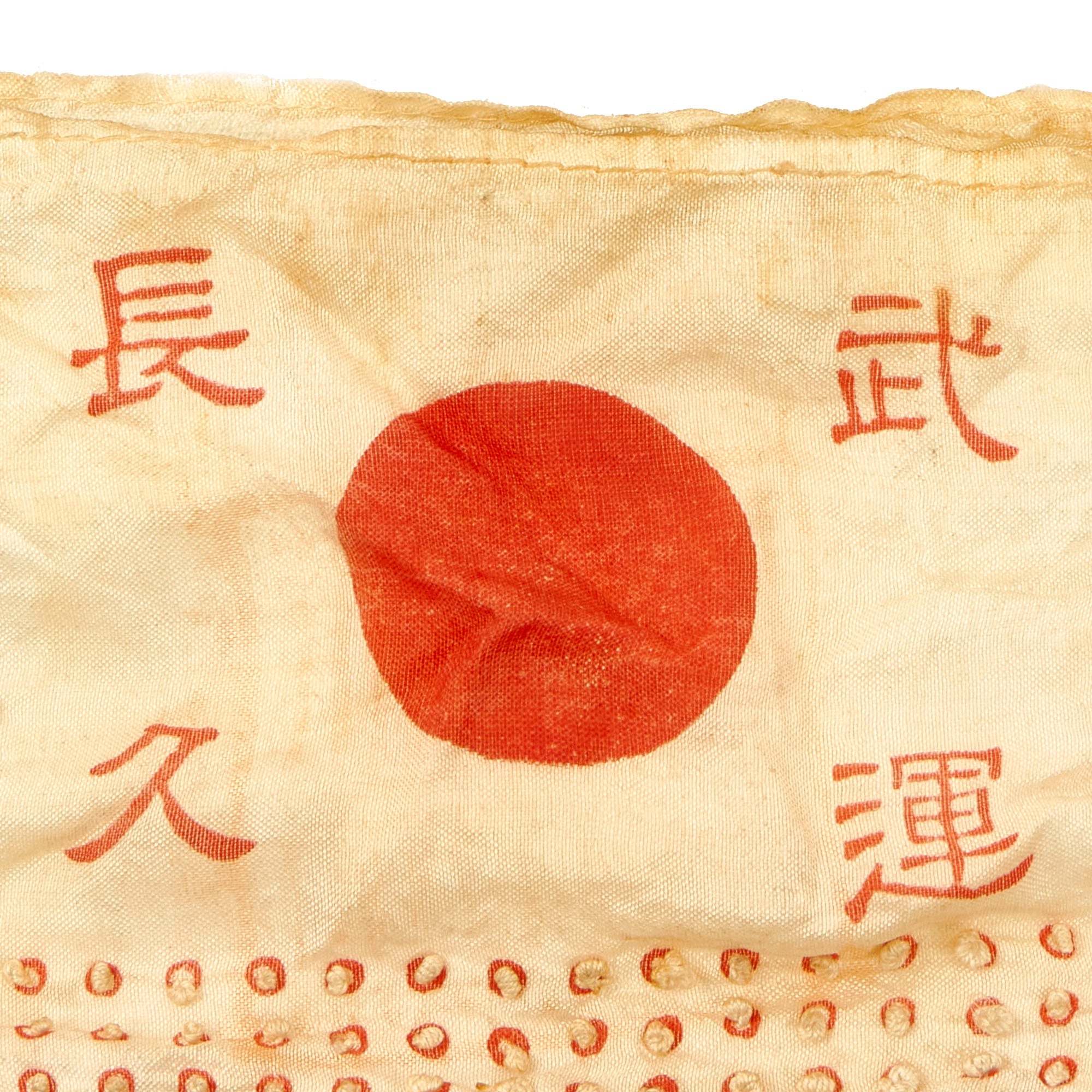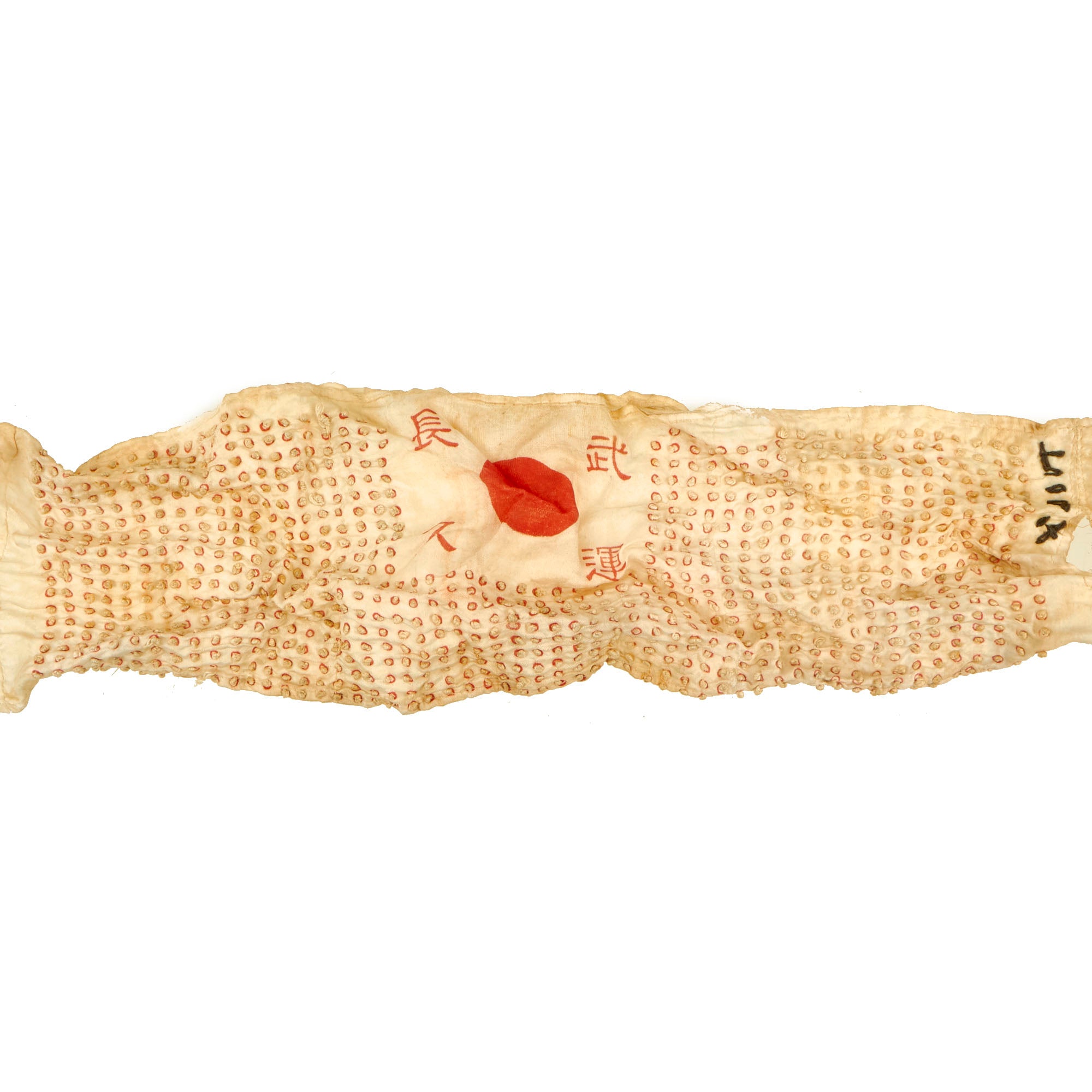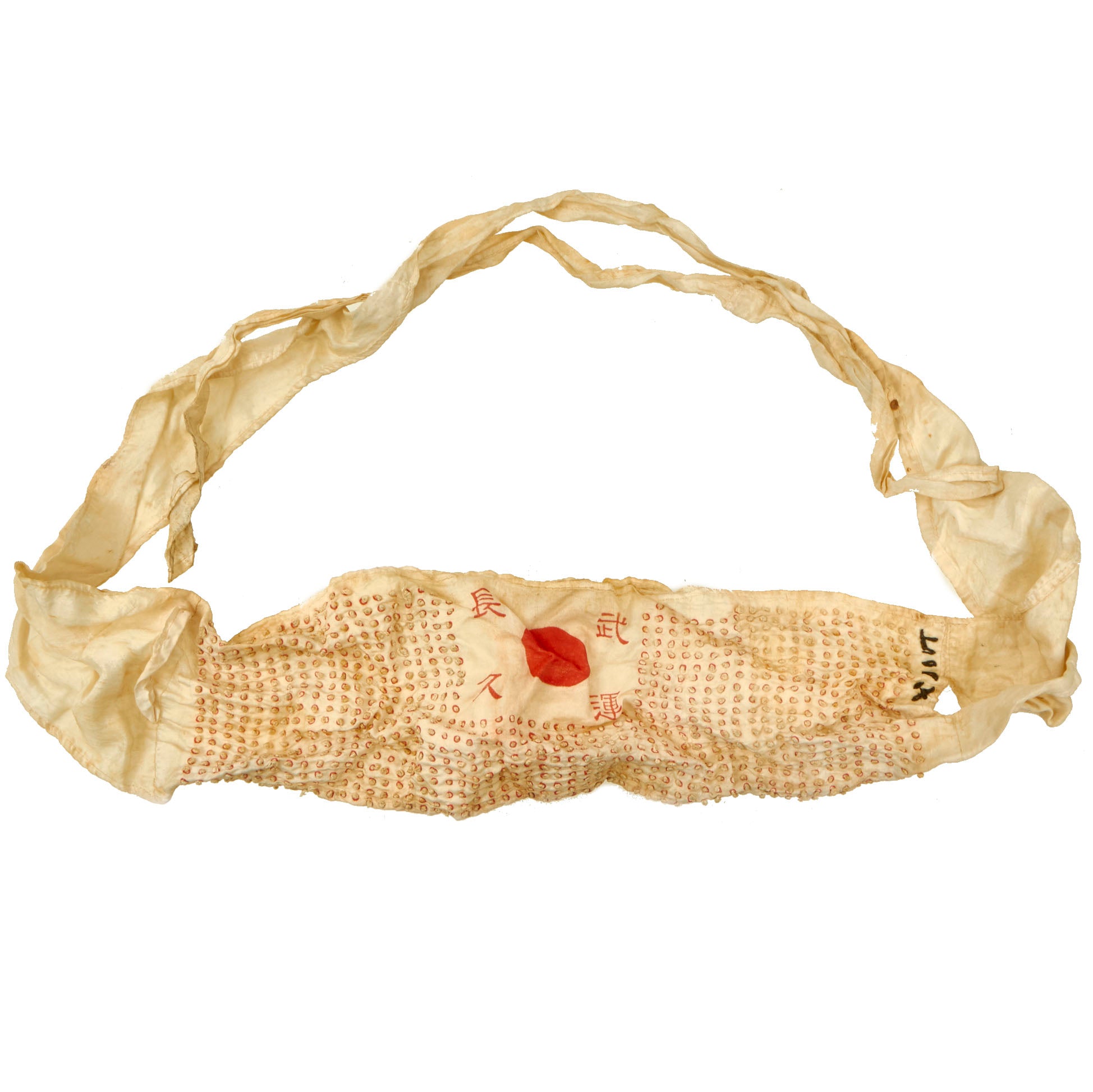 Original Item: One-of-a-kind. A Senninbari (千人針 thousand-person-stitches) or One-thousand stitch is a strip of cloth that measures approximately 15 cm (6 in) high and up to 90–120 cm (3–4 ft) or more in length. Each end of the belt (sash) may or may not have strings, snaps or buttons that allow it to be fastened about the waist. Examples that lack these were often tucked into the waist. Other variations were never worn but may have been folded and placed inside helmet liners, pockets or packs. Senninbari were decorated with 1000 knots or stitches, and each stitch was normally made by a different woman. Senninbari were given as an amulet by women to soldiers on their way to war as a part of the Shinto culture of Imperial Japan.