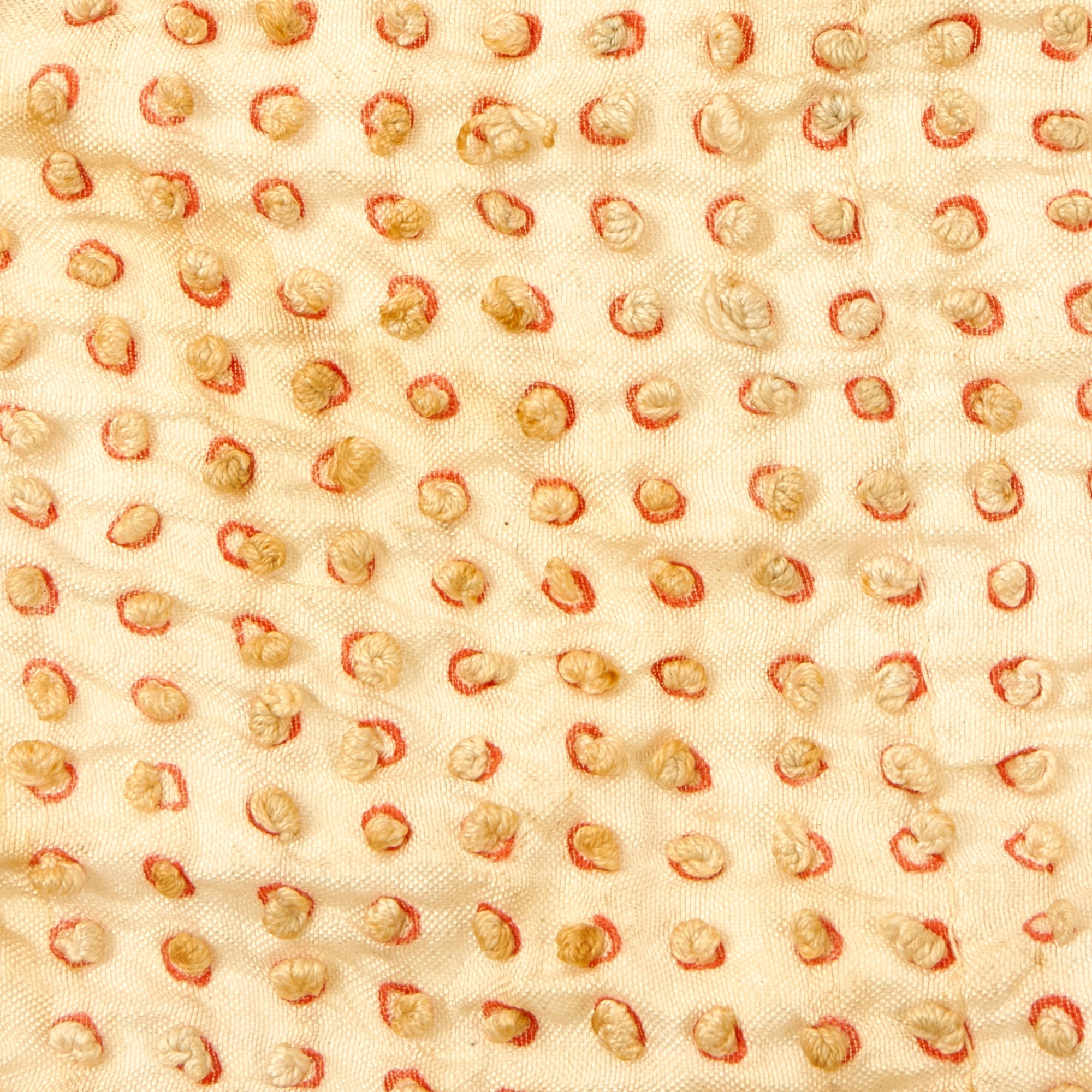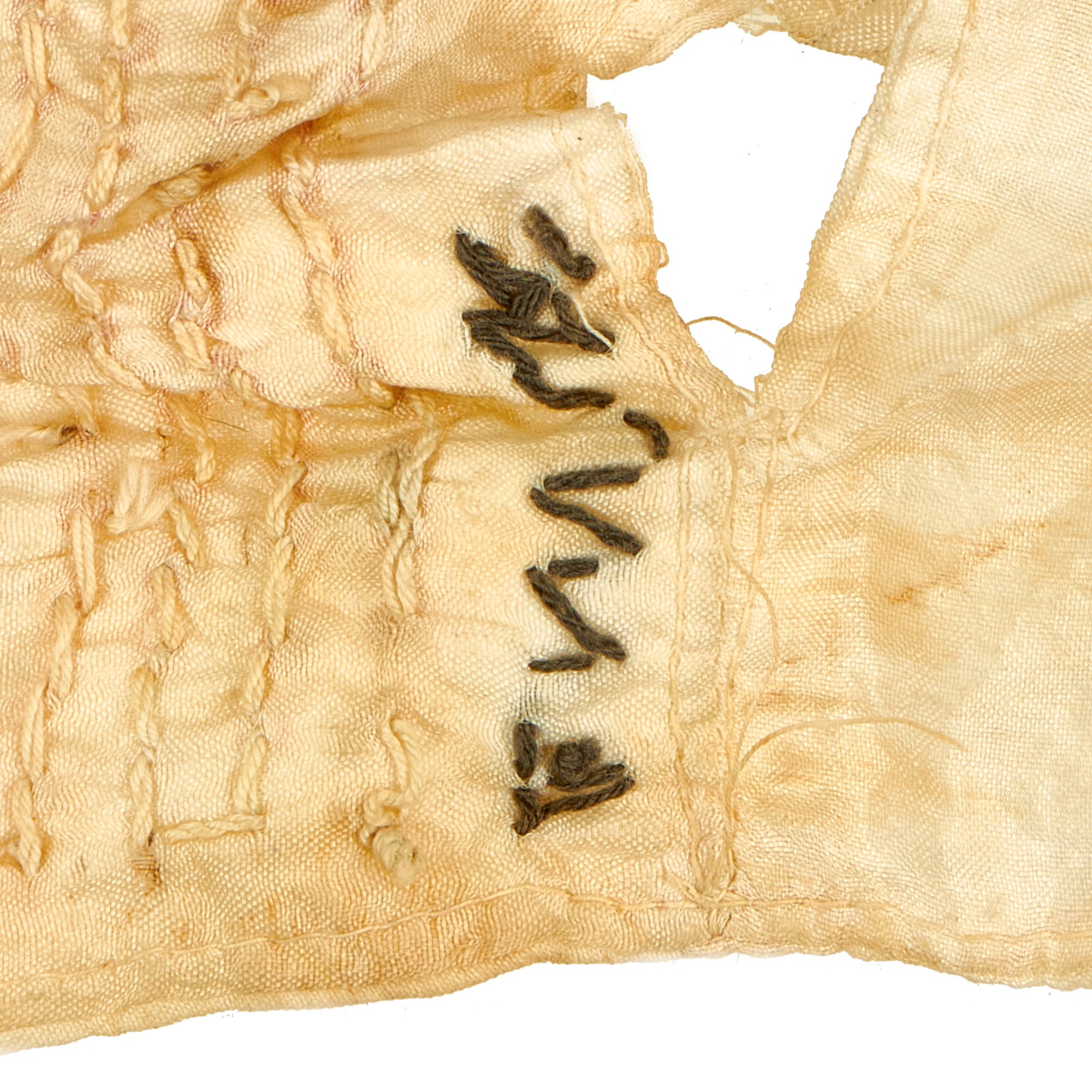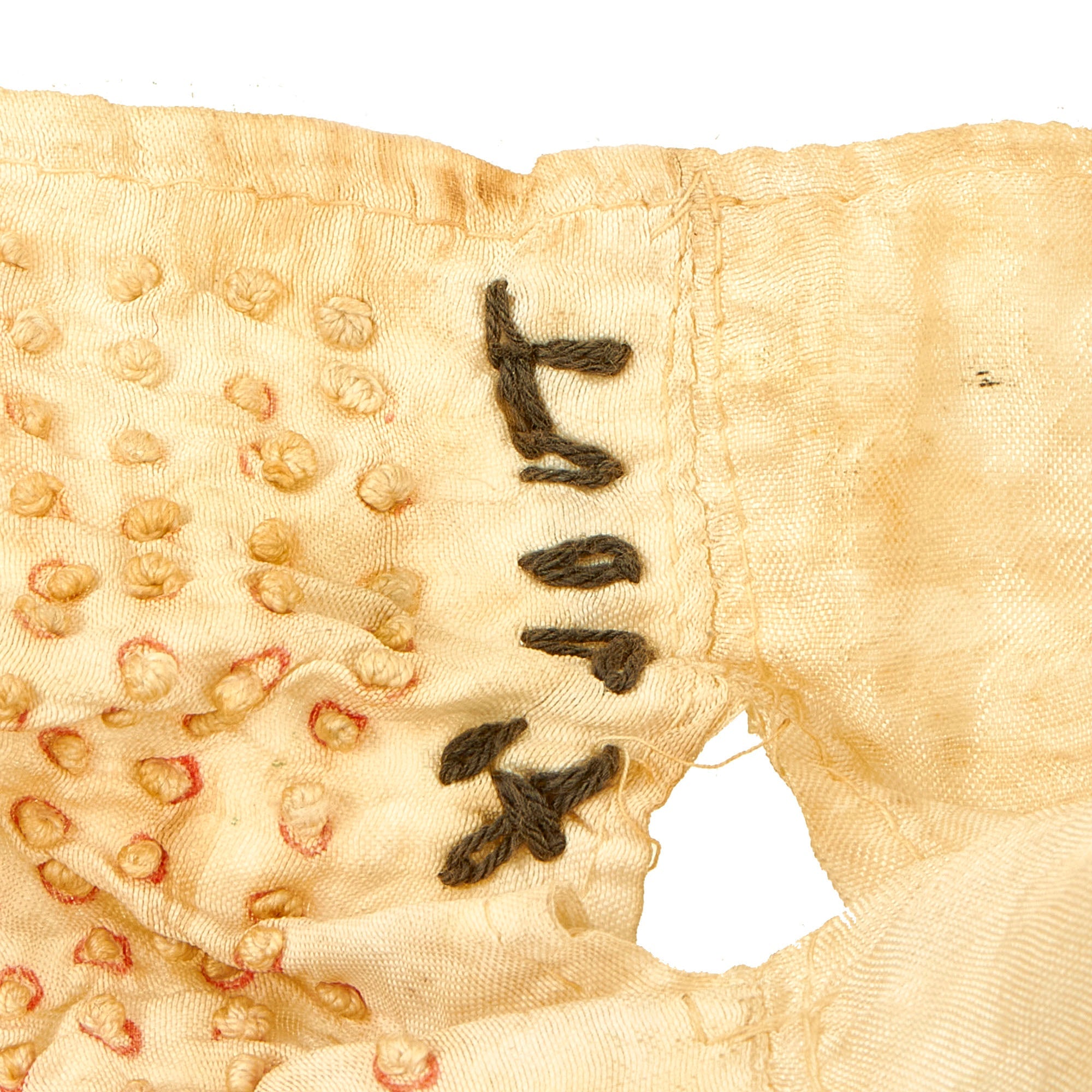 Original Item: One-of-a-kind. A Senninbari (千人針 thousand-person-stitches) or One-thousand stitch is a strip of cloth that measures approximately 15 cm (6 in) high and up to 90–120 cm (3–4 ft) or more in length. Each end of the belt (sash) may or may not have strings, snaps or buttons that allow it to be fastened about the waist. Examples that lack these were often tucked into the waist. Other variations were never worn but may have been folded and placed inside helmet liners, pockets or packs. Senninbari were decorated with 1000 knots or stitches, and each stitch was normally made by a different woman. Senninbari were given as an amulet by women to soldiers on their way to war as a part of the Shinto culture of Imperial Japan.