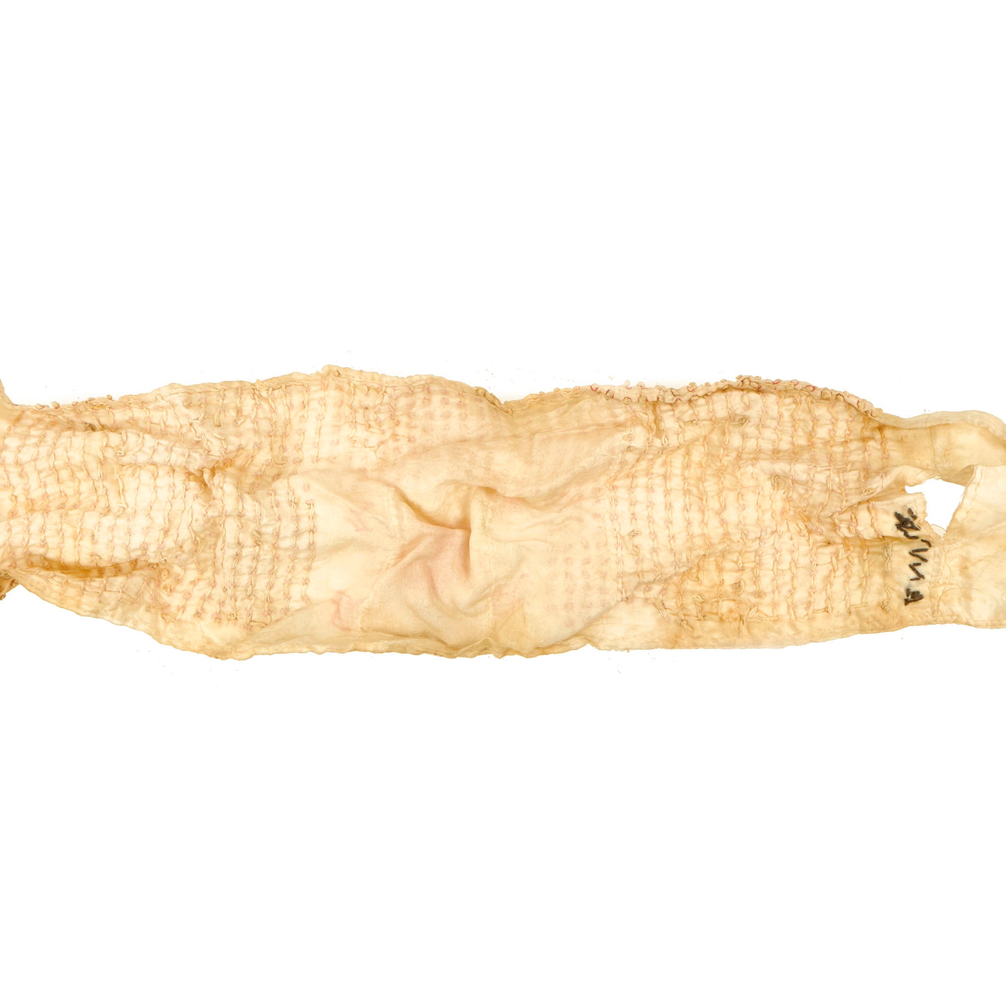 The belt appears to be made of linen cloth, and has been folded over and stitched together around an inner layer of padding. There are some small tears and staining, as well as overall age toning. However it still displays very nicely.