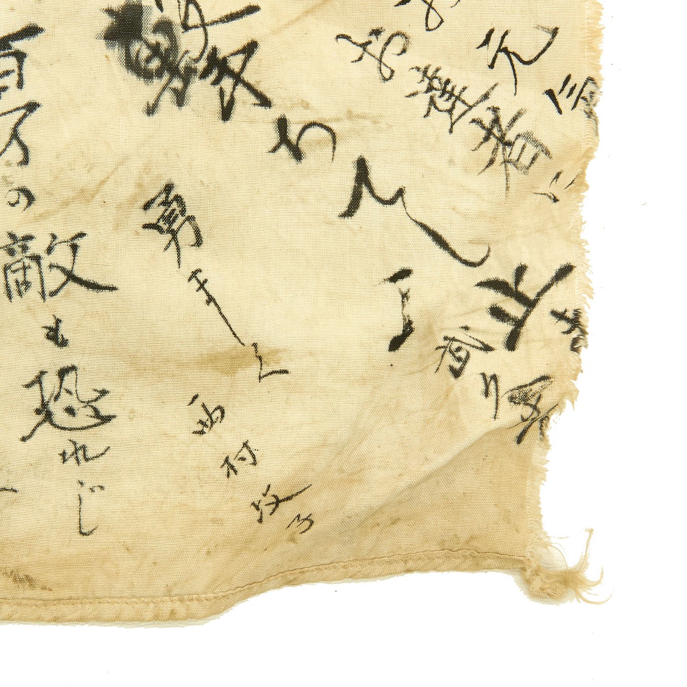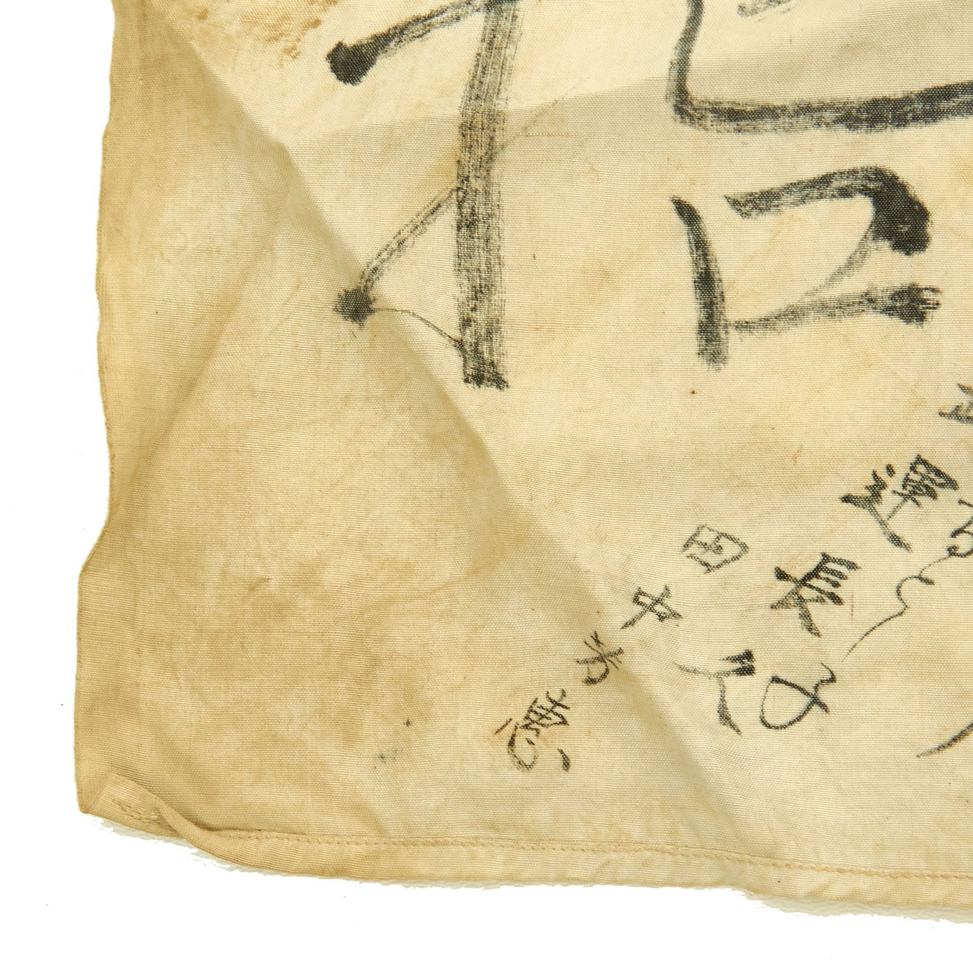 The Japanese call their country's flag hinomaru, which translates literally to "sun-round", referencing the red circle on a white field. When the hinomaru was signed, the Japanese characters were usually written vertically, and radiated outward from the edge of the red circle. This practice is referenced in the second term, yosegaki, meaning "sideways-writing". The phrase hinomaru-yosegaki can be interpreted as "To write sideways around the red sun", describing the appearance of the signed flag. This particular example completely unique is written in old KANJI the writing are mainly Japanese names of this soldier's family and friends with quotes and phrases.