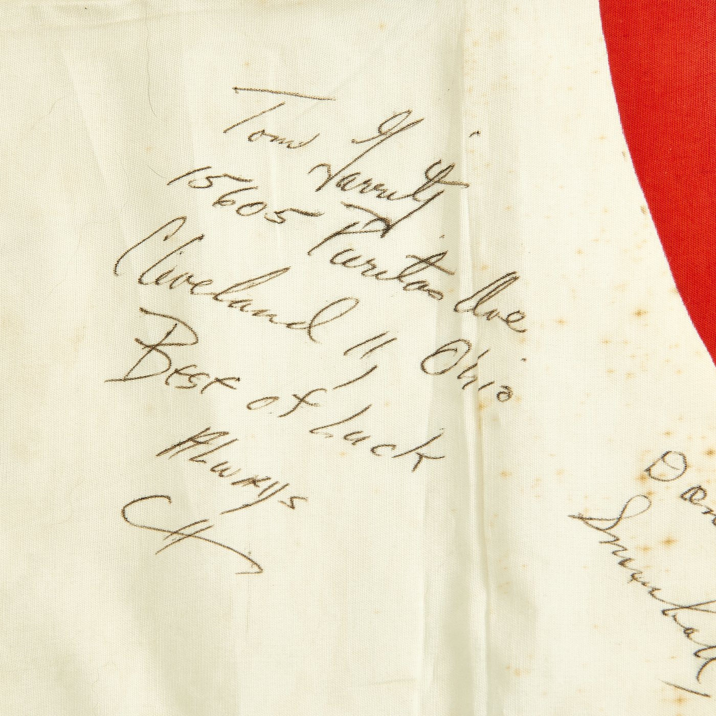Original Item: One-of-a-kind. Just purchased at a large military auction! This is a lovely USGI Bring Back from WWII: an original Japanese WWII "Meatball" National flag, signed by two GIs! The flag measures approximately 29" x 38", and is made from rayon, an early synthetic fabric made from wood fibers. The body of the flag is white, with a red "sun round" dyed into the middle. It has the correct leather corner reinforcements with two hanging ties each, and is in excellent condition.