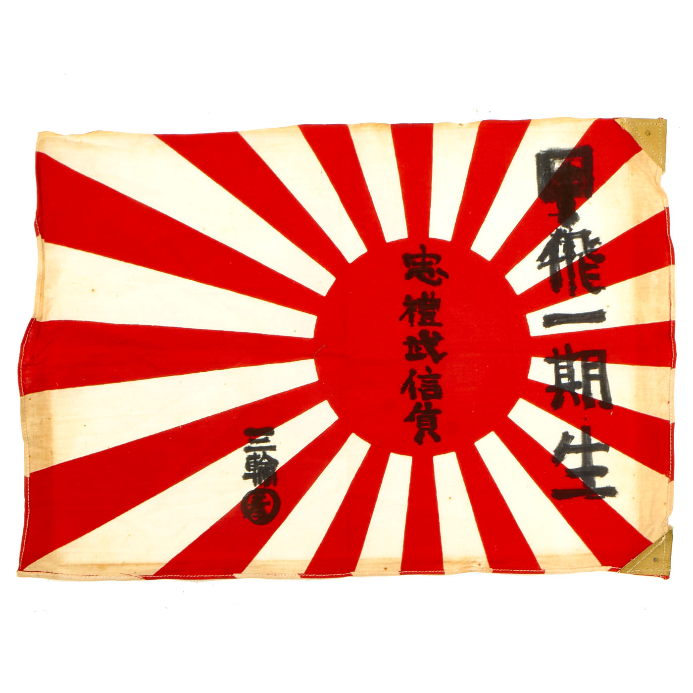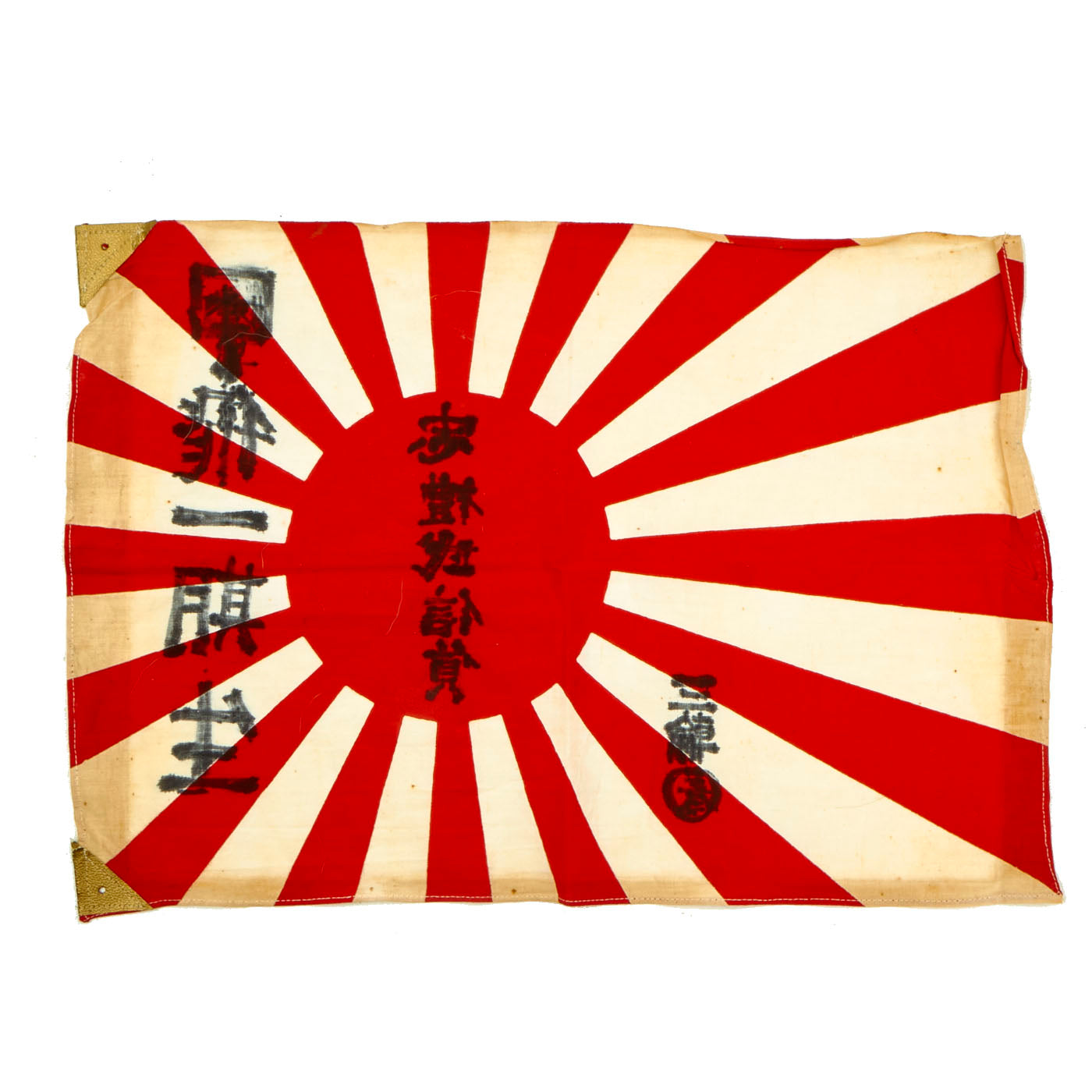 Original Item: Only One Available. The Rising Sun Flag (旭日旗 Kyokujitsu-ki) design was originally used by feudal warlords in Japan during the Edo period. On May 15, 1870, as a policy of the Meiji government, it was adopted as the war flag of the Imperial Japanese Army, and on October 7, 1889, it was adopted as the naval ensign of the Imperial Japanese Navy (Naval flags have the sun off center to the left). Neither of these flags are common on the market, but the Naval flag is especially rare.